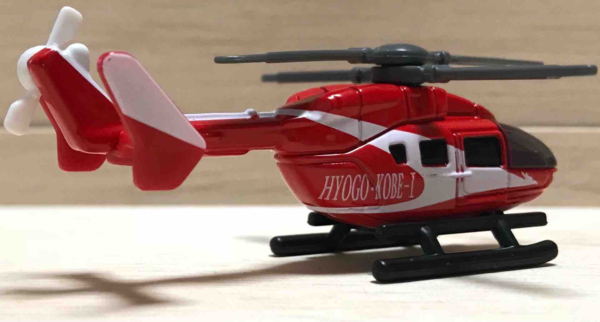 運転席以外の窓は黒塗りです。サイドには所属が書いてあります。兵庫県神戸市の消防防災ヘリコプターです。公式ホームページの画像では見にくく、実在するヘリコプターと知ったのは、このトミカを手にしてからです。