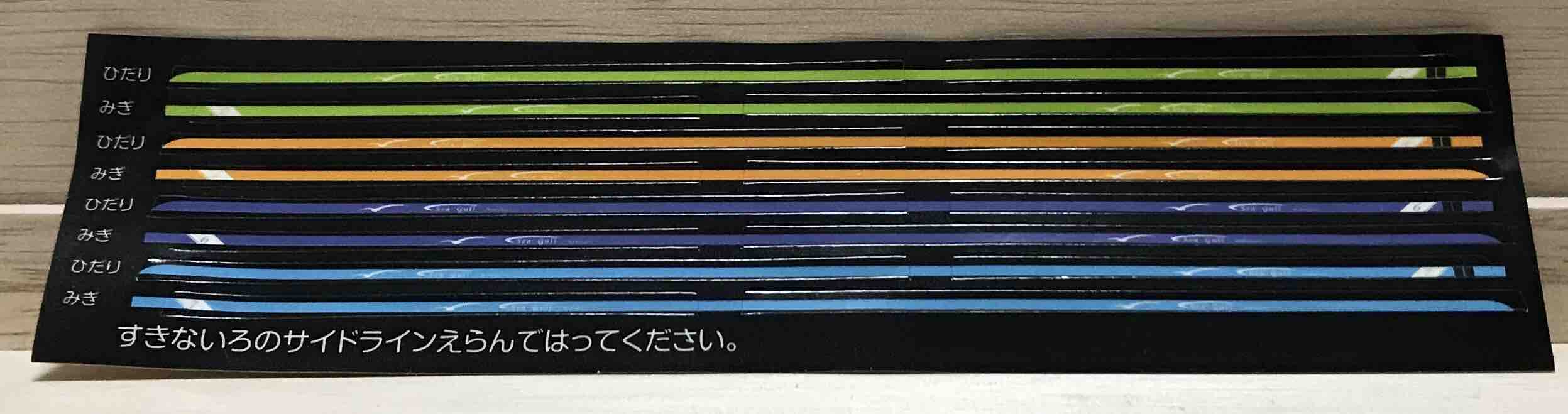 シールの種類はこんな感じ。4種類、グリーン、オレンジ、パープル、ブルーです。ブルーはボディーカラーに近い。