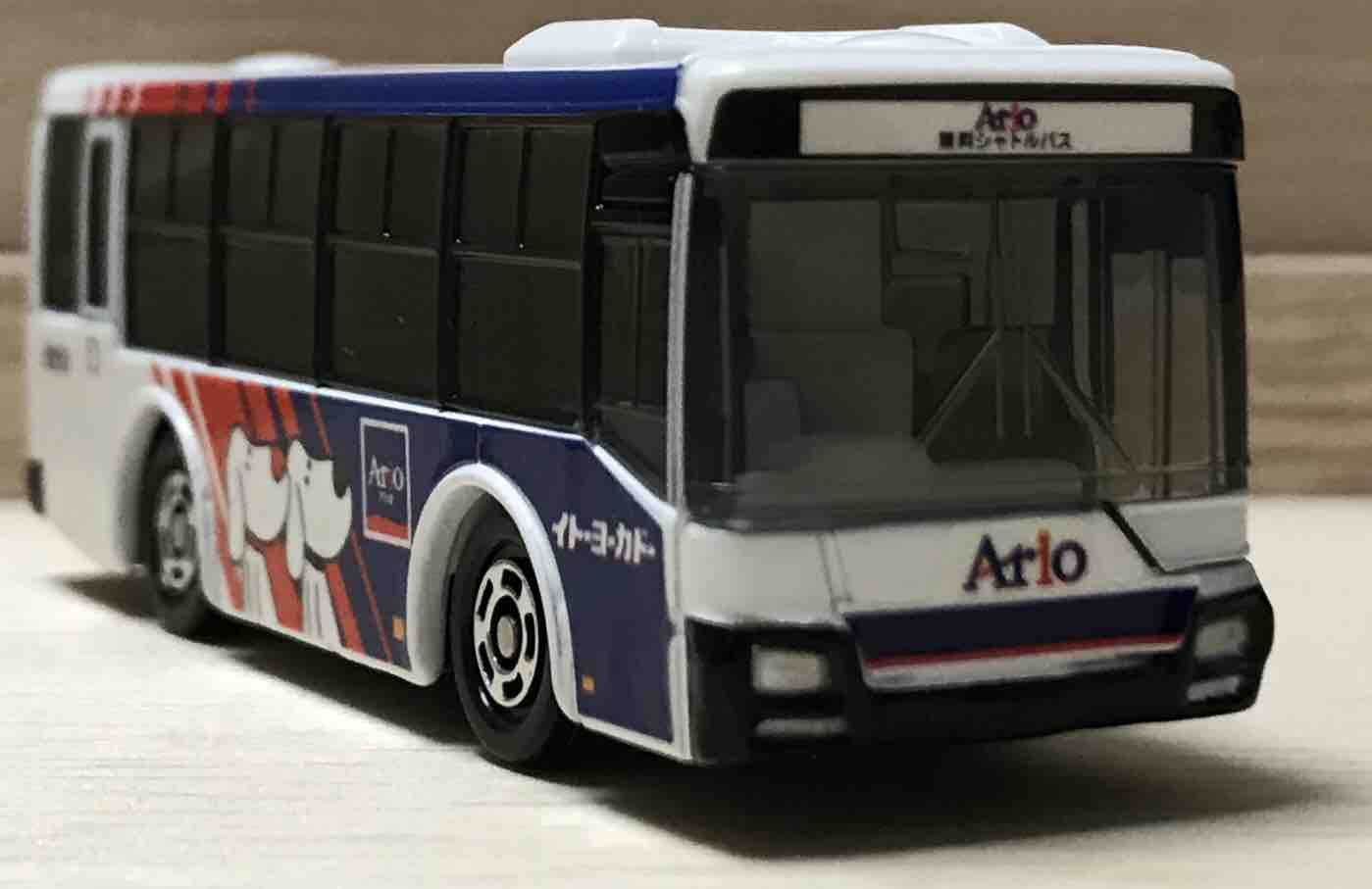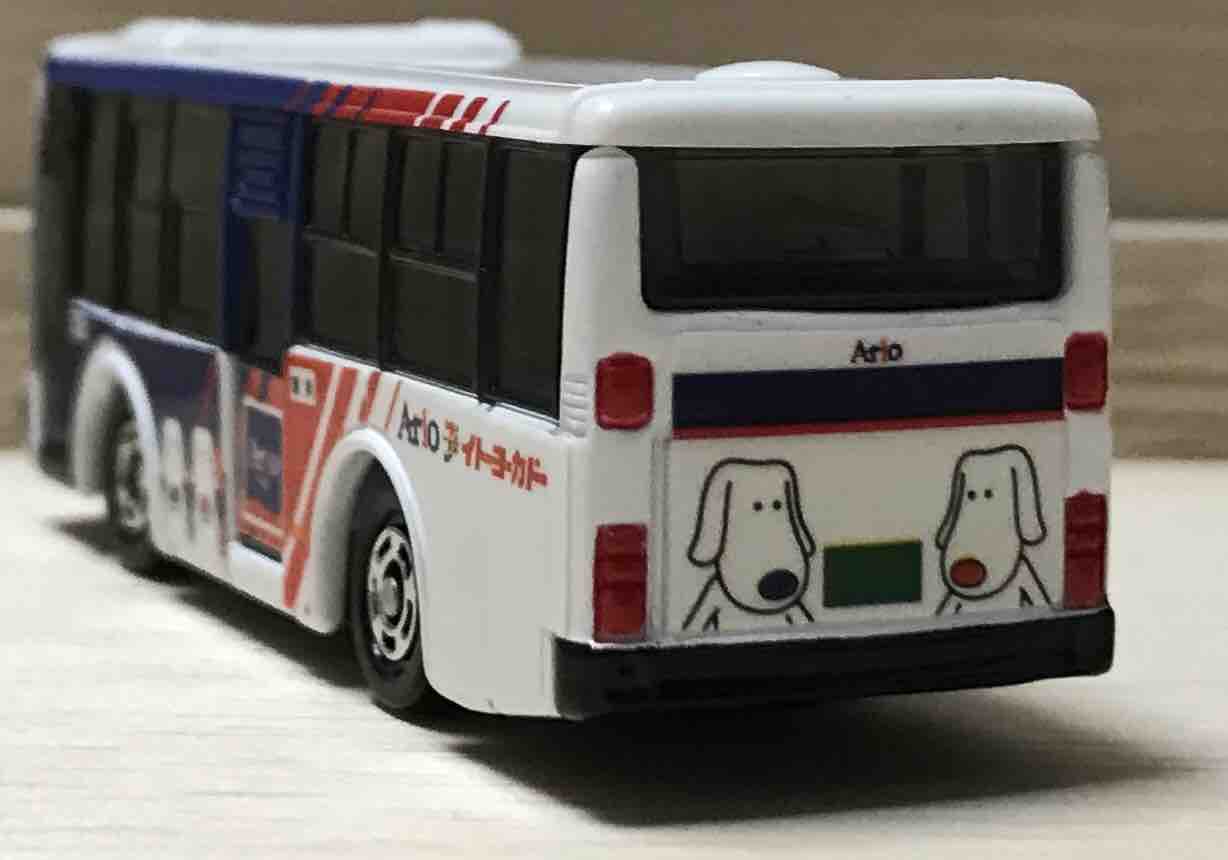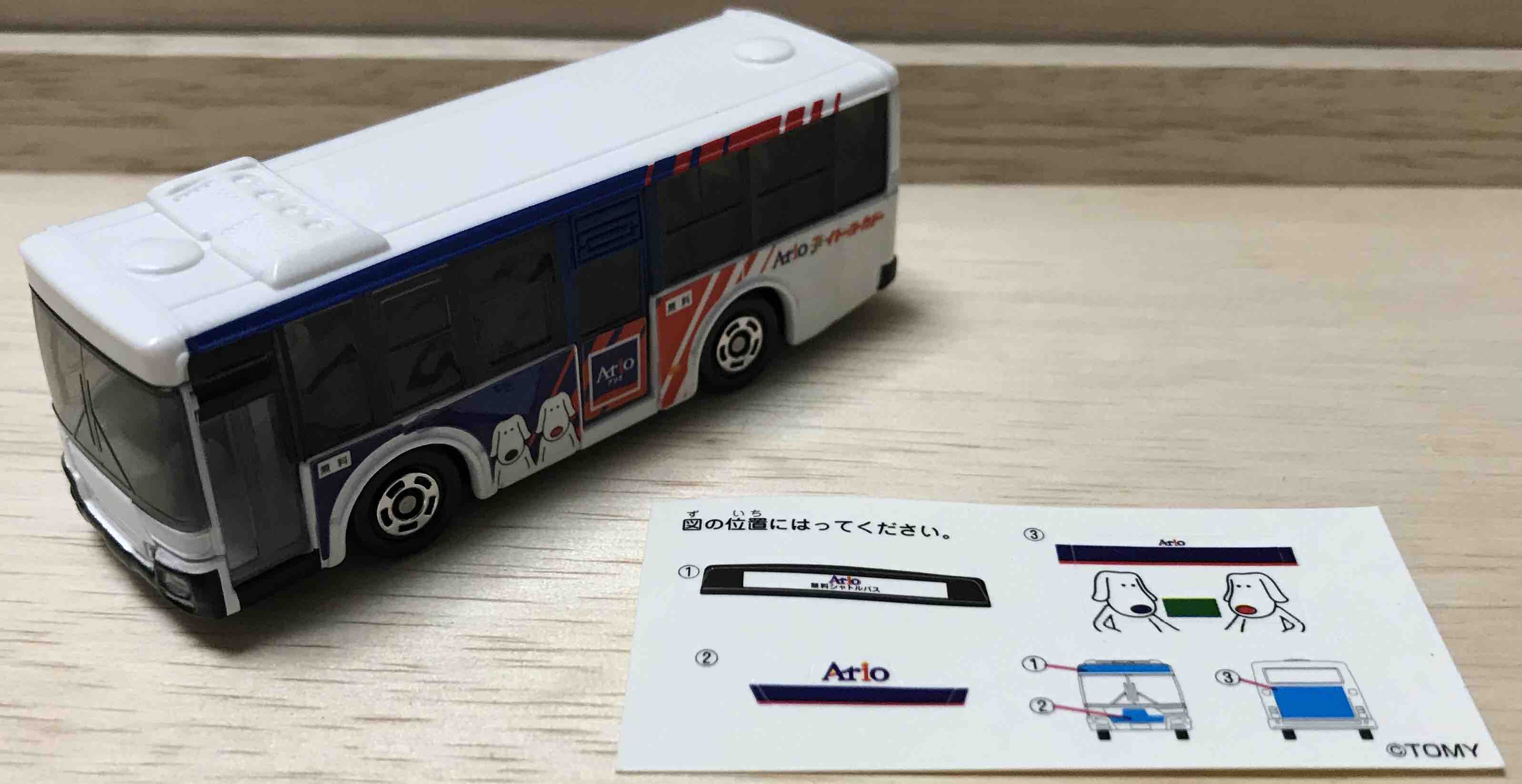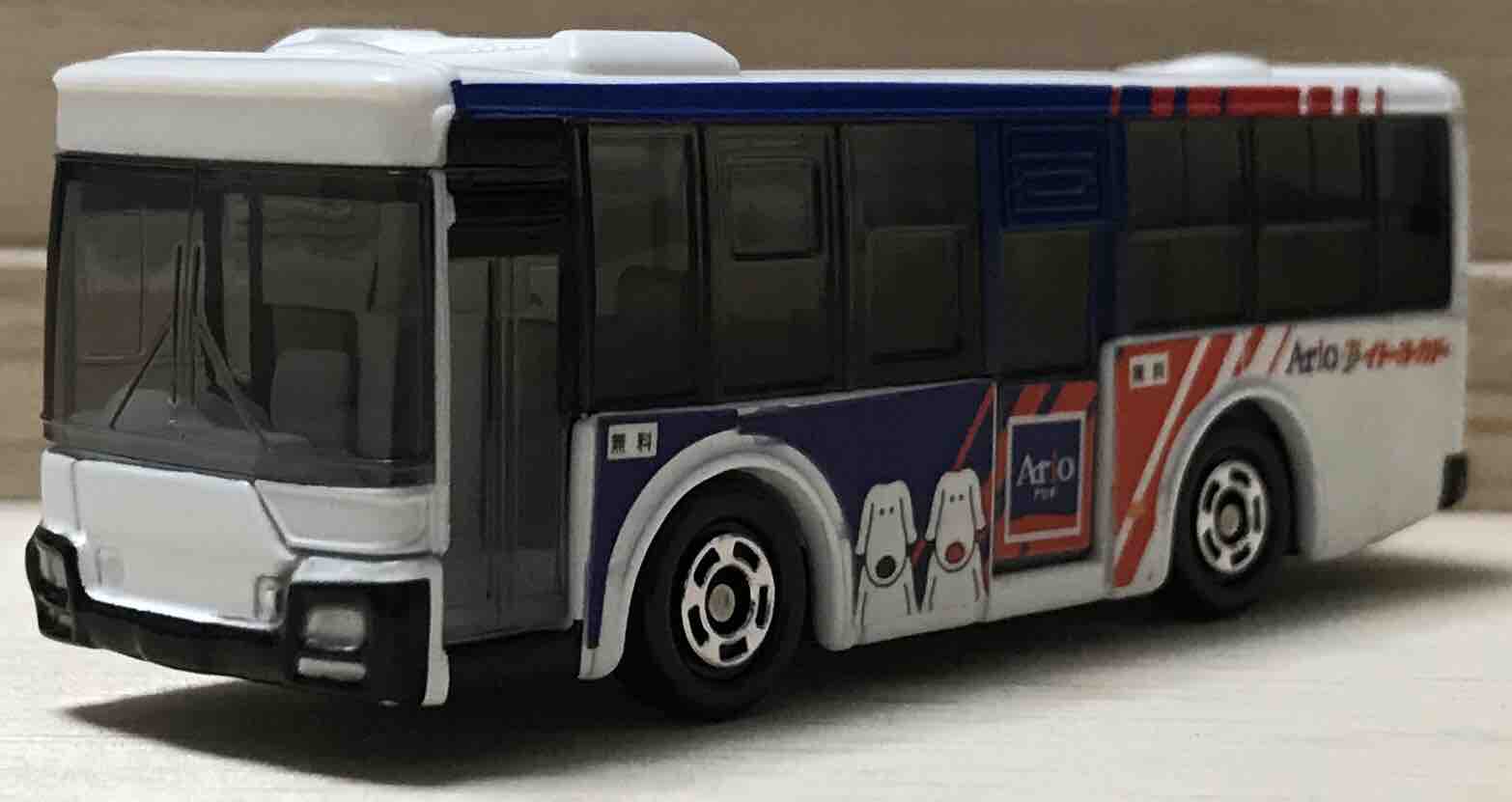 アリオのラッピングバスは、ジェイ・アール北海道バス(アリオ札幌)、東京都交通局(アリオ北砂)、深谷観光バス(アリオ深谷)など、実在はします。東京都交通局のはラッピングバスではありますが、無料のシャトルバスではありません。ですが、どのアリオもデザインは同じ。無料か有料かをしっかりと見極めないと危険かもしれません。このトミカは無料のシャトルバスを再現。