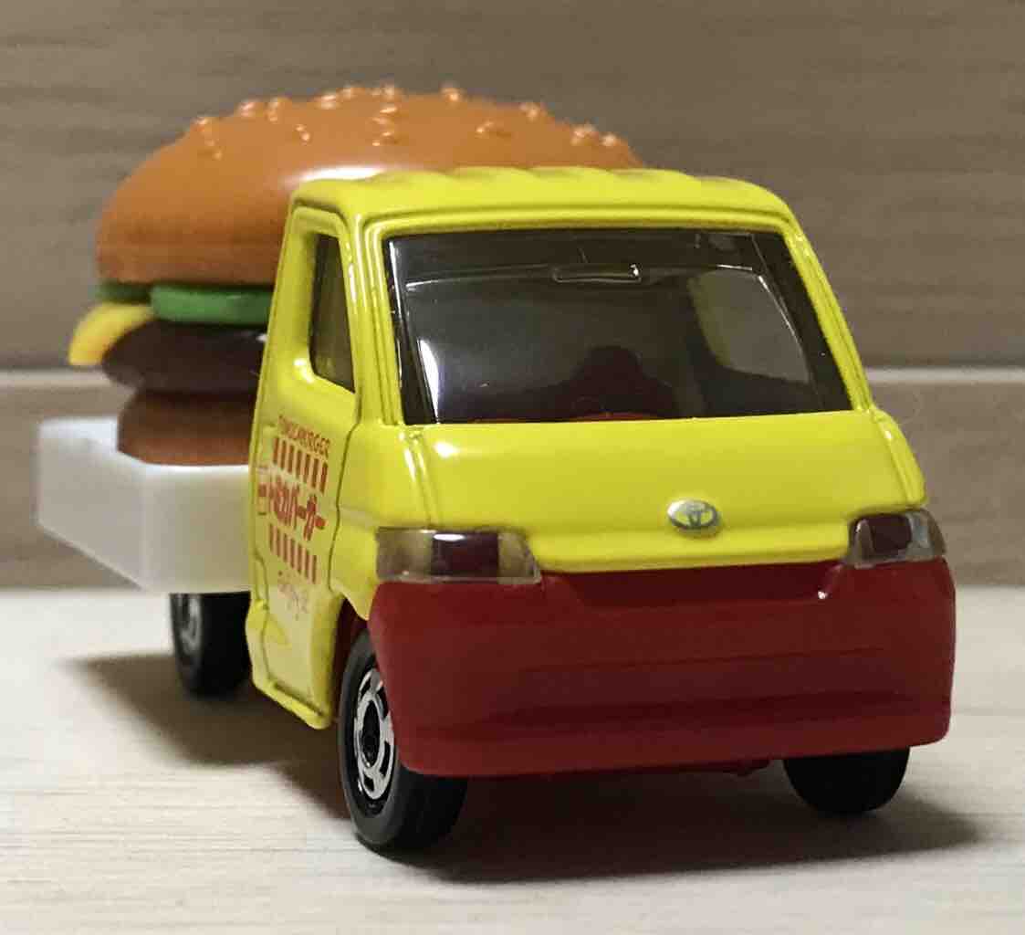 どんっ!ハンバーガーが乗っています。移動販売車ではなく、そのままハンバーガーを載せちゃえという発想。面白いトミカです。
