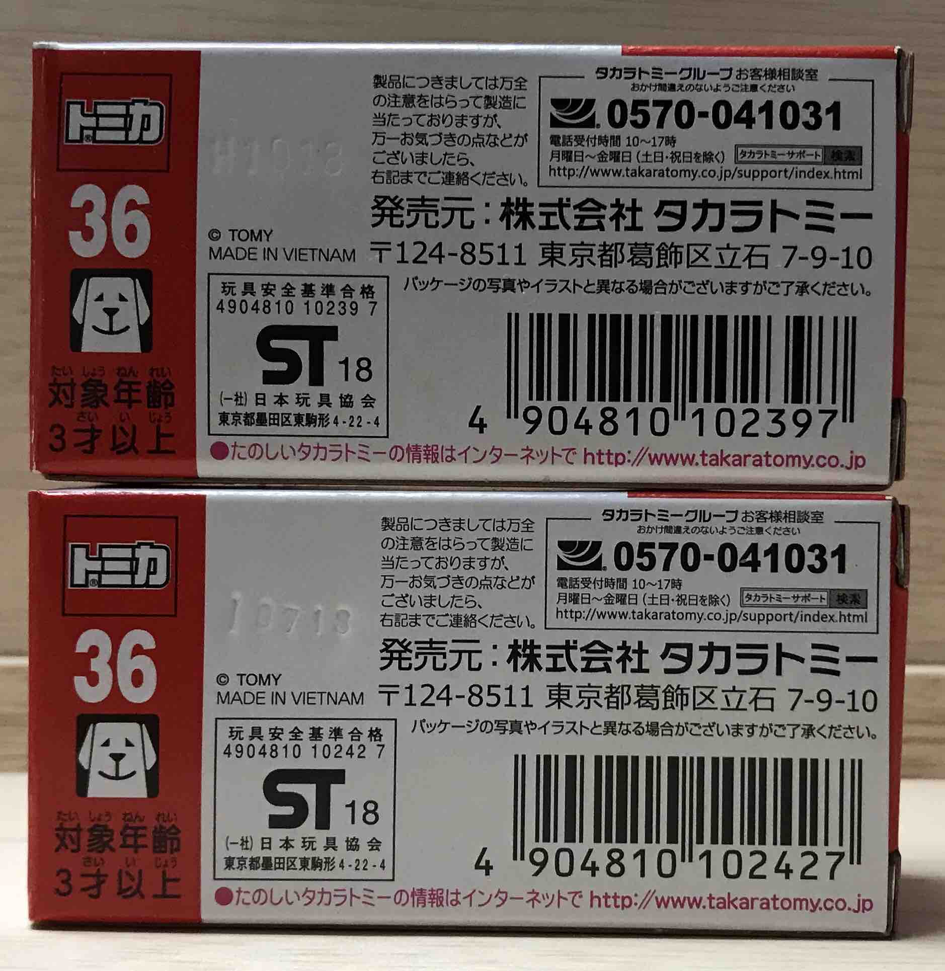 下が初回仕様の箱。製造番号 I0718 です。2018年9月7日に製造されているという意味です。上の通常仕様は、H1018で、2018年8月10日製造。1か月も製造に差があります。本当に初回生産分ではないということです。初回生産分でなくなったのに、発売してくれたタカラトミー社には感謝です。
