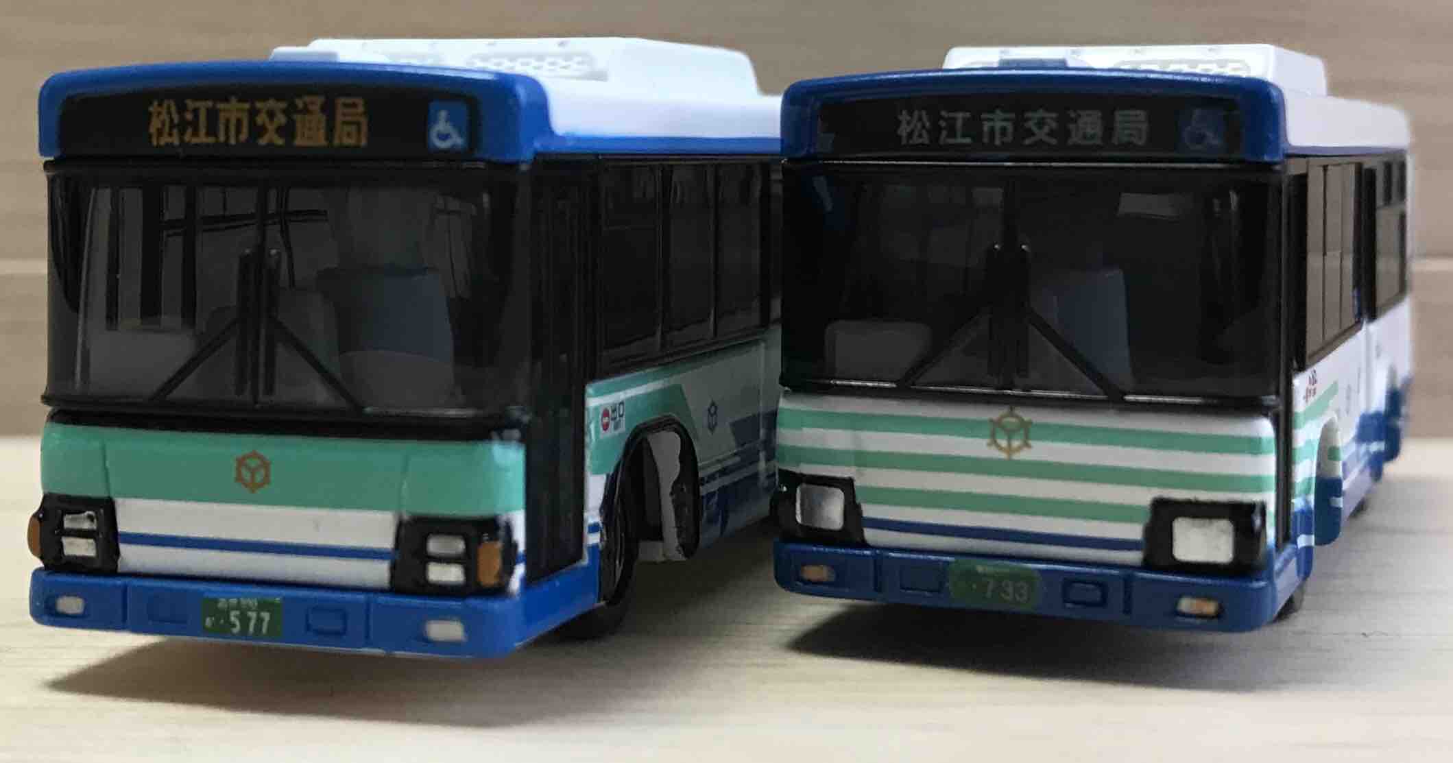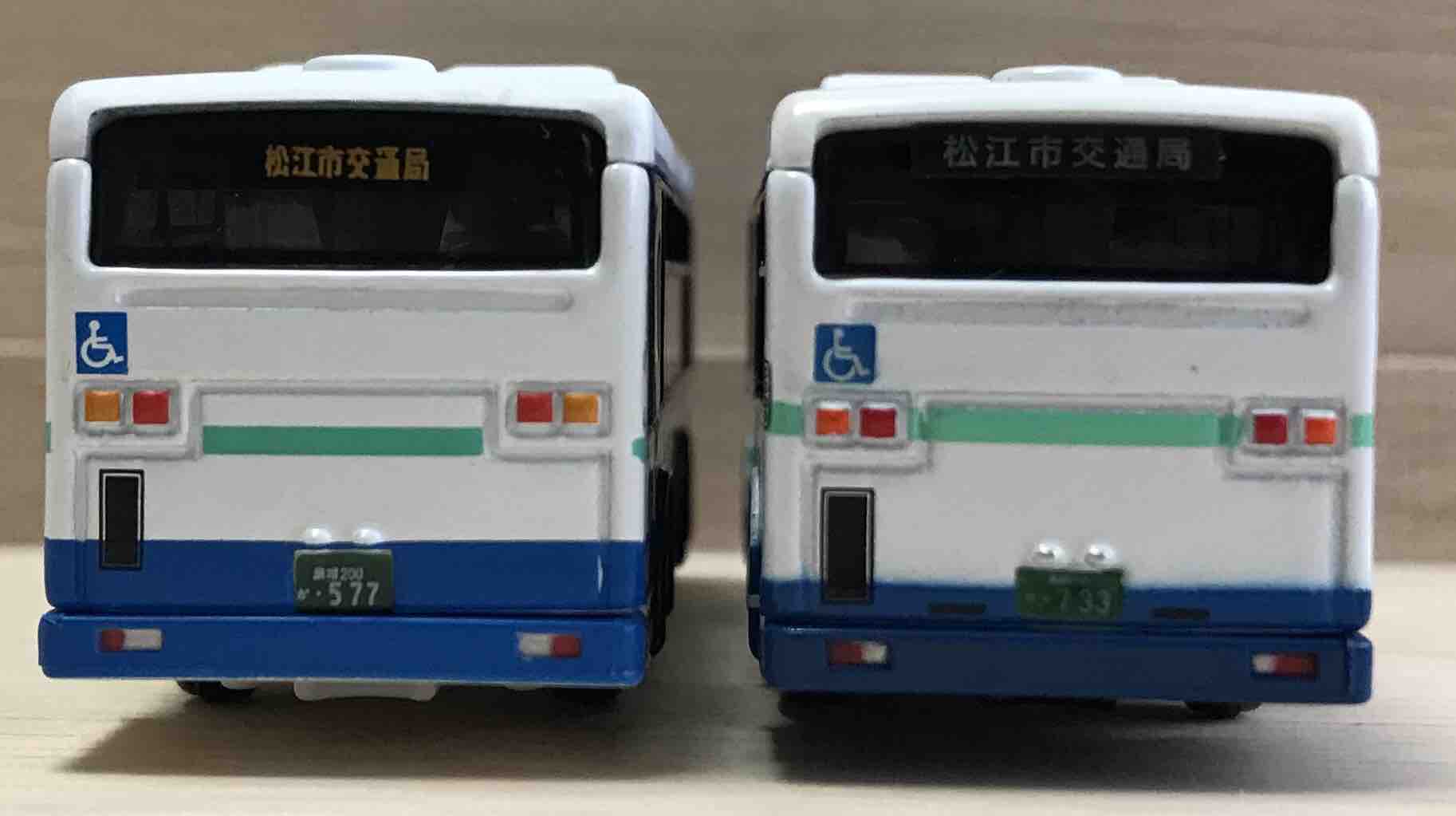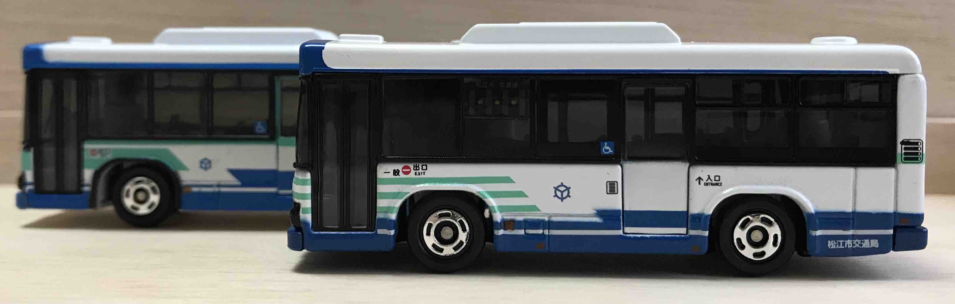 2016年発売 松江市交通局特注トミカ 第1弾のいすゞエルガ旧標準塗装モデル(http://www.86taro.com/archives/11670813.html)と並べて。