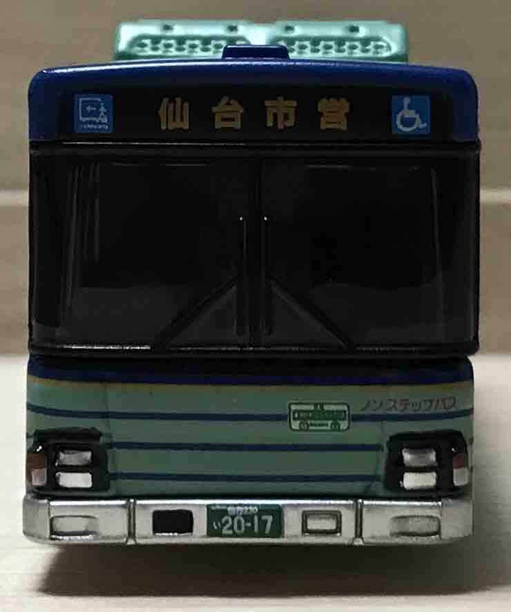 仙台230 い20-17号車がベース。この頃はまだナンバープレートは印刷。金型もエルガのヘッドライトである角形2灯に合わせられたものでした。