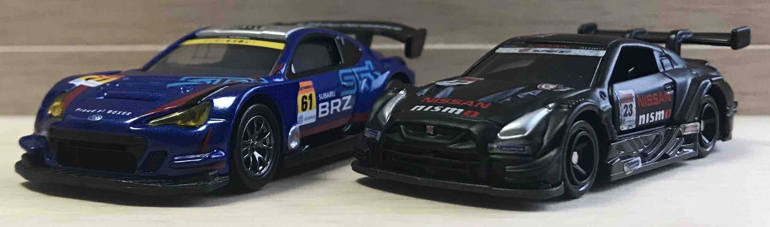 スーパーGTのマシン2台。左はGT300のスバルBRZ。