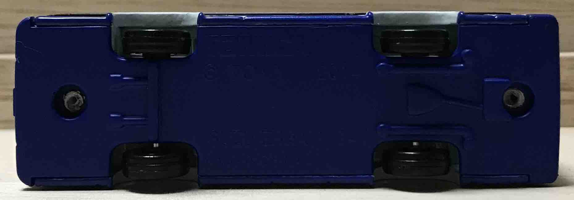 リア。少し初期不良なのか左に傾いてしまっている個体ですが、乗降中と思えば問題はありません。バスが傾いているところが再現されている!とポジティブに捉えています(笑) 本当は買ったときにタカラトミー社のお客様センターに問い合わせれば、取り替えてくれたかもしれませんが、このトミカのその先の運命を考えると、どうしてもそれはできないのです… トミカを愛しすぎてしまうと、このレベルになるので、気をつけてください。