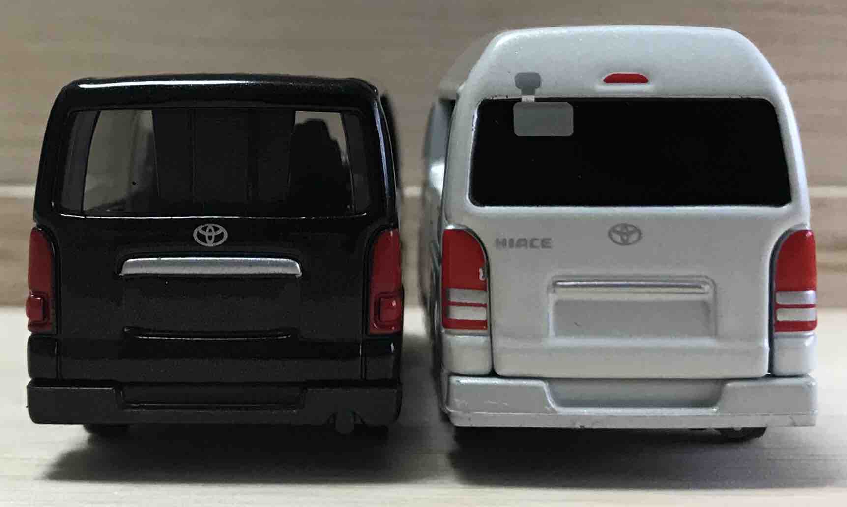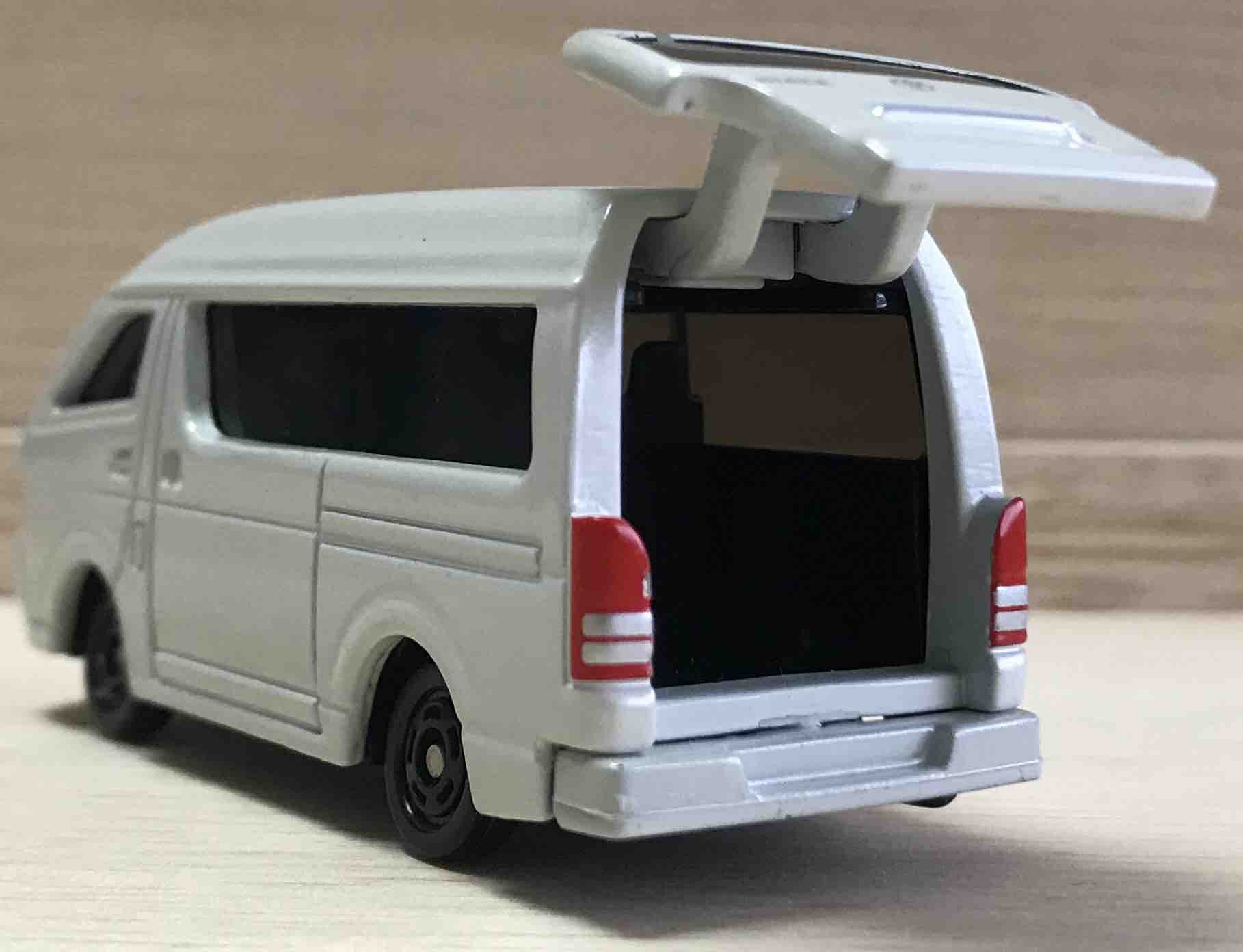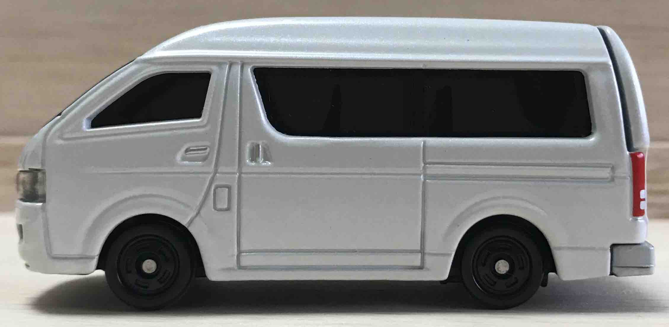 ノーマル?カスタムモデル?窓が黒く、スモークが再現されているようなので、少しカスタムされたモデルのハイエース。トミカでカスタムされたこの型のハイエースが発売されるのは初。カスタムされたモデルがトミカになること自体、なかなかレアです。