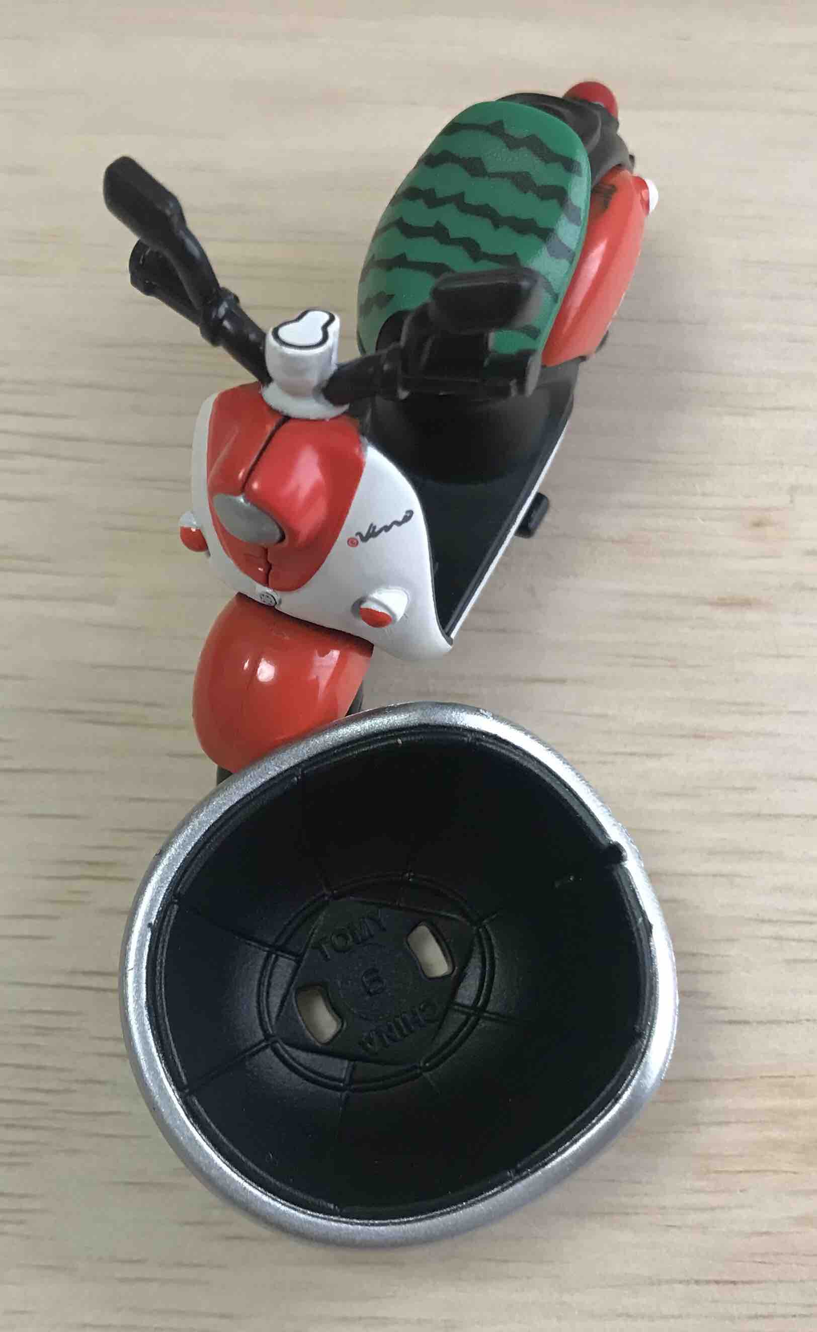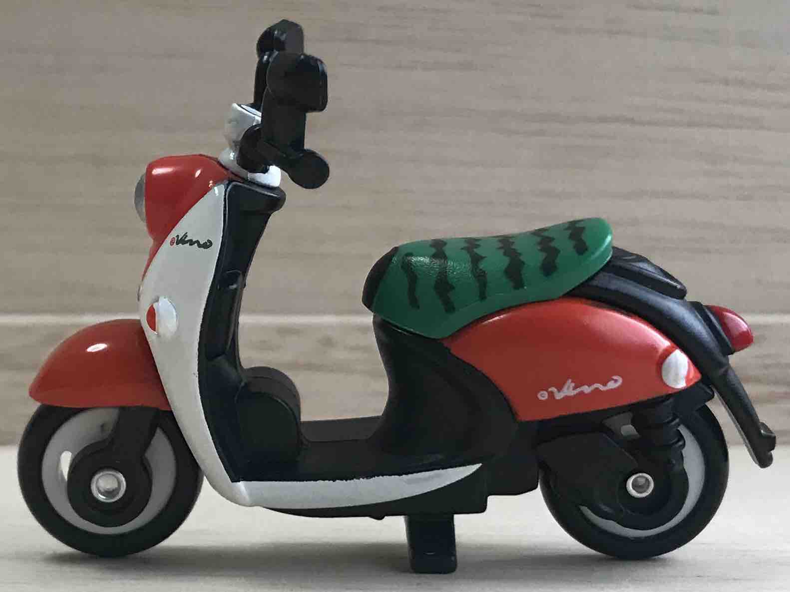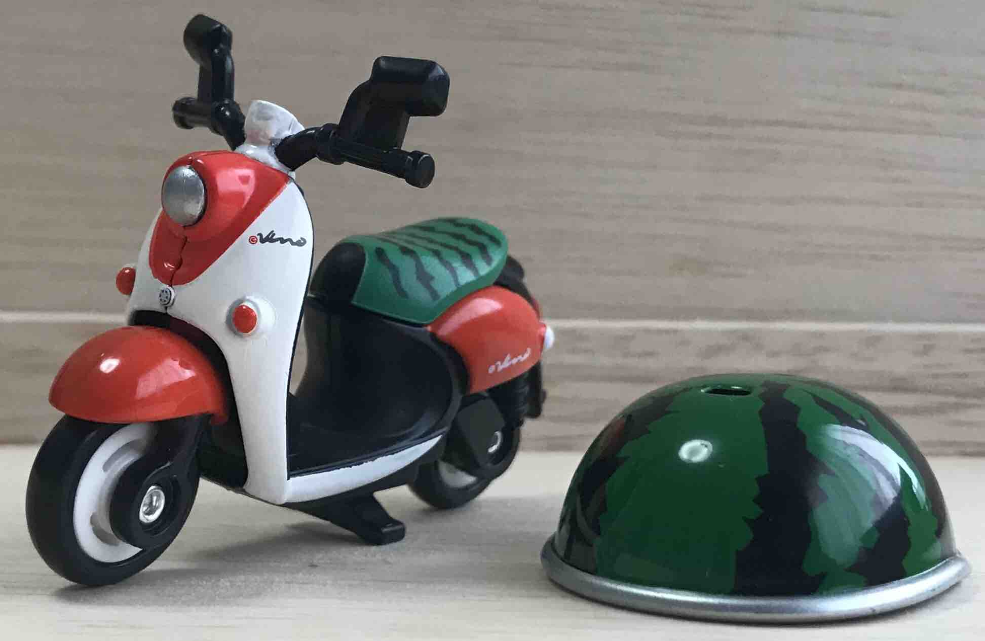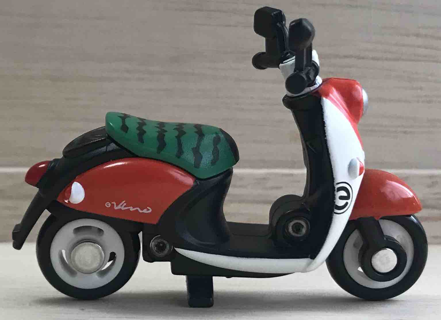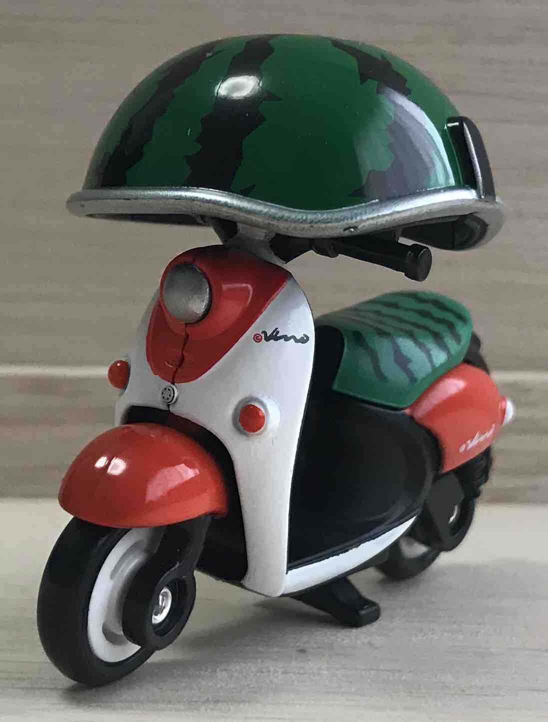 番組特注のものはこのスイカ柄のシートカバー。ヤマハ発動機が番組にプレゼントしたもののようです。2017年11月18日放送回から使用されています。これが「出川哲朗の充電させてもらえませんか?」のトミカである証です。