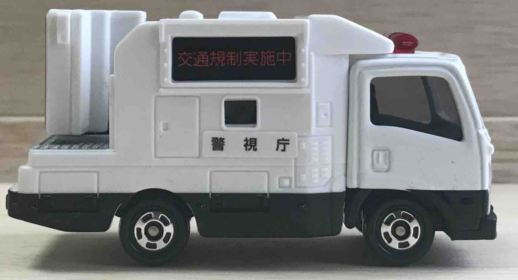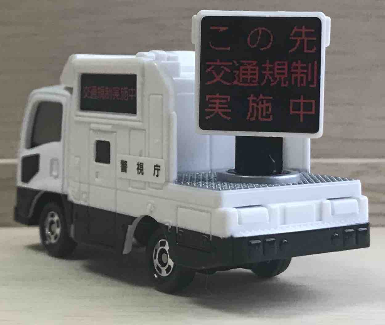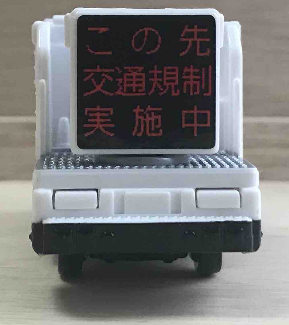 はい、お待ちかねの電光掲示板。表示は「この先交通規制実施中」という注意喚起。LEDのドットが再現されているのが細かい。テールランプの彩色はありませんが、ランプ自体はボディーに再現されています。
