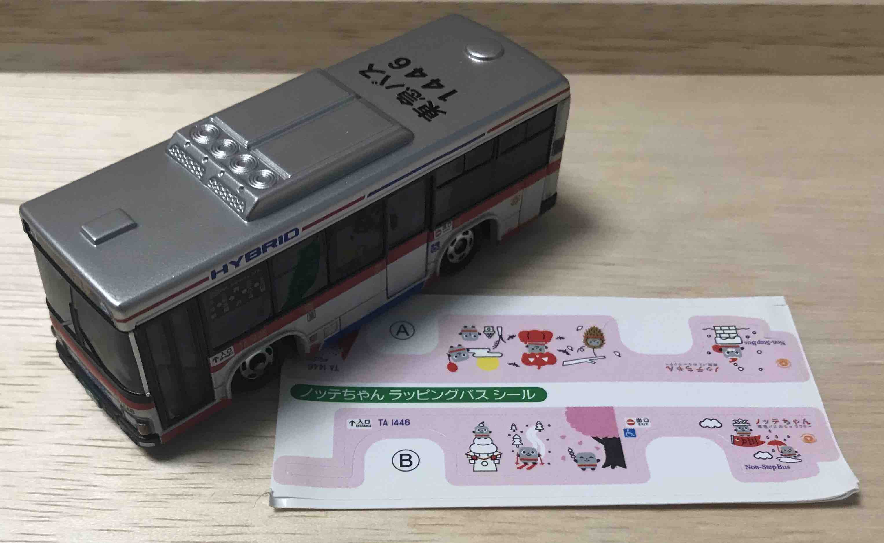 東急バスのキャラクター「ノッテちゃん」にラッピングできるシール付きでした。実車がノッテちゃんラッピング仕様なので、これも実車に基づくもの。悩みに悩み貼りませんでしたが、5月に東急バスの新しい特注トミカが出るので、買えたら貼ろうかなと思います。