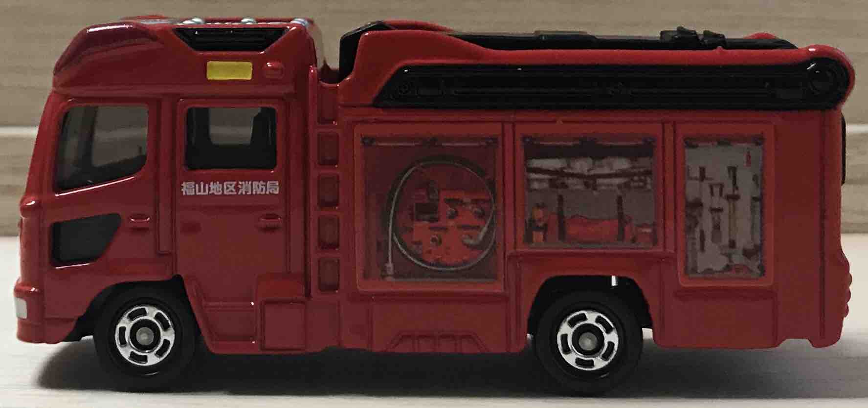 左側面は消防車の内部。ポンプはもちろん、様々な消化活動に必要な装備が積み込まれていますね。