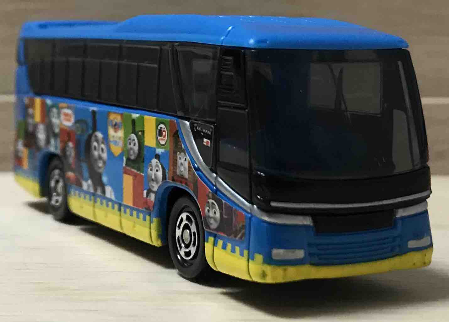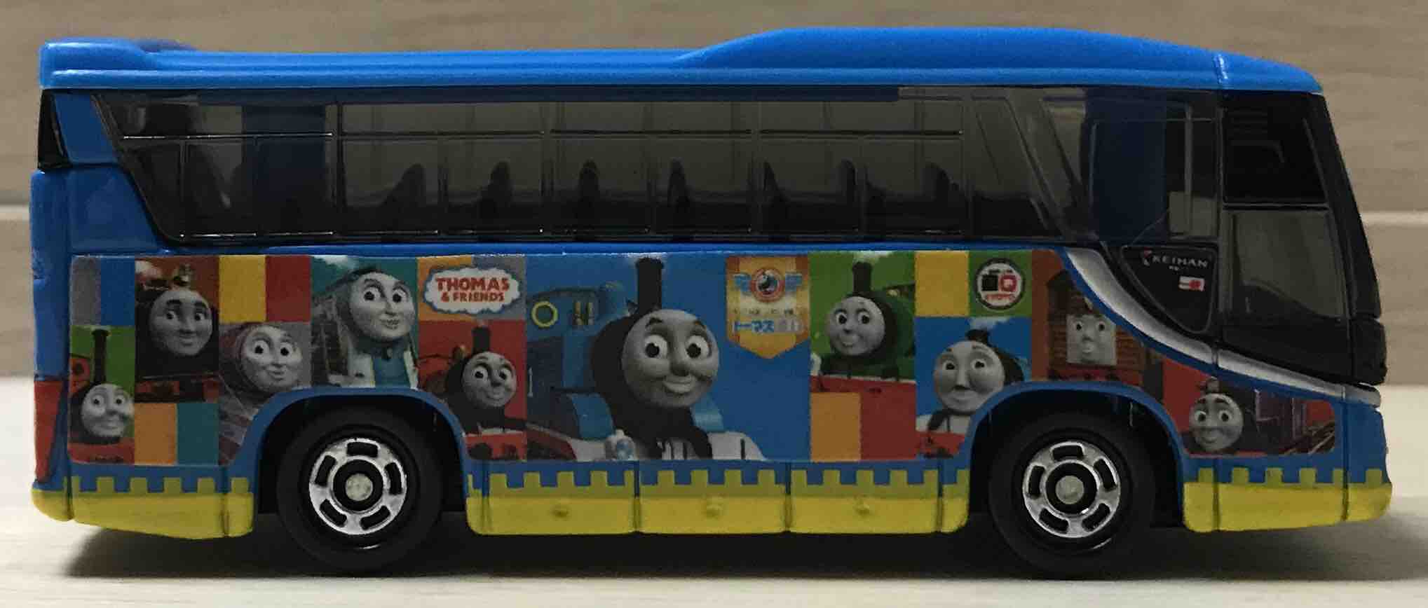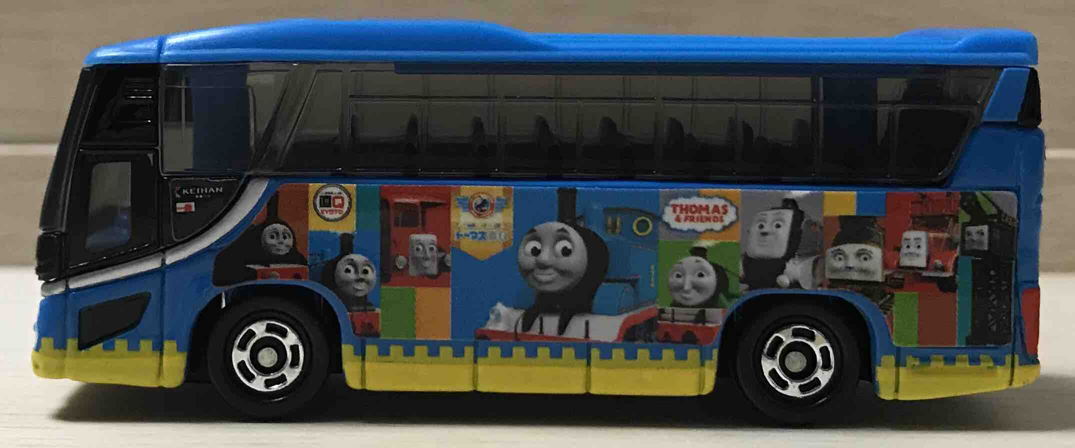 ベースは日野セレガ。トミカの商品名は、"京阪バス トーマス直Q"ですが、実際には"京阪バス ダイレクトエクスプレス直Q京都号「トーマス直Q」"といいます。 簡単に解説すると、ダイレクトエクスプレス直Q京都号というバス路線があり、その路線のトーマスラッピング仕様のバスという感じ。