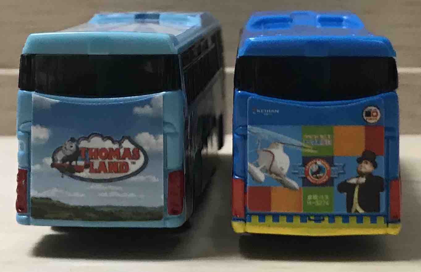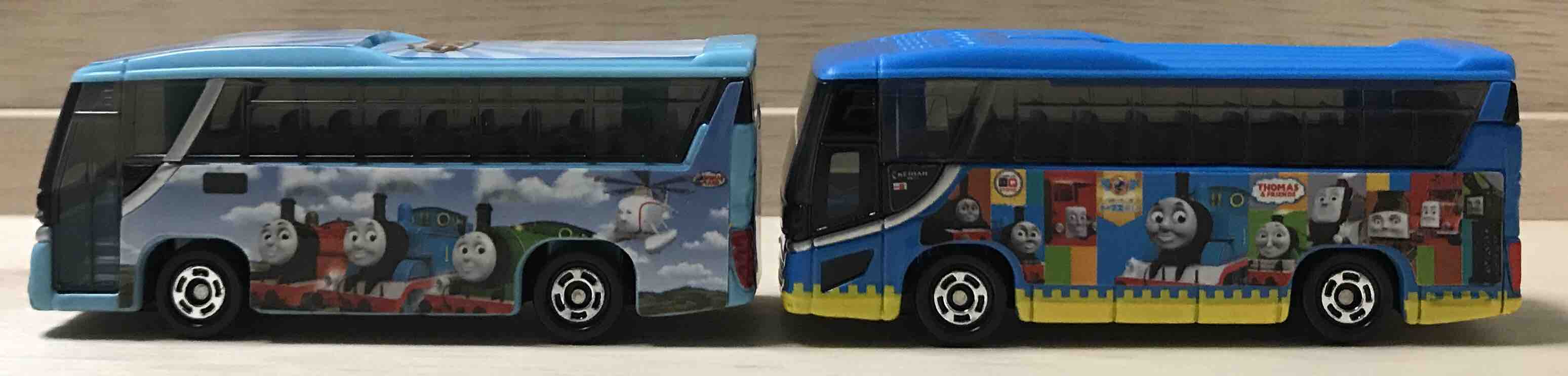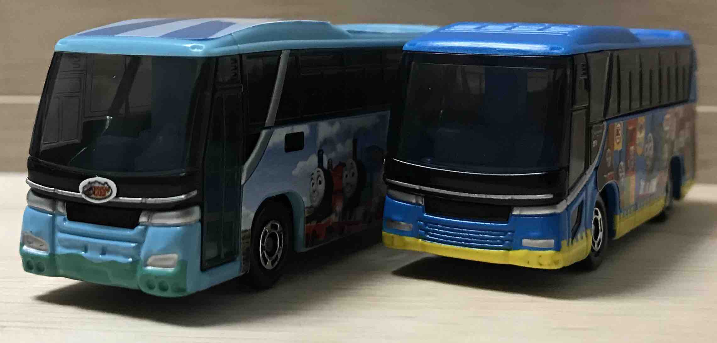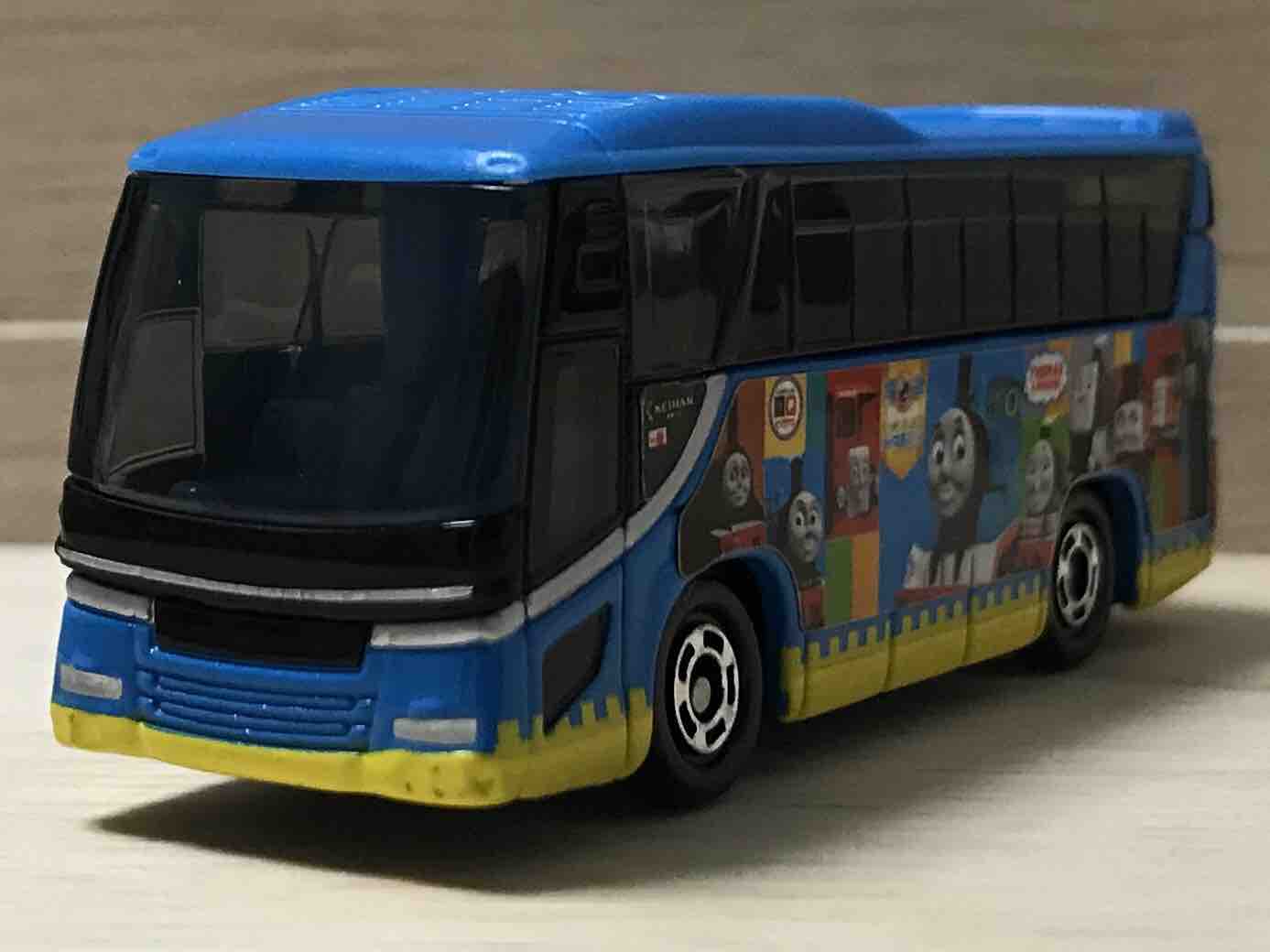 ベースは日野セレガ。トミカの商品名は、"京阪バス トーマス直Q"ですが、実際には"京阪バス ダイレクトエクスプレス直Q京都号「トーマス直Q」"といいます。 簡単に解説すると、ダイレクトエクスプレス直Q京都号というバス路線があり、その路線のトーマスラッピング仕様のバスという感じ。