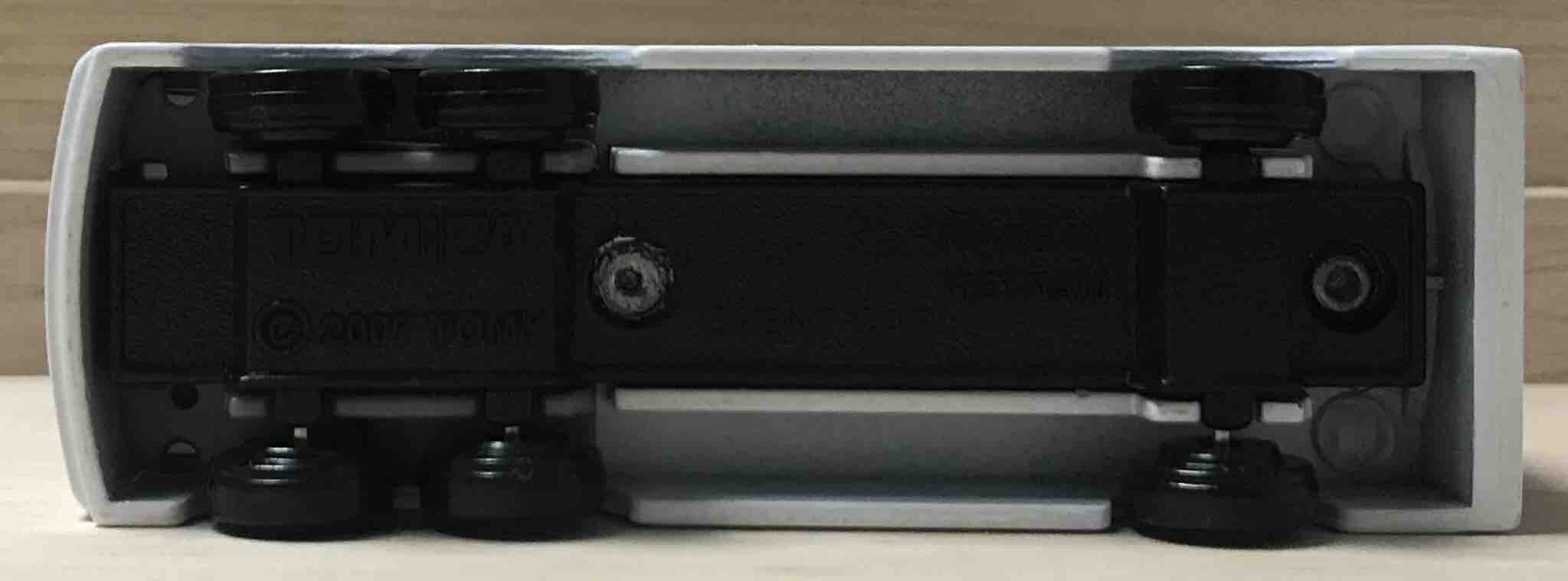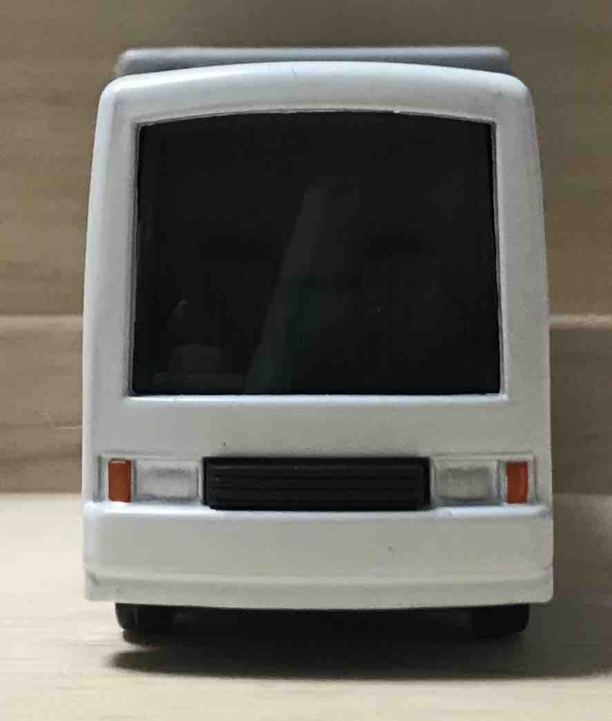 お顔だけ見るとシンプルな白いトラック。ヘッドライトのウィンカー塗装があって、手抜きを感じない架空車(ベース車はあり、三菱ふそうザ・グレートの特装車)って、なかなか良いですよね。タカラトミーさんの「どういったトミカであっても、手を抜かないよ」という意思が現れているように感じます。