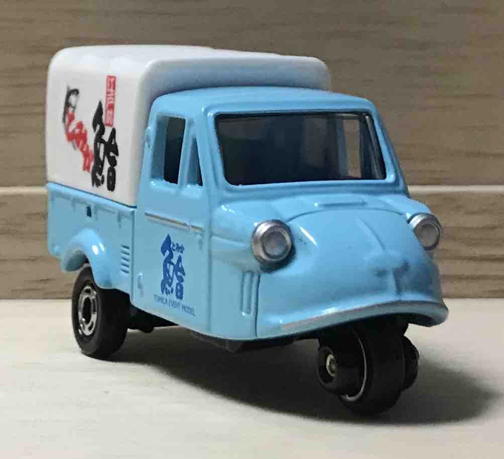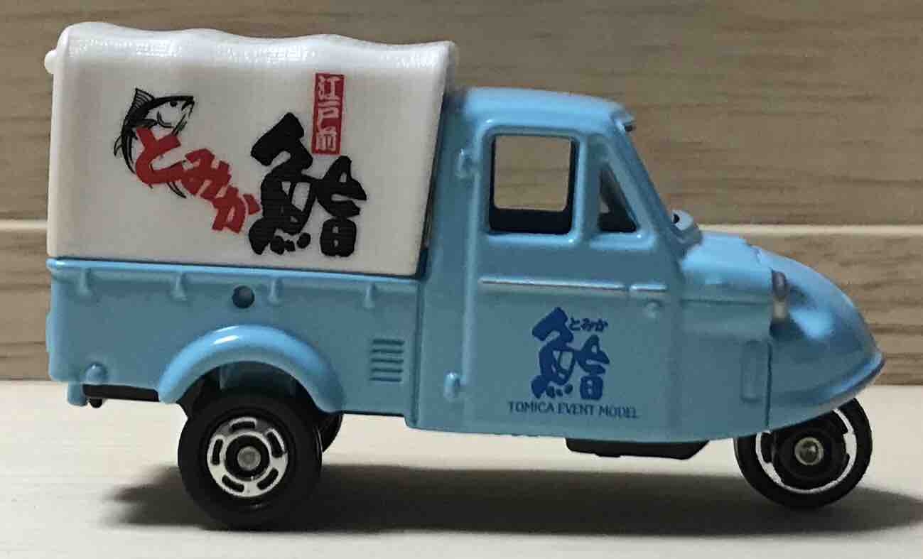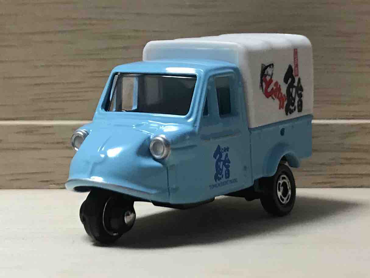 箱には大きな「鮨」の文字とひらがなで「トミカ」の文字。そう、このミゼットは「とみか鮨」というお店の車。市場が似合いそうな感じです。