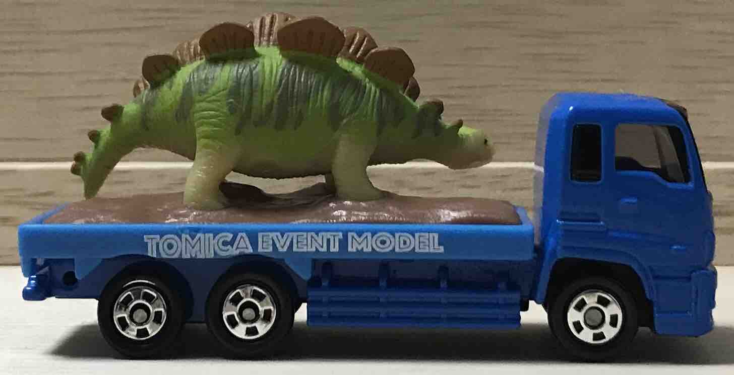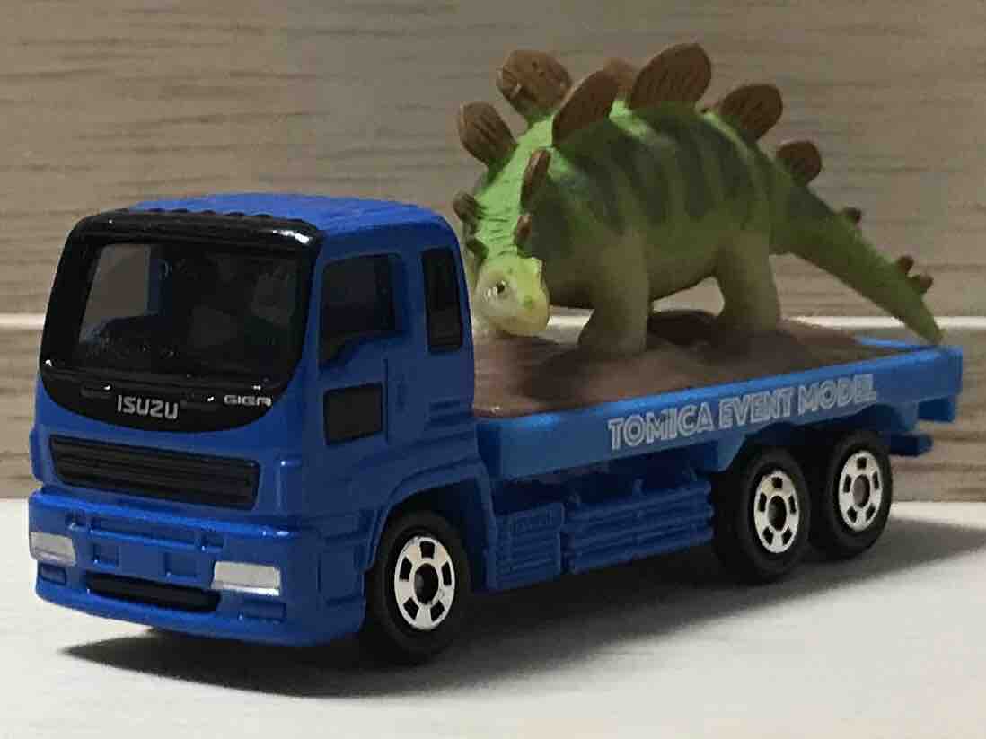 いすゞギガがベースの恐竜運搬トラック。積載している恐竜は「ステゴザウルス」です。ステゴザウルスは、今から約1億5000万年前にこの地球に生息していたとされる恐竜です。
