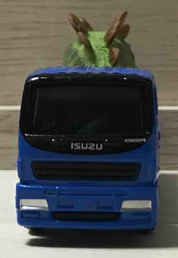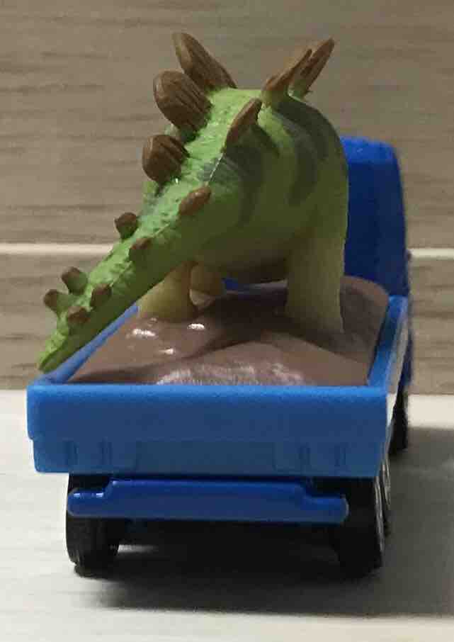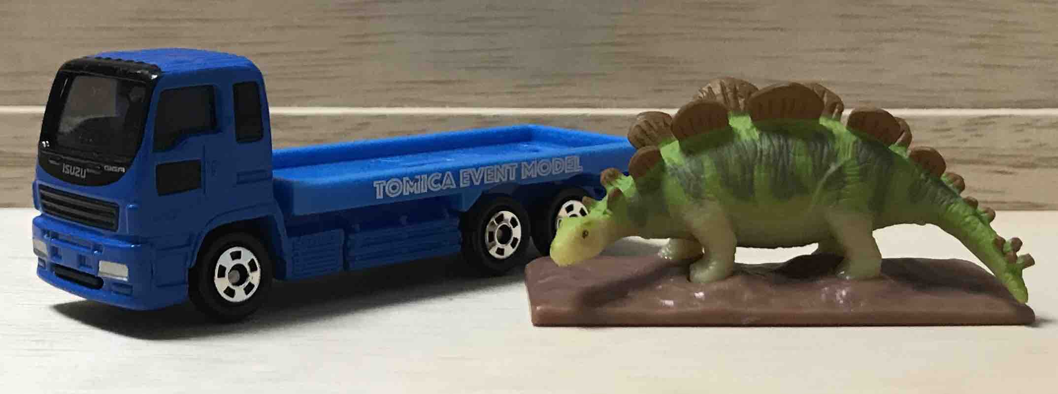 恐竜は左側に顔が向いています。トミカより恐竜は小さいので、トミカのいすゞギガがものすごく大きいのか、それともこの恐竜が小さいのかです。もしかしたらステゴザウルスの赤ちゃんなのかもしれません。