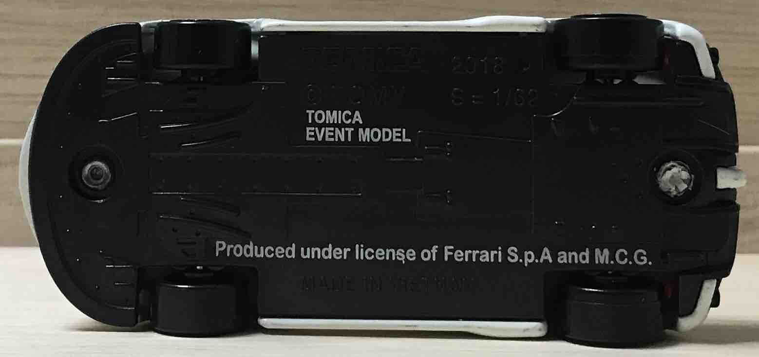両サイドは同じデザイン。トミカ博限定のイベントモデルトミカには「TOMICA EVENT MODEL」の文字が入っていて、スポーツタイプの車は高確率でサイドにあります。ですが、このフェラーリには今のところありません。ということは…