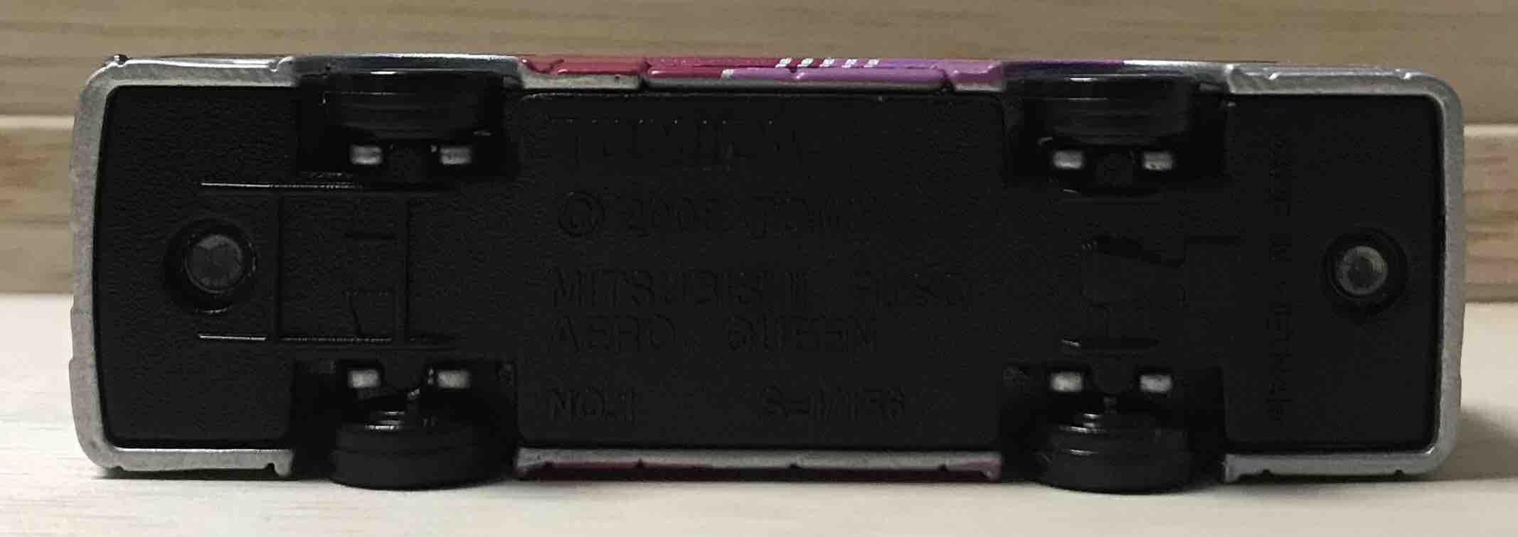 ルーフには印刷でクーラーの再現があります。商品名は「三菱ふそうエアロクィーン」ですが、実車は「三菱ふそうエアロエース」。なのでクーラーの再現があるわけですが、どうしてトミカになるとエアロクィーンになってしまうのでしょうか…