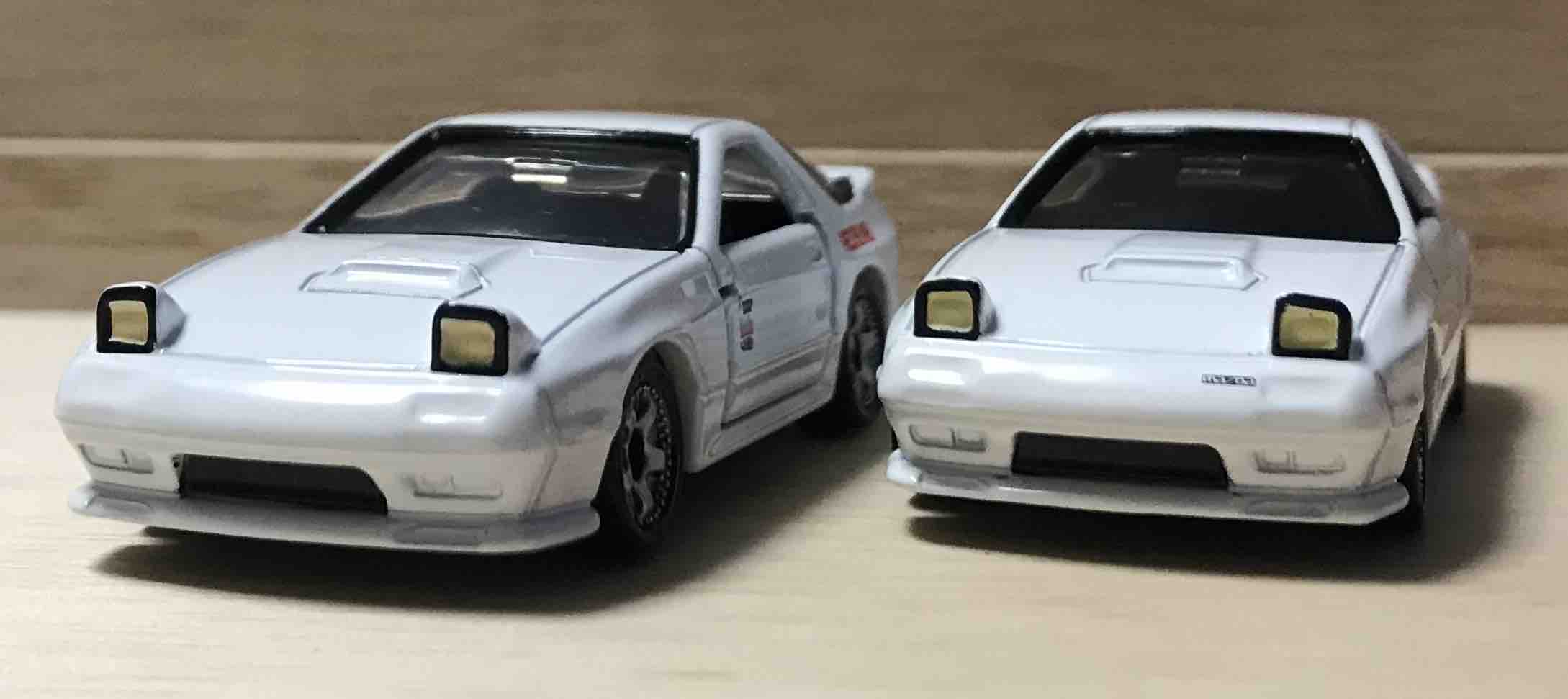 ドリームトミカ No.168 にラインナップのFC3SRX-7 と並べて。mazdaのエンブレムの有無は大きいですね。あると一気にリアリティーが増します。