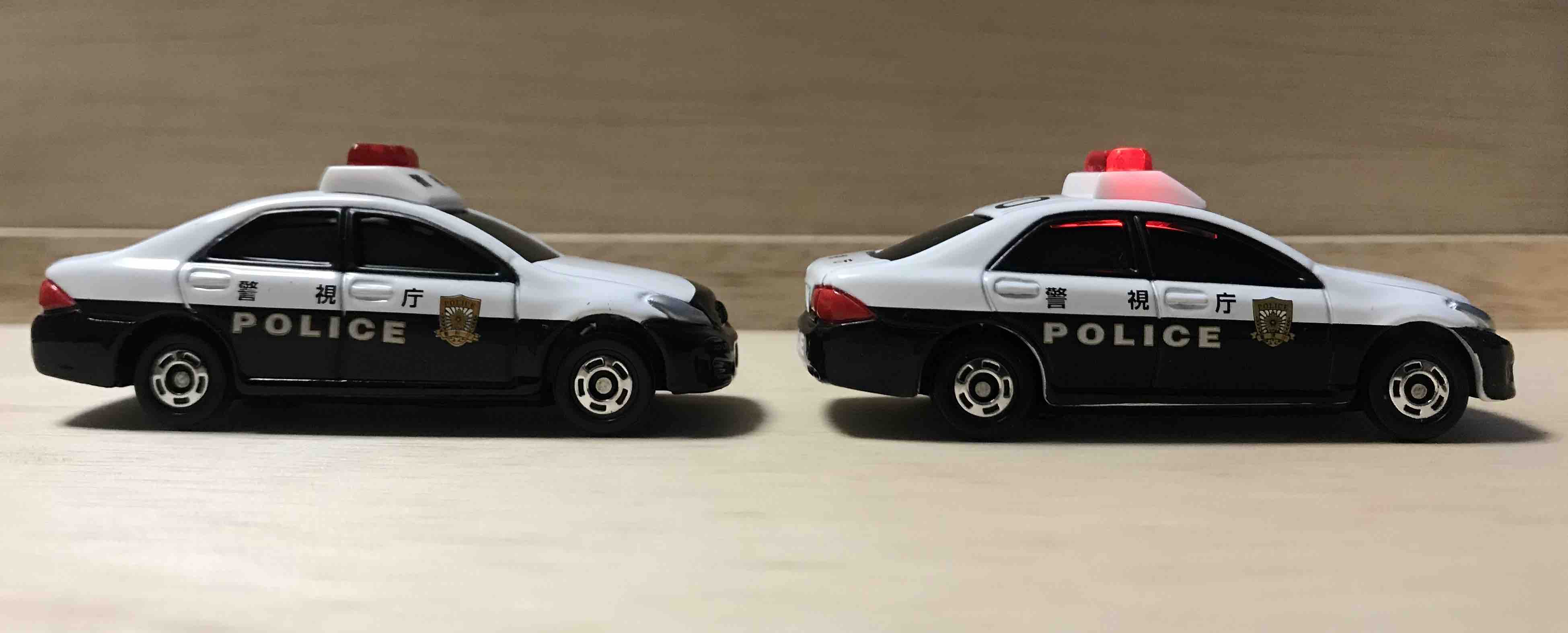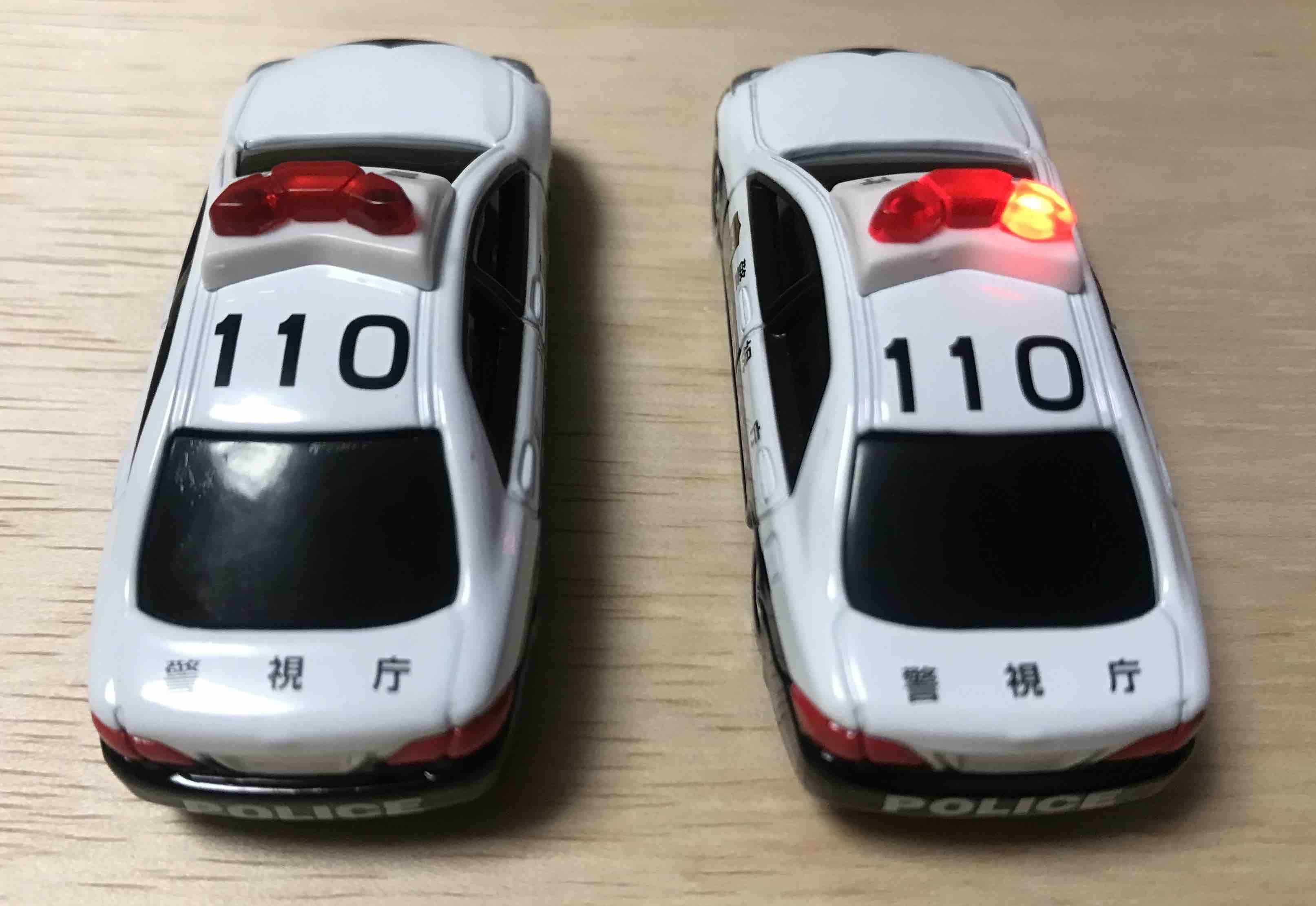 光るよ!鳴るよ!ライト&サウンドトミカのクラウンパトロールカー(右)のほうが、警視庁のPOLICEエンブレムが少し高い位置にあります。