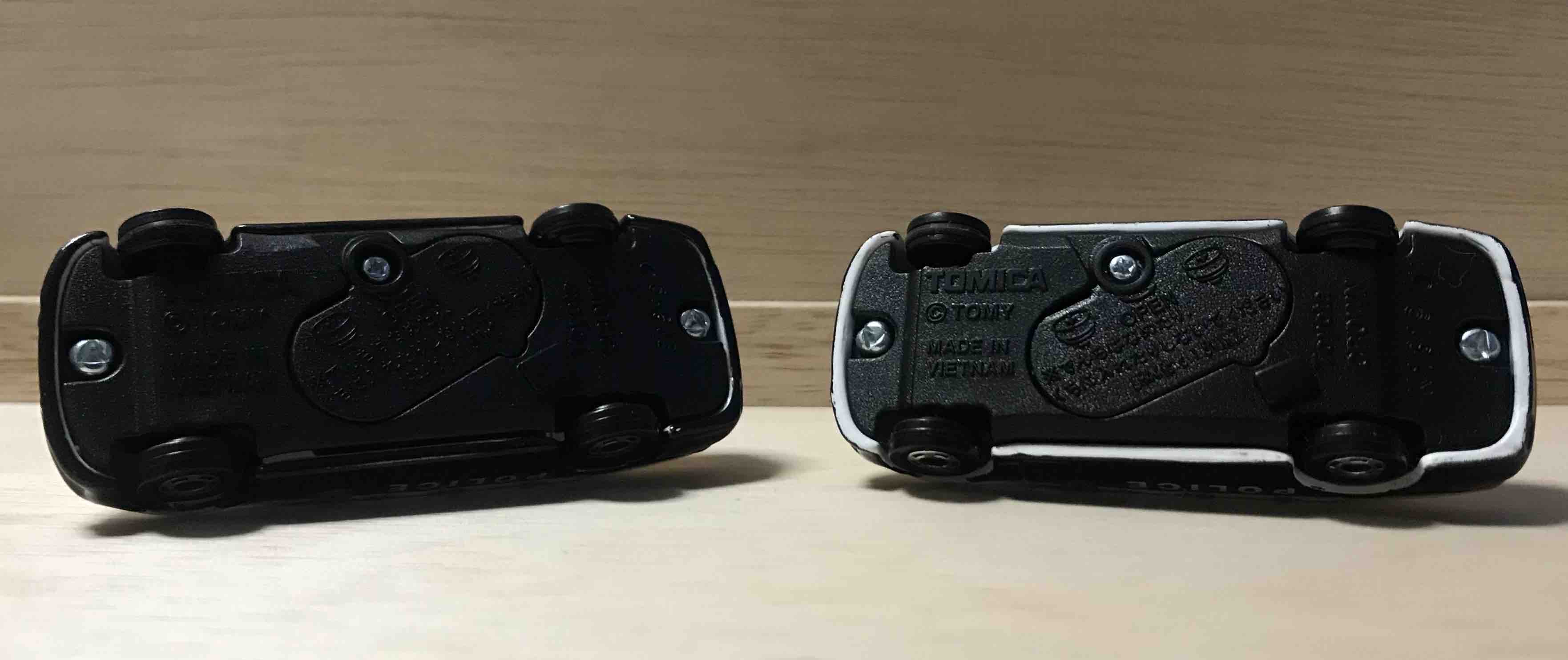 シャーシは同じものですが、下部の塗り分けは違く、下まで真っ黒なのが4D、下は白いのが光るよ!鳴るよ!です。これはあえてでしょうね。製造ラインで混同を防止するためでしょう。「4Dを買ったのにライトが光った」と言って悲しむ人はあまりいないとは思いますけども…
