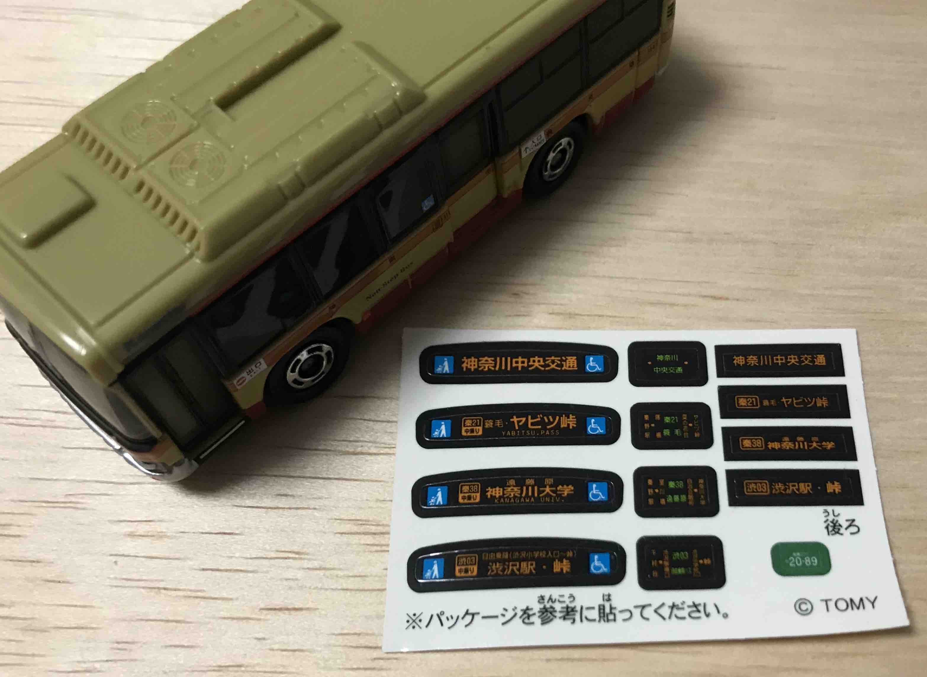 シールを貼らなくてはなりません。パッケージの画像のエルガミ…中型路線バスは「回送」表示ですが、シールの選択肢にはありません。一番近いのは「神奈川中央交通」の表示でしょう。他にも「ヤビツ峠」・「神奈川大学」・渋沢駅・峠」があります。峠か大学しかありませんね。