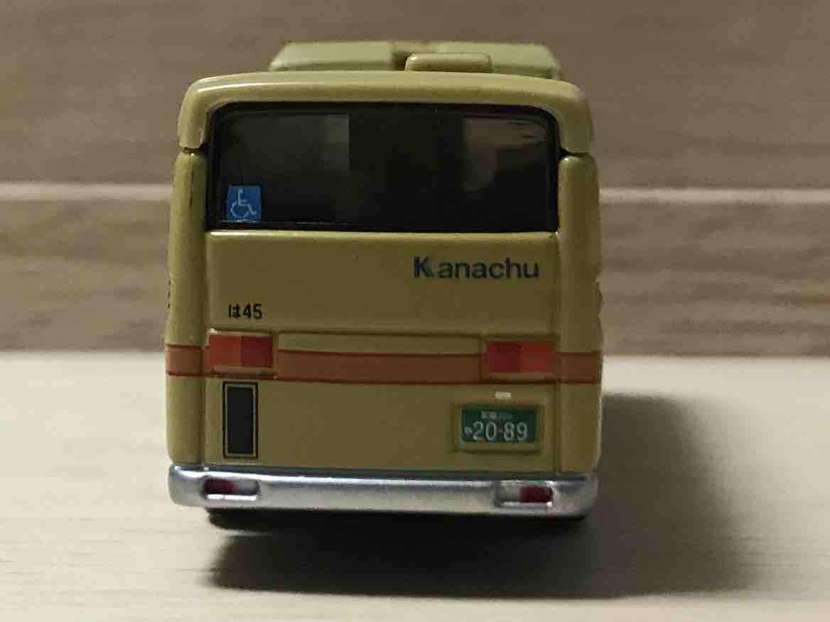 左側面もそうなのですが、エルガミ…いすゞの中型路線バスを再現するために、ルーフのKanachuの文字の下に黒いラインがあります。すぐ横からは赤いラインになりますが、これも実車に基づくもの。(トミカの部品的の都合で線一本分のスペースが犠牲になっているので、実車を再現するとこうなってしまいます) ここも、かなりすごいクオリティーではないでしょうか。細かすぎです。