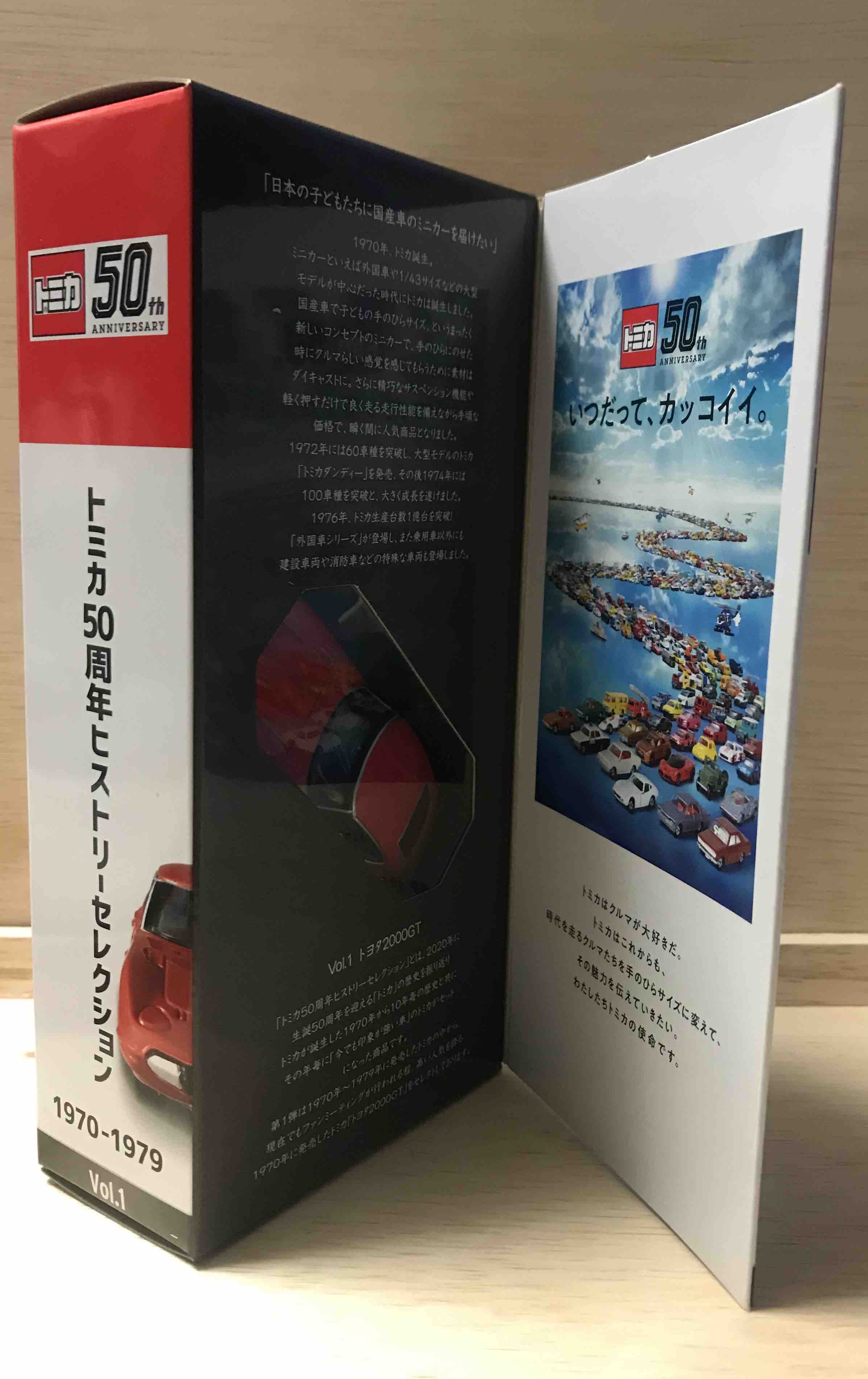右側はトミカ博にも使われている50周年のイメージ画像、左は上にトミカ50年の歴史と、下にトヨタ2000GTの紹介。