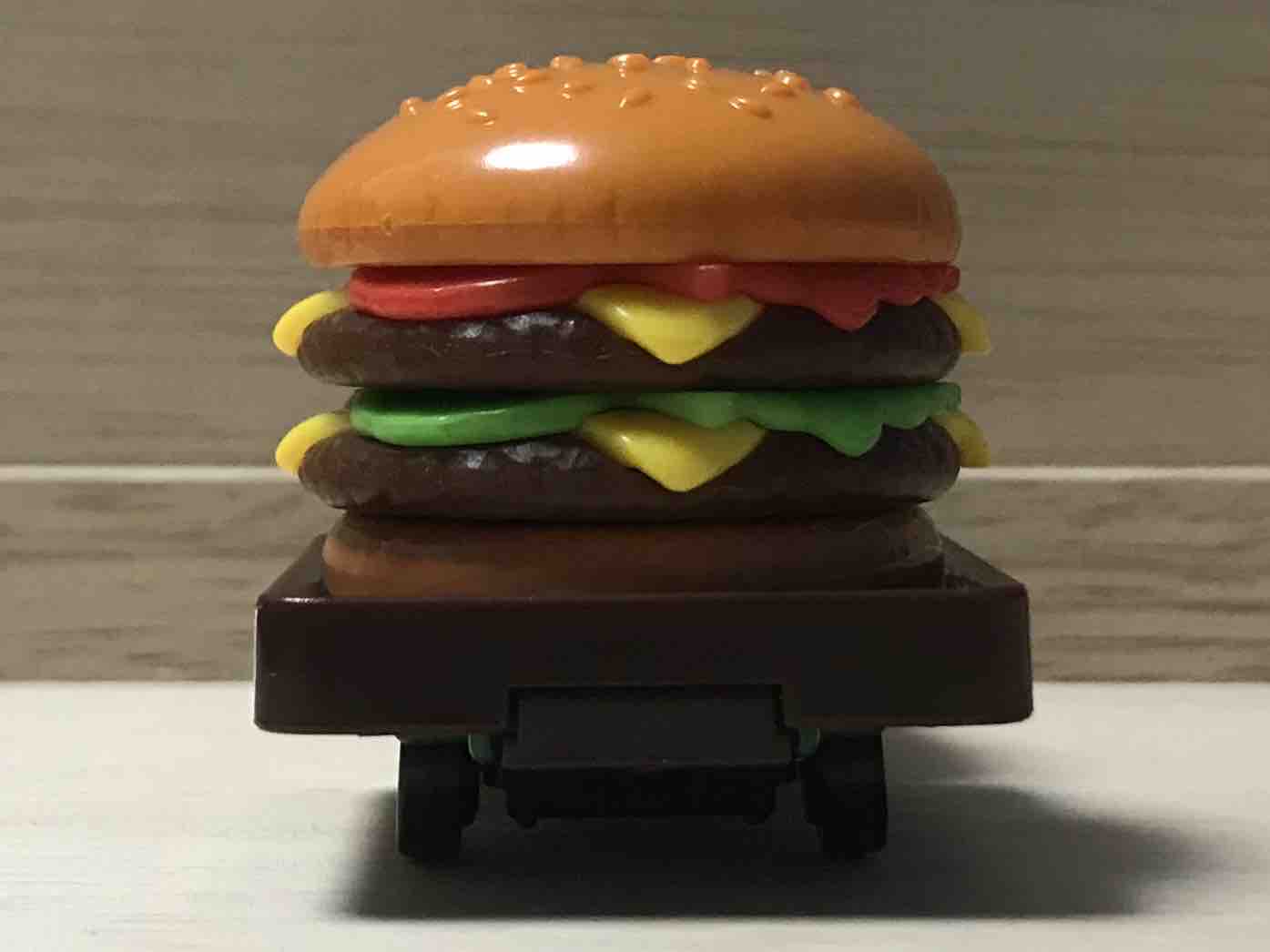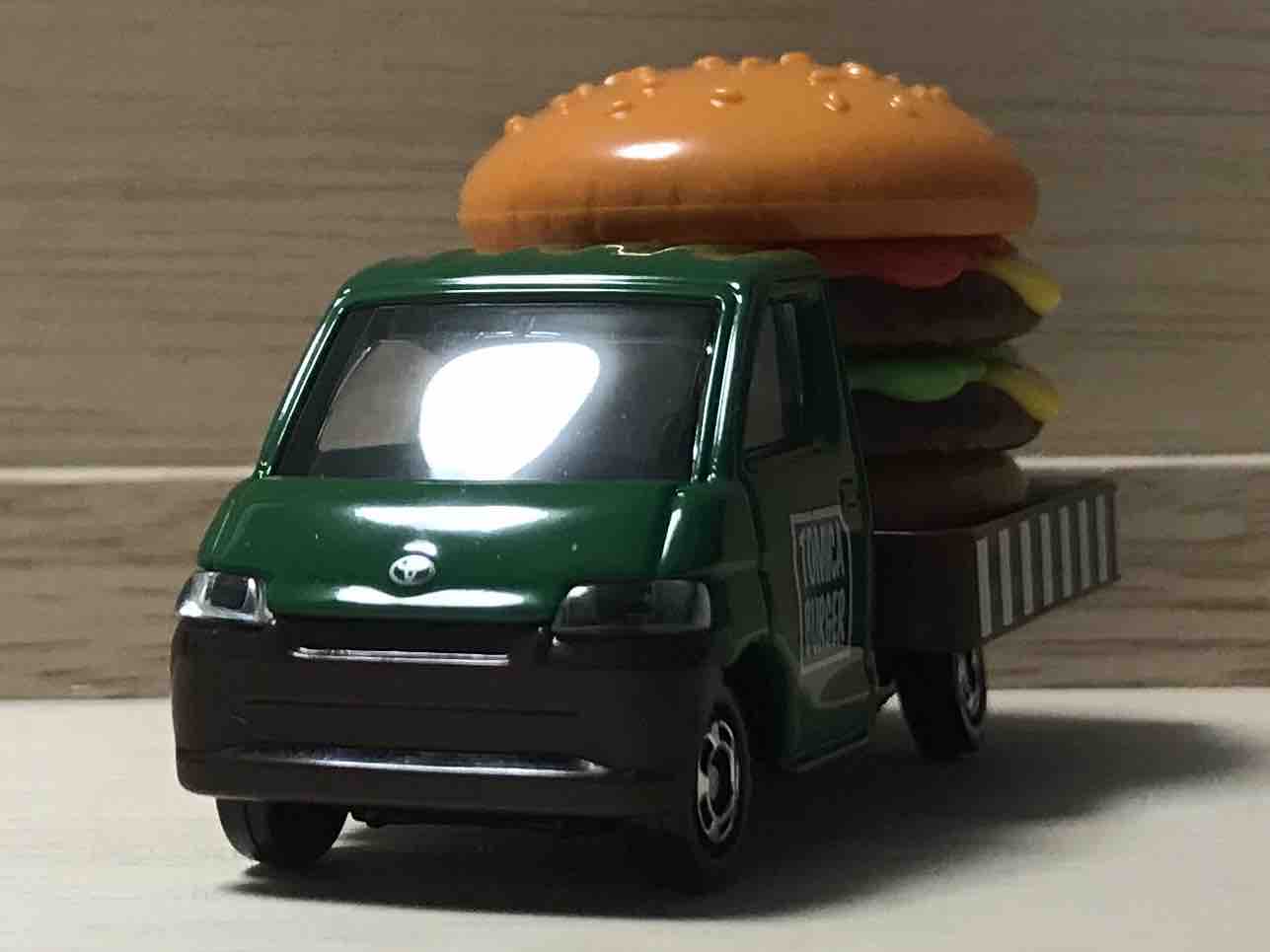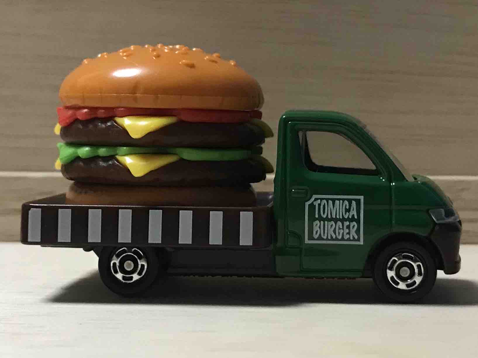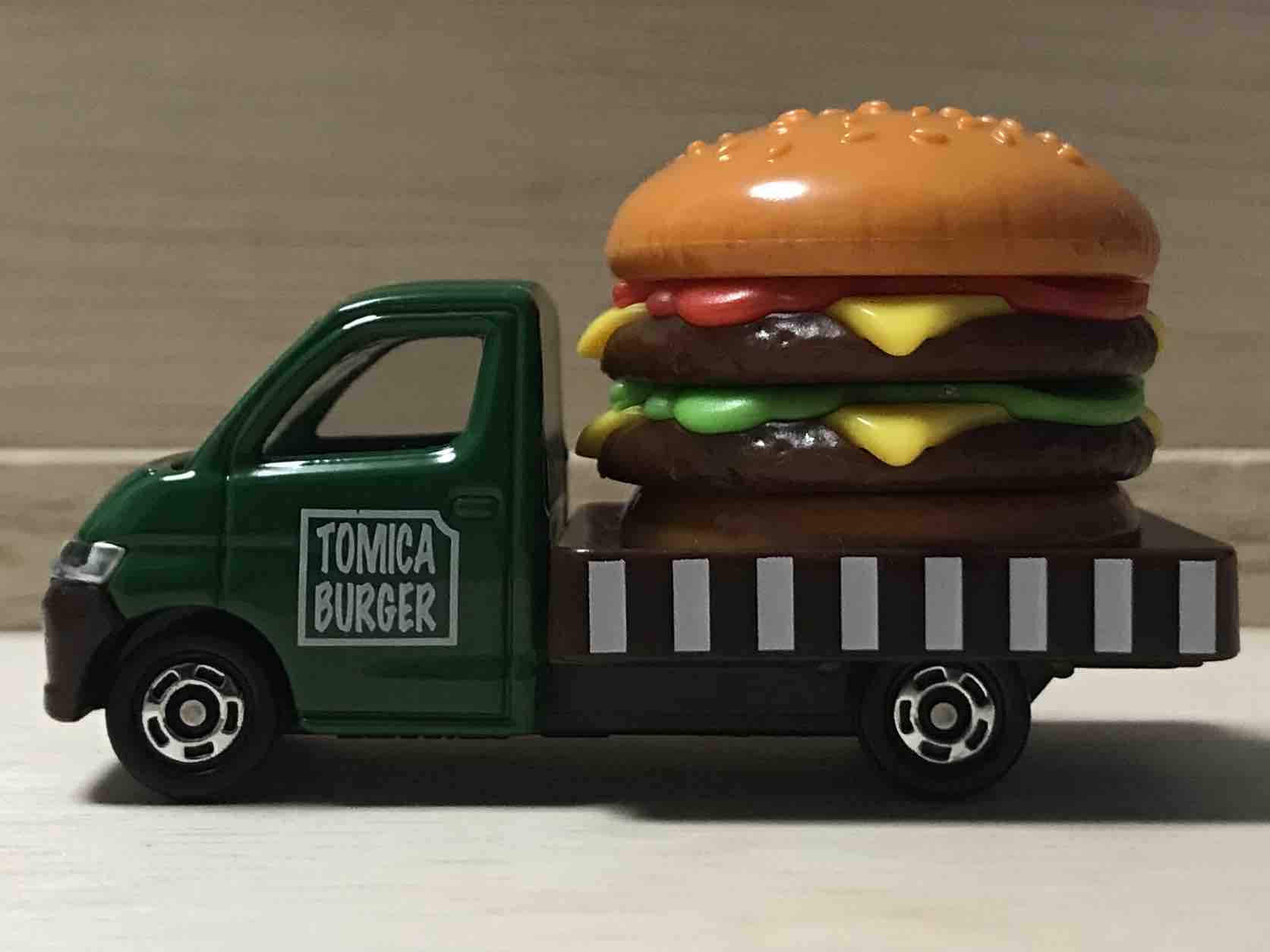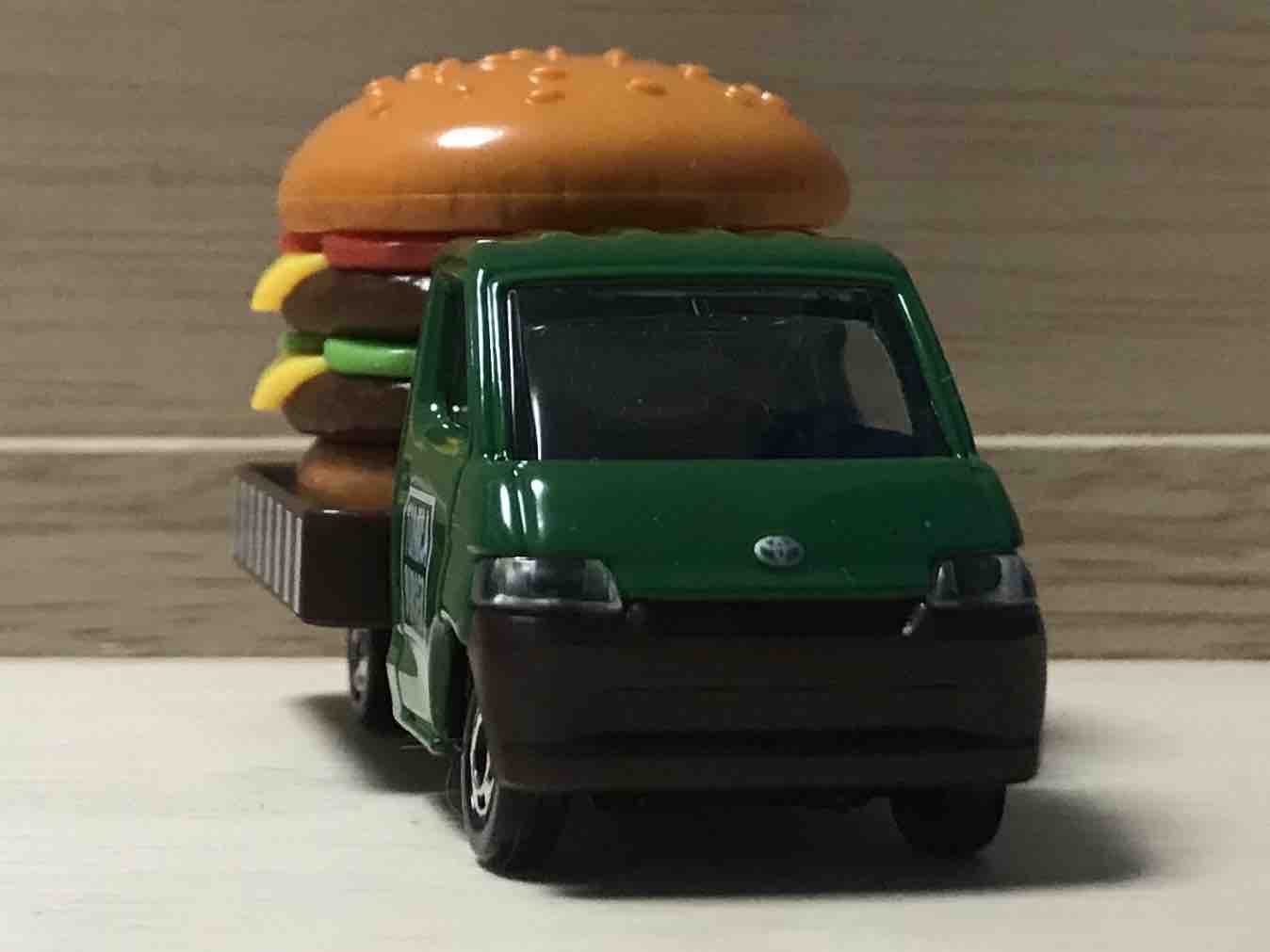 このセットのテーマは「トミカのたべものやさん」です。あなたはどちらかというと、たべもののトミカ。荷台に積まれているのはダブルハンバーガー。ハンバーガー屋さんではありません。