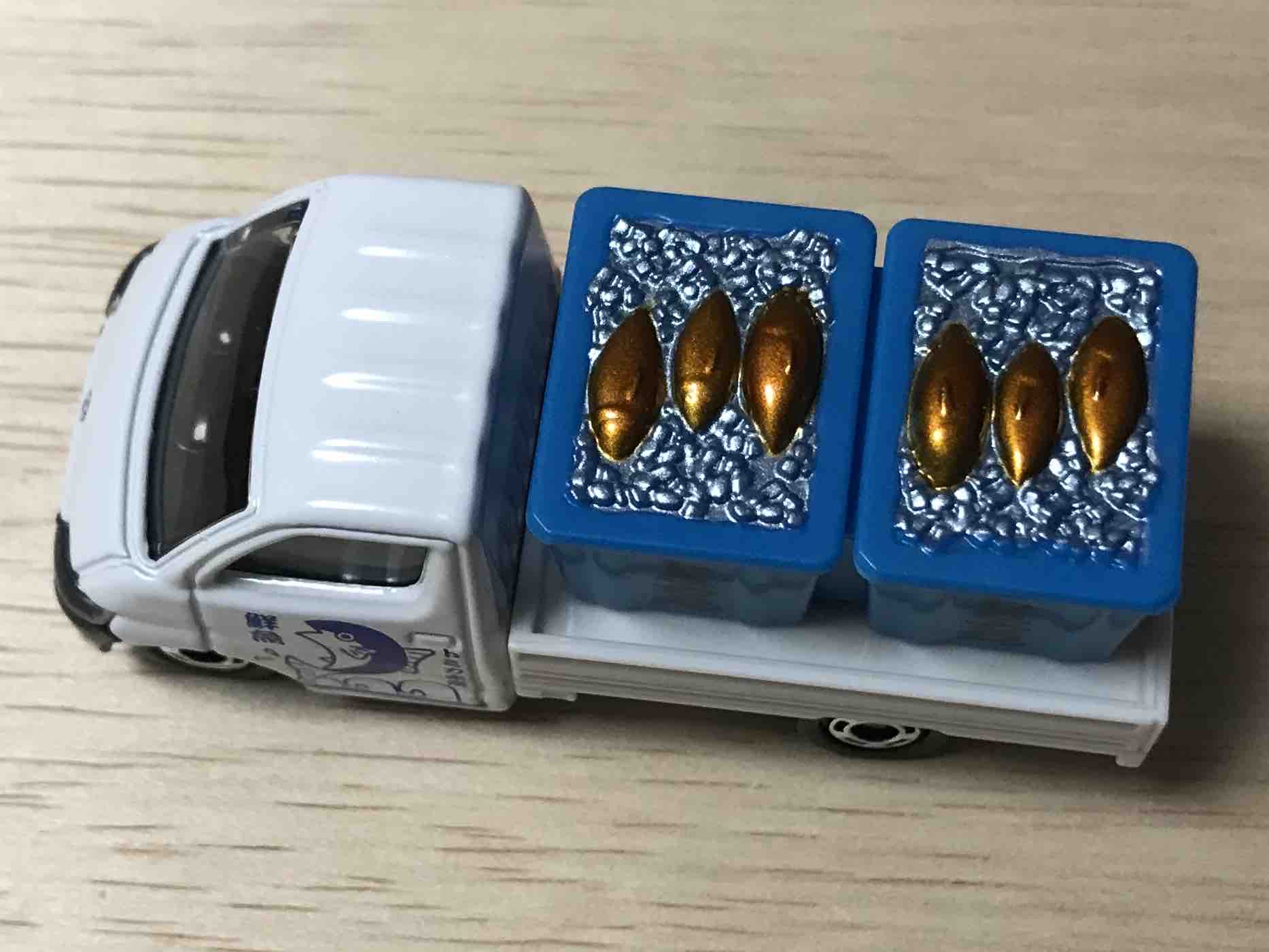 魚屋さんの名前は「トミカ水産」青い箱にはトミカ丸の文字。トミカ丸という船でとれた鮮魚なのでしょうね。
