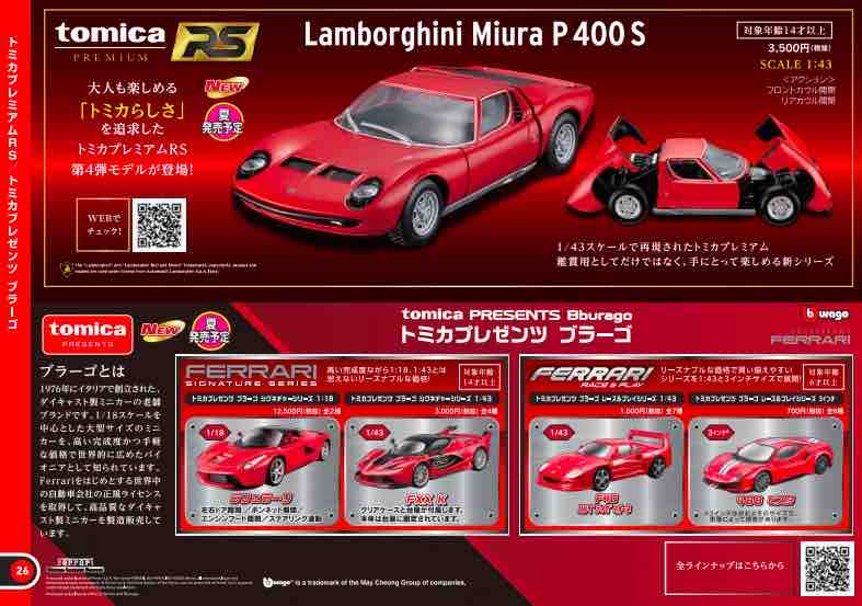 トミカプレゼンツ ブラーゴイタリアのミニカーブランド「ブラーゴ」がトミカシリーズに。というよりかは、フェラーリのライセンスを持つブラーゴというブラーゴを持つ香港の会社から、トミカはフェラーリのミニカー化を許可してもらったので、そのお返しに日本でもブラーゴブランドを売りますよ!ということでしょう。完成品を買って日本で売るのか、注文から全てタカラトミーがするのかは不明で、タカラトミーに対する利益率はどのくらいあるのでしょうね。