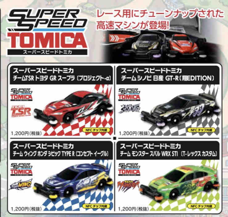 SUPER SPEED TOMICA / スーパースピードトミカ・チームTSR トヨタGRスープラ プロジェクト-αGazooレーシングのようなカラーリングで似合っていますね。・チームシノビ 日産GT-R 翔EDITIONレーシングカーというよりはチューニングカー。サーキットよりも夜の首都高速が似合いそうですね。・チームウィング ホンダシビック TYPE R コンセプトイーグル