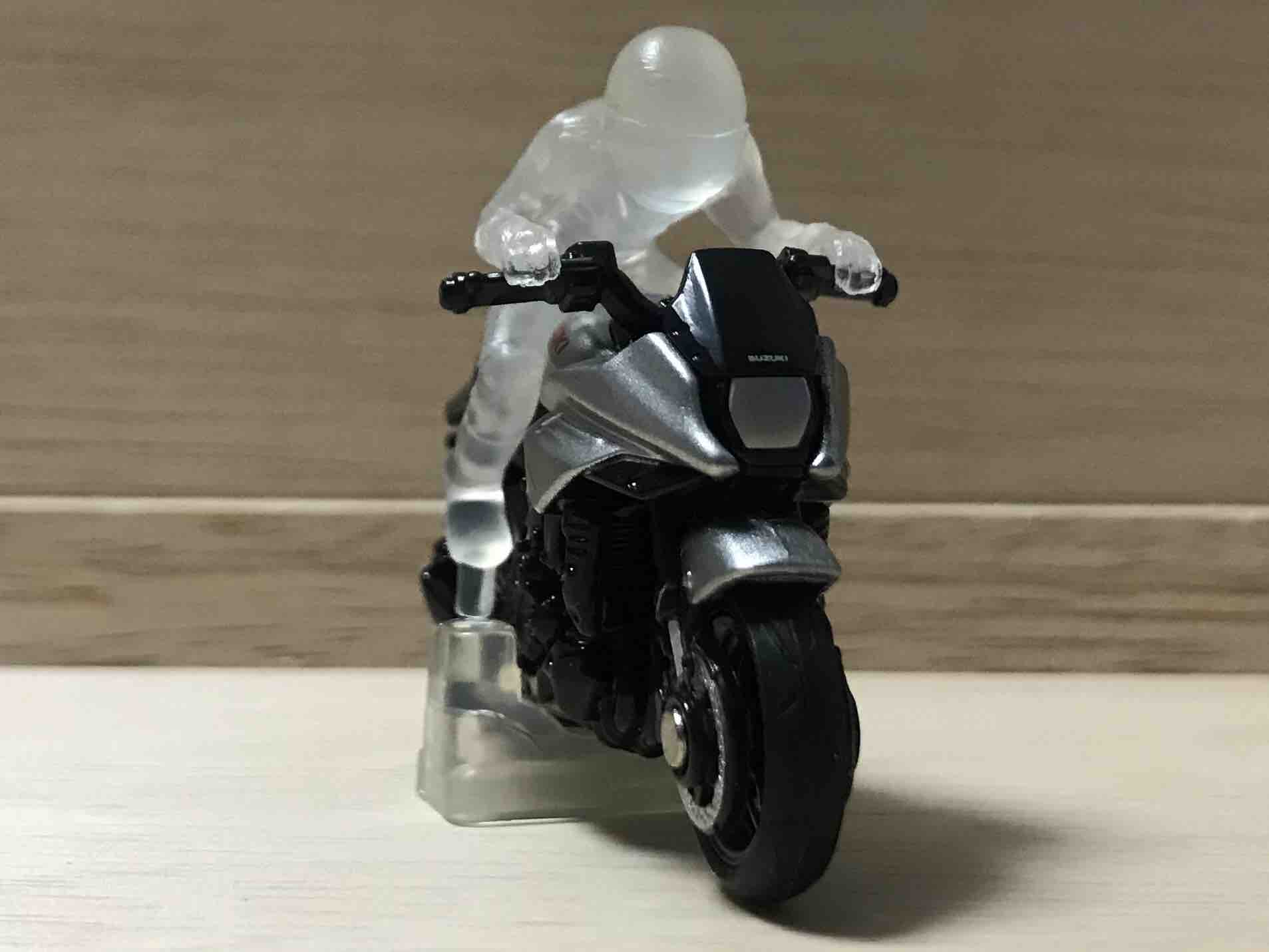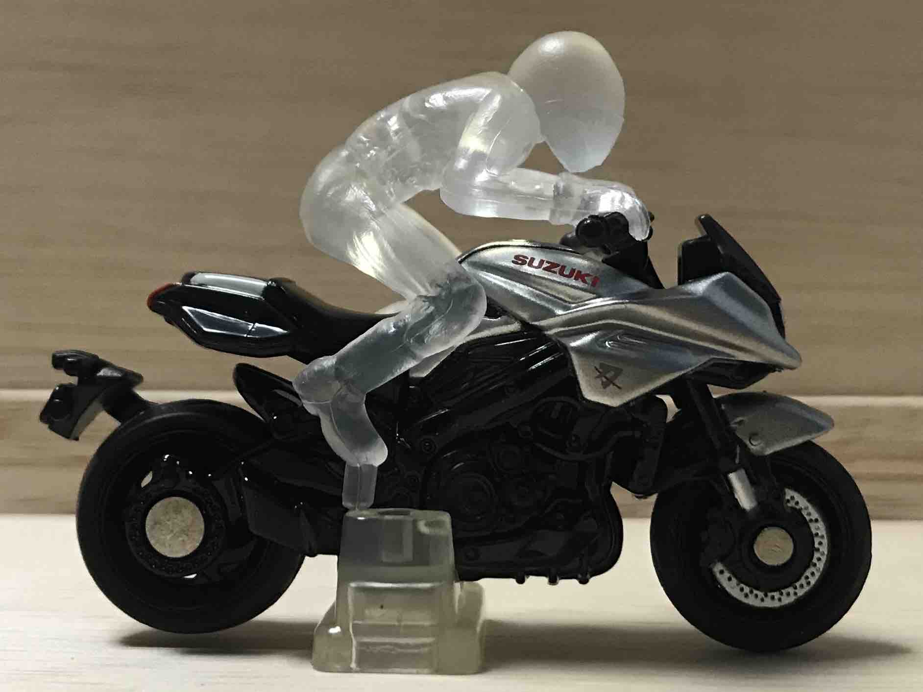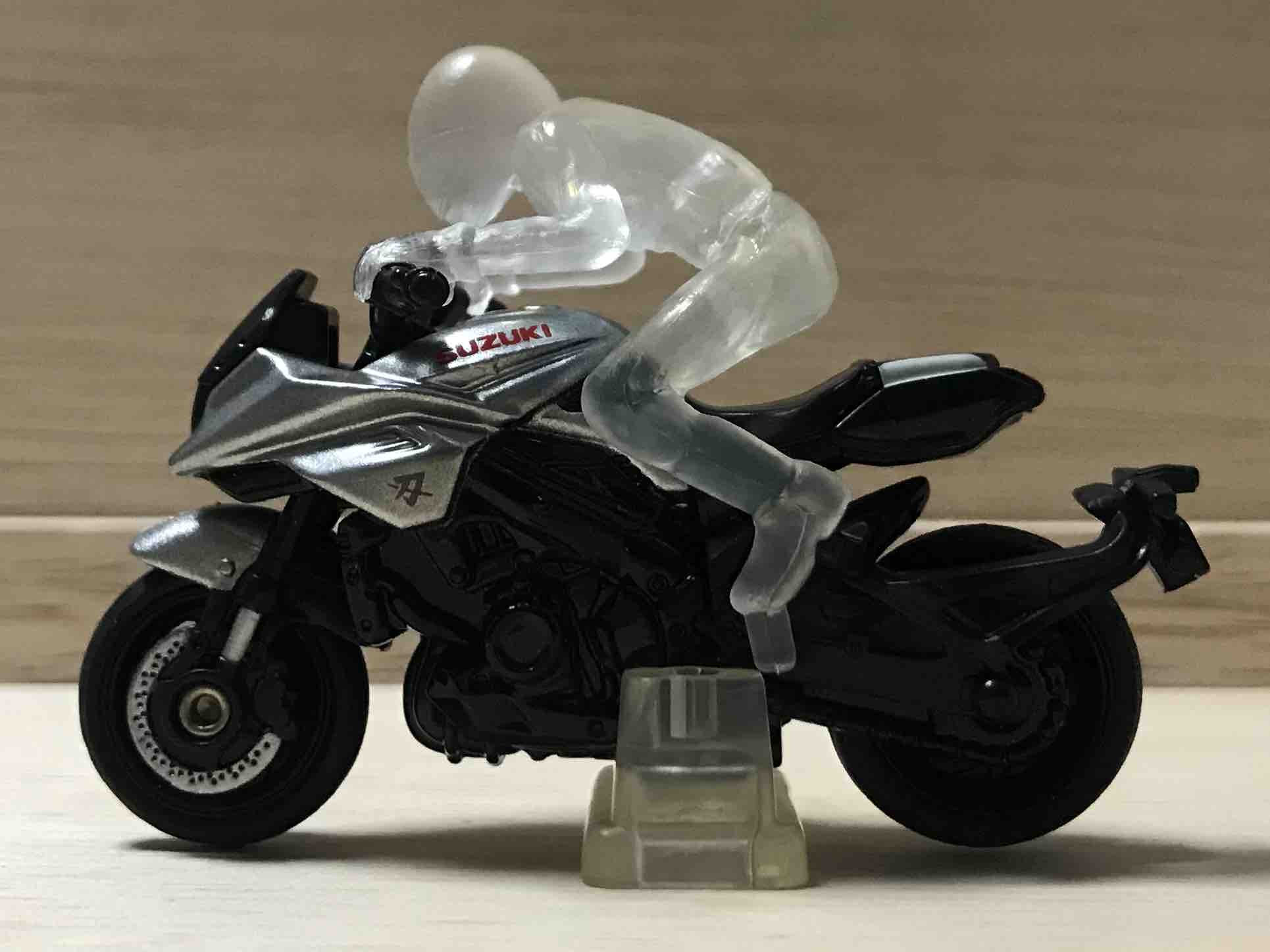 シャー… TOMICAの文字はありませんね。完成度高すぎて、勝手にトミカシリーズを離脱しました。ふぅ、ホンダ車しかなかったトミカのバイクシリーズに、新しいスズキの1台が入ったと思ったんだけどなぁ。