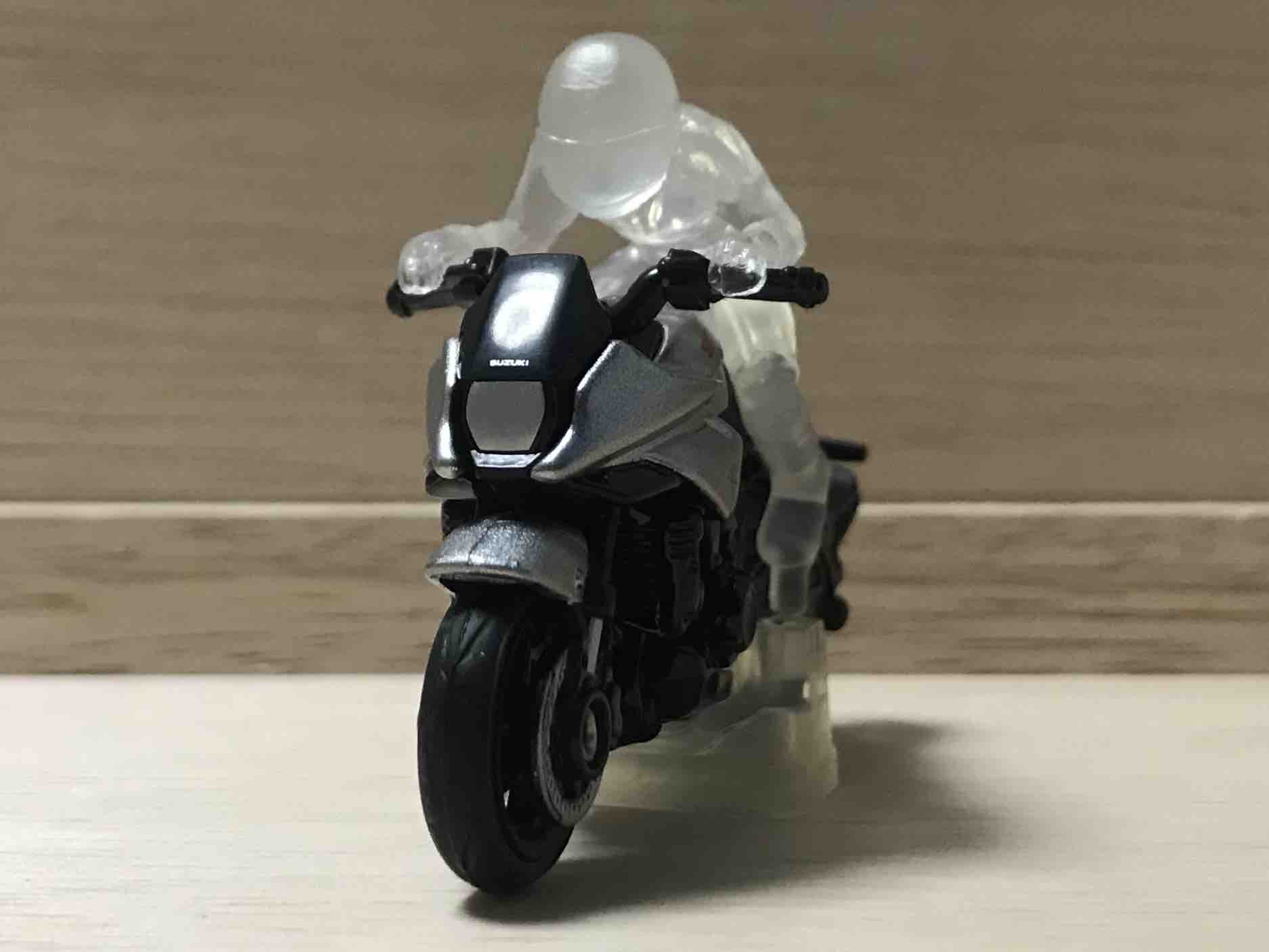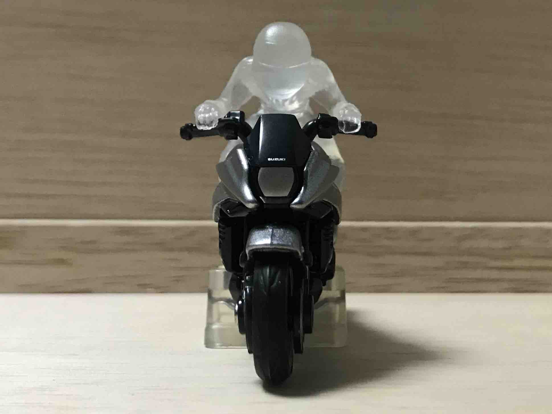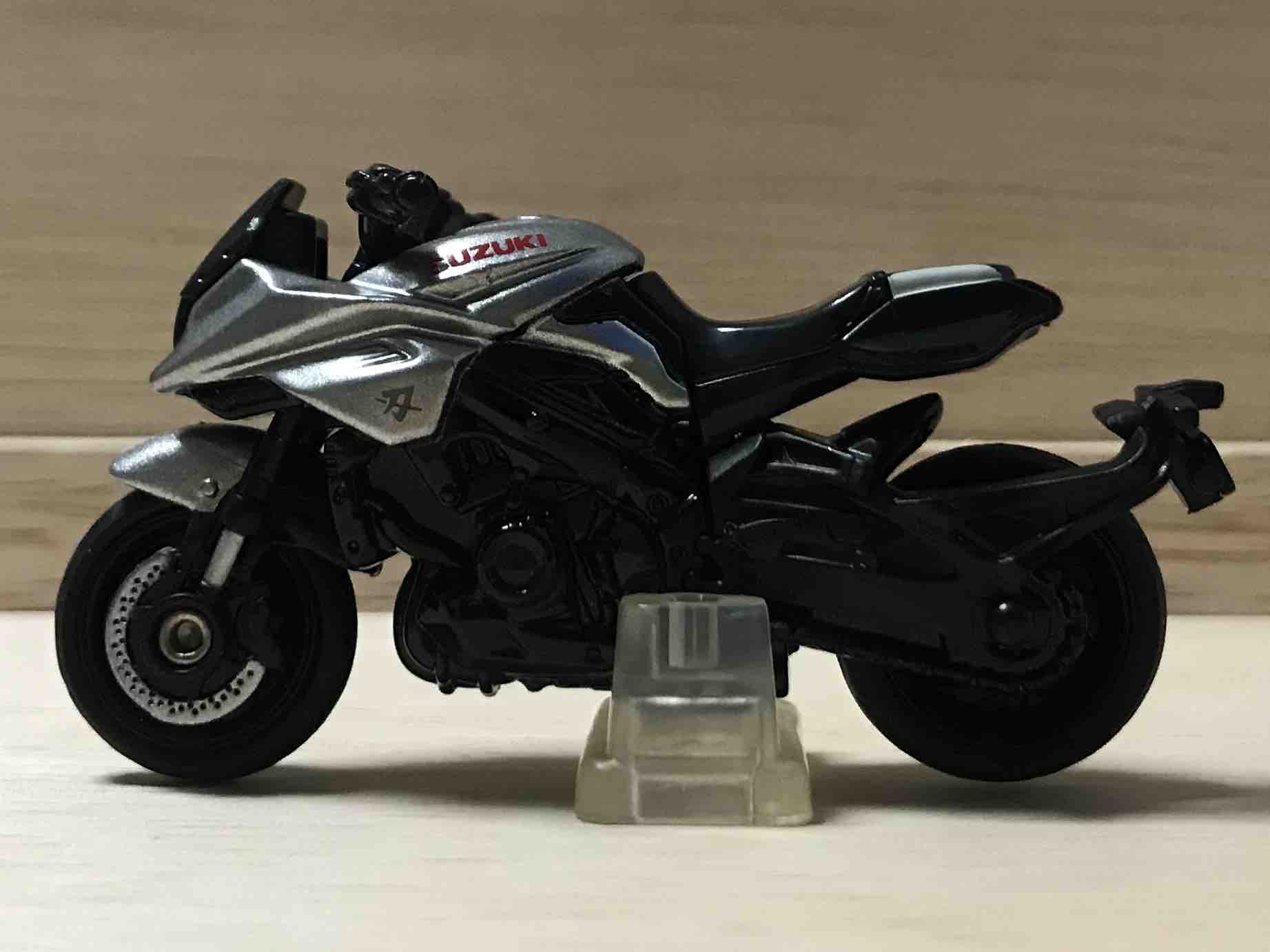 シャー… TOMICAの文字はありませんね。完成度高すぎて、勝手にトミカシリーズを離脱しました。ふぅ、ホンダ車しかなかったトミカのバイクシリーズに、新しいスズキの1台が入ったと思ったんだけどなぁ。