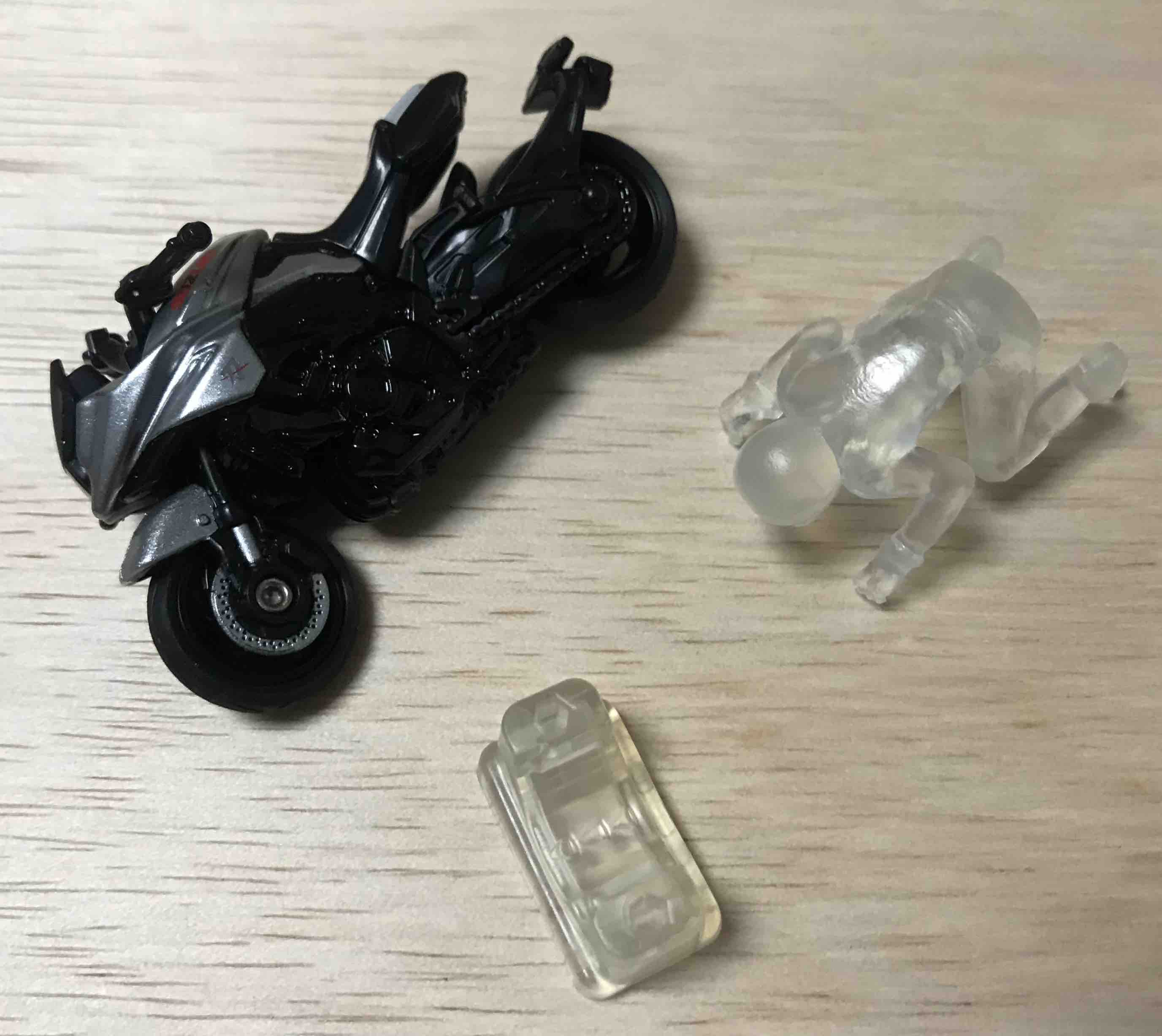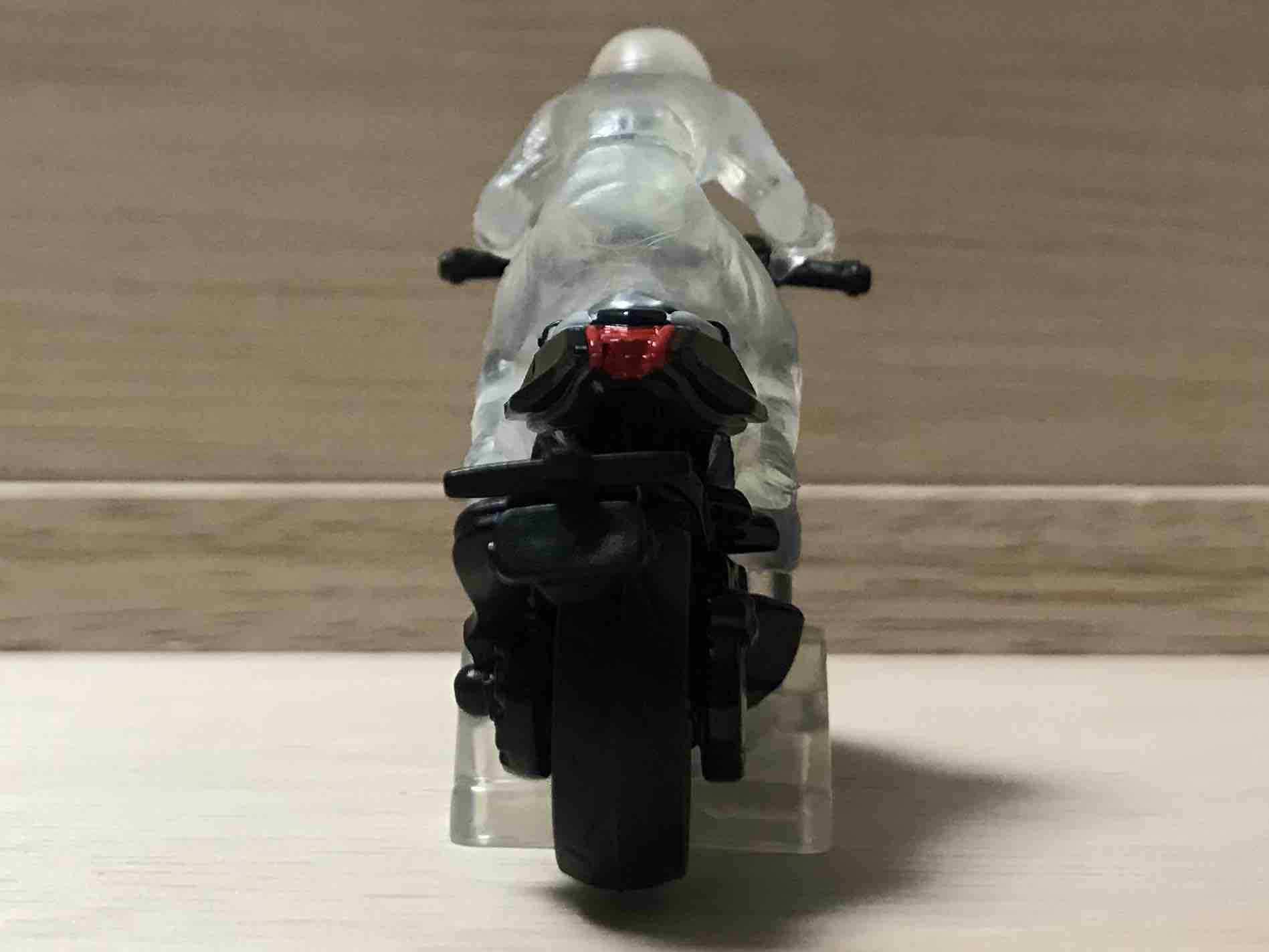 バイクファンの皆様にも楽しんでいただけるように、やや透明人間ライダーなしバージョン。エンジン類などの再現もあるので、トミカを今まで買わなかった人も、これには魅了されてしまうことでしょう。