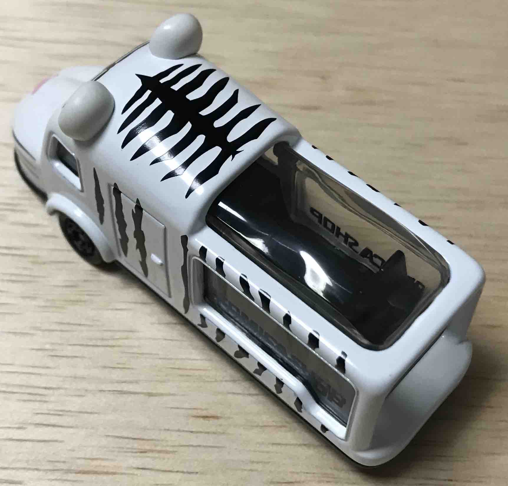 乗客から動物を楽しめるようになっていて、座席の外側はクリアーパーツになっています。そのクリアーパーツに黒字で「TOMICA SHOP」と入っているのですが、座席が黒いがために目立たないという、トミカショップらしくないトミカショップオリジナルトミカです。