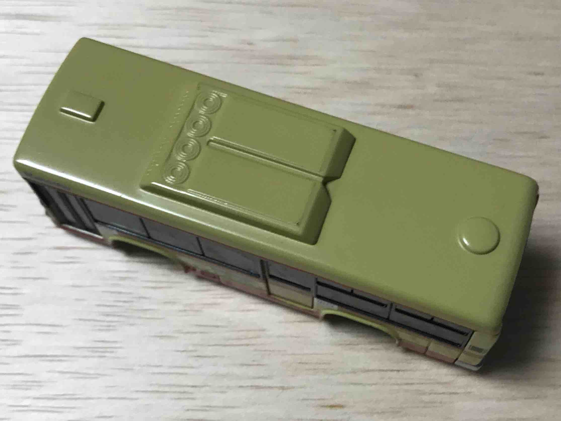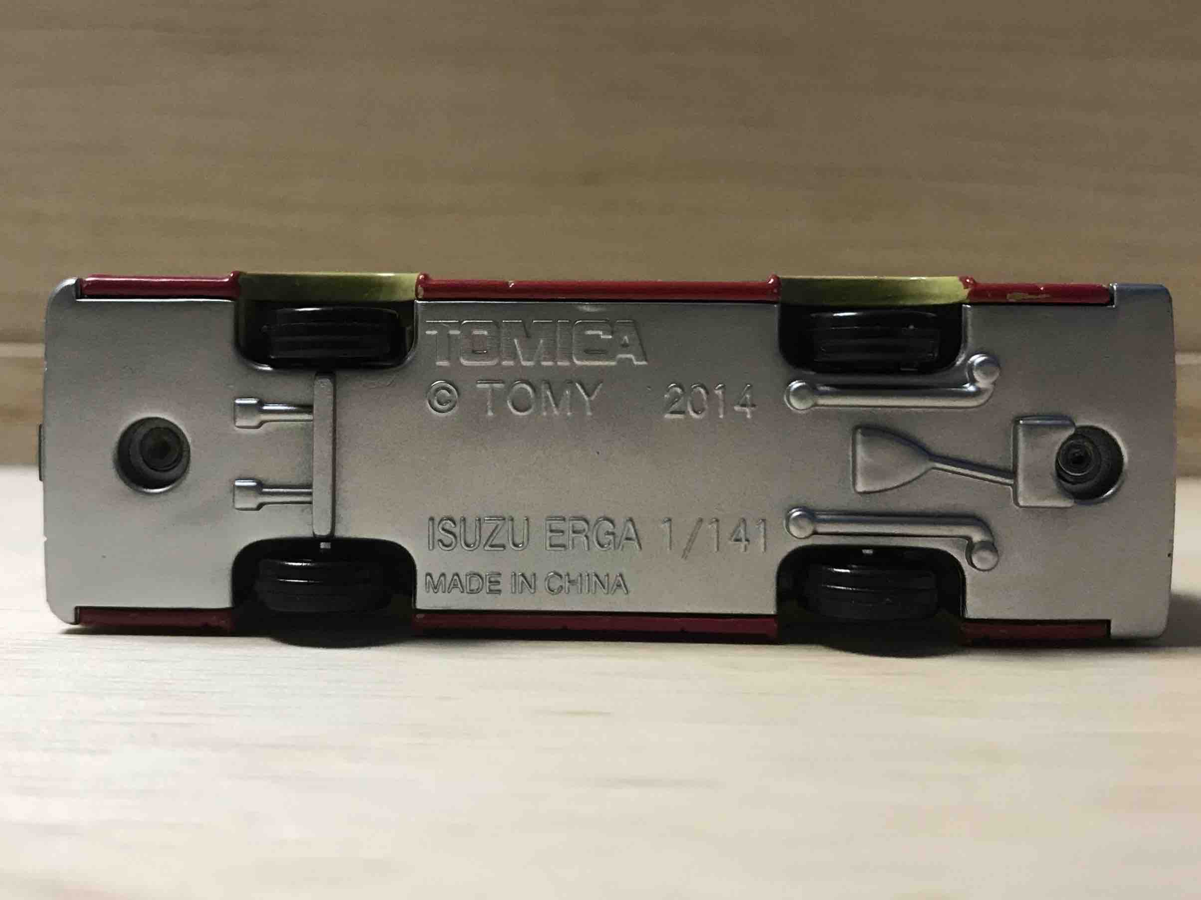 初期エルガに多い、タイヤも変わった穴のものを使用し、転がり性能はあまりよくないというミニカーとして致命的なものです。走らせていると、なにかが引っかかります。エルガのバリエーションも、末期に近くなるほど、走りが良いタイヤになりました。