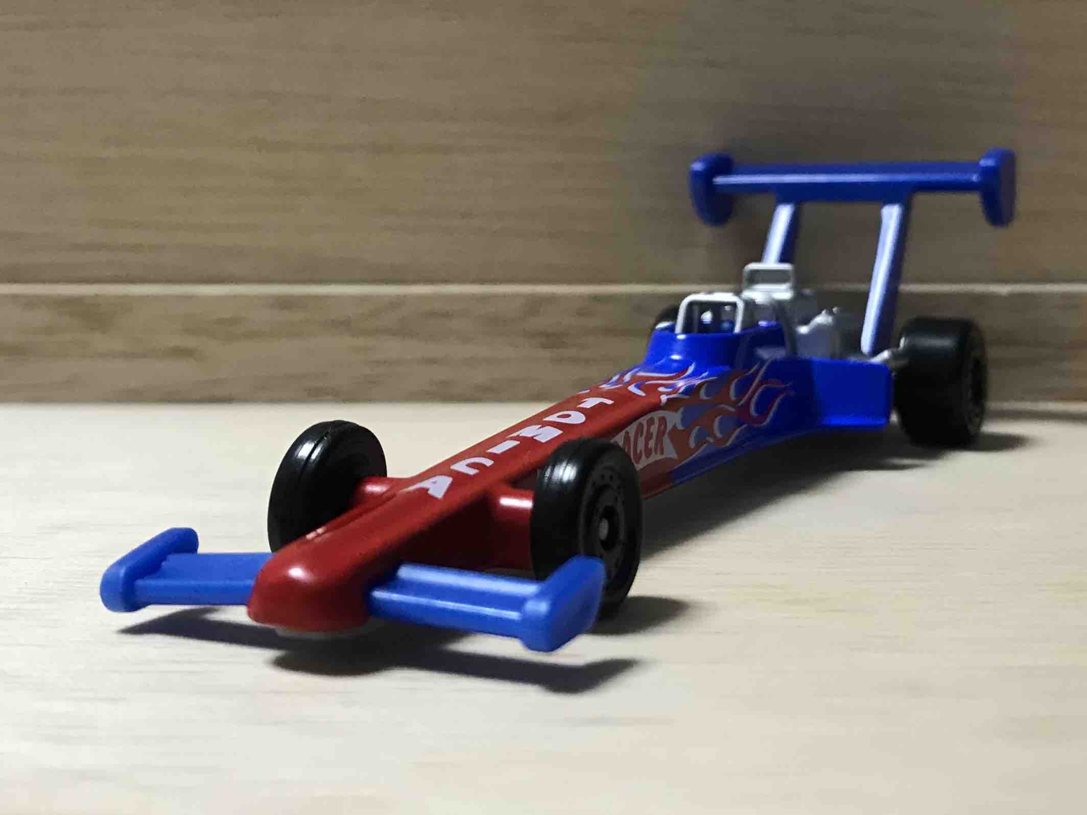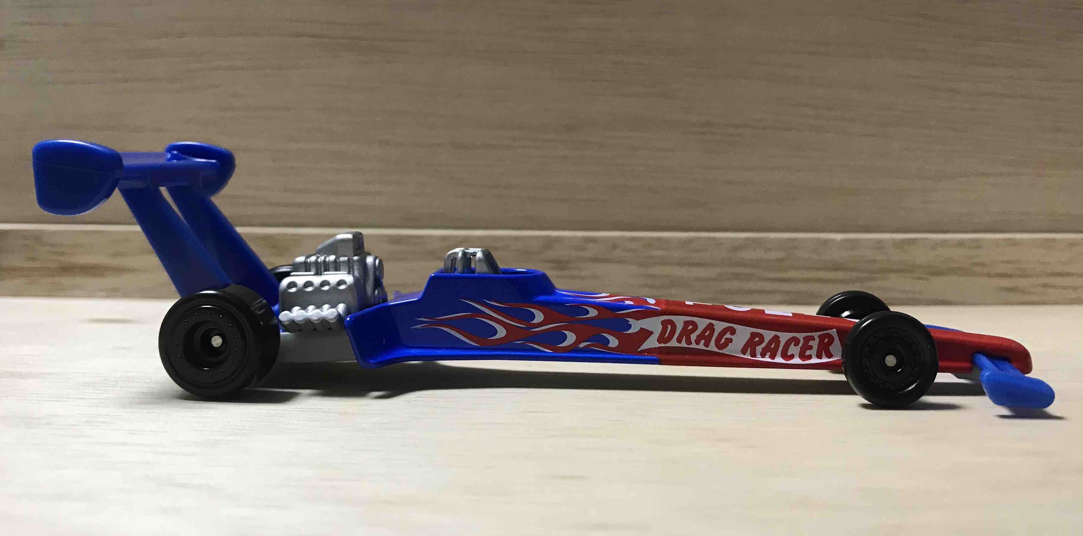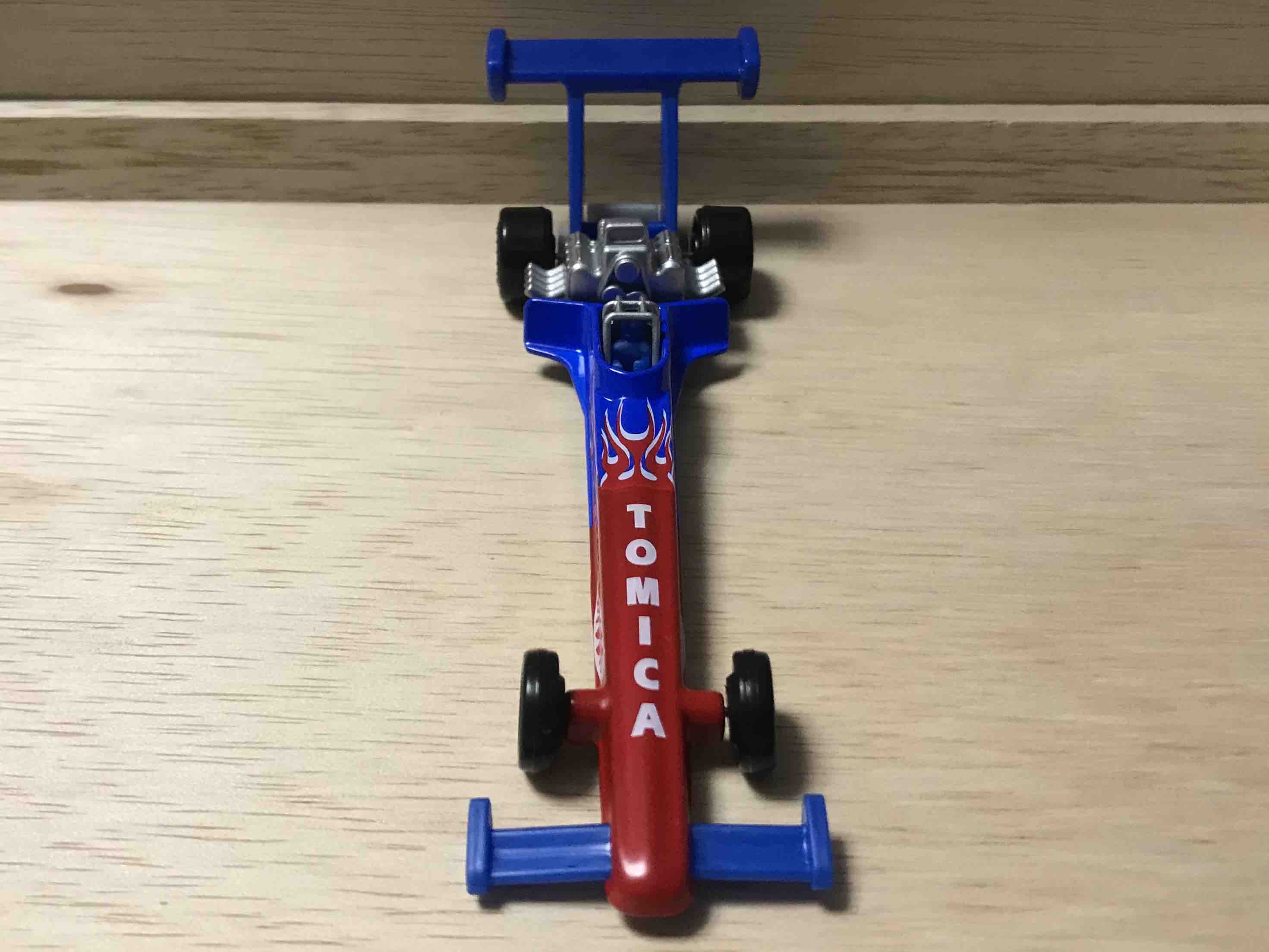 ドラッグカーとは、直線コースをいかに速く走るかというドラッグレースに出場する車です。トミカとなったモデルとかはなく、ドラッグレースに出場する車を抽象的に再現したにすぎません。