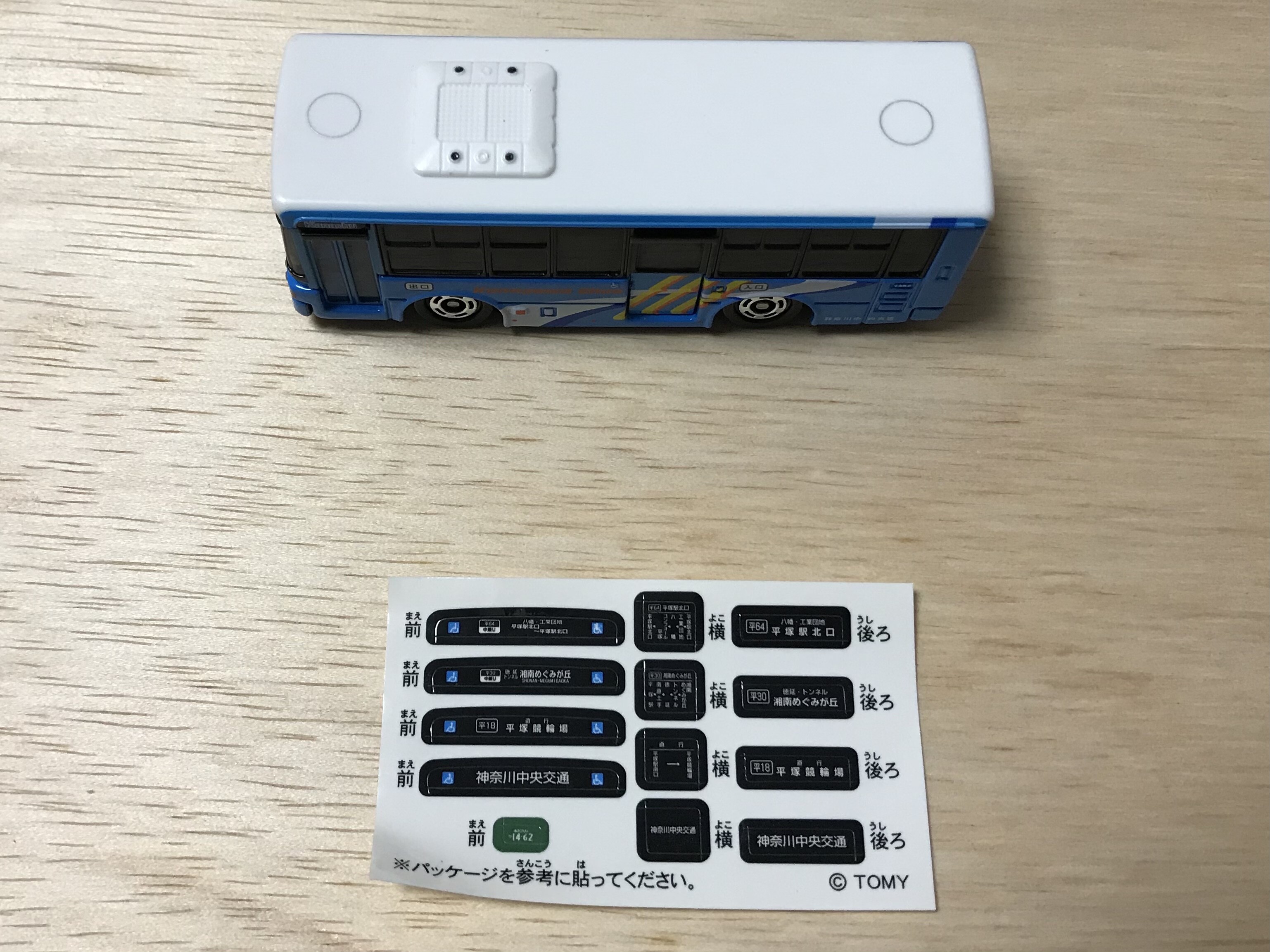 付属のシールで方向幕、ナンバープレートは貼らなければなりません。方向幕は「平塚駅北口〜平塚駅北口」「湘南めぐみが丘」「直行 平塚競輪場」「神奈川中央交通」の4つから選べます。