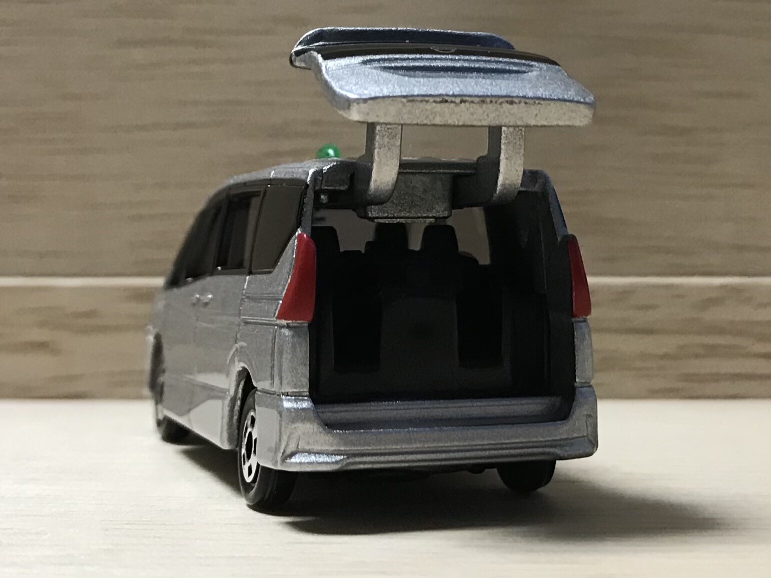 と、真面目なことも言いつつ。シルバーのボディーなので見えにくいですが、ハイウェイスターのエンブレムも再現されていますよ。