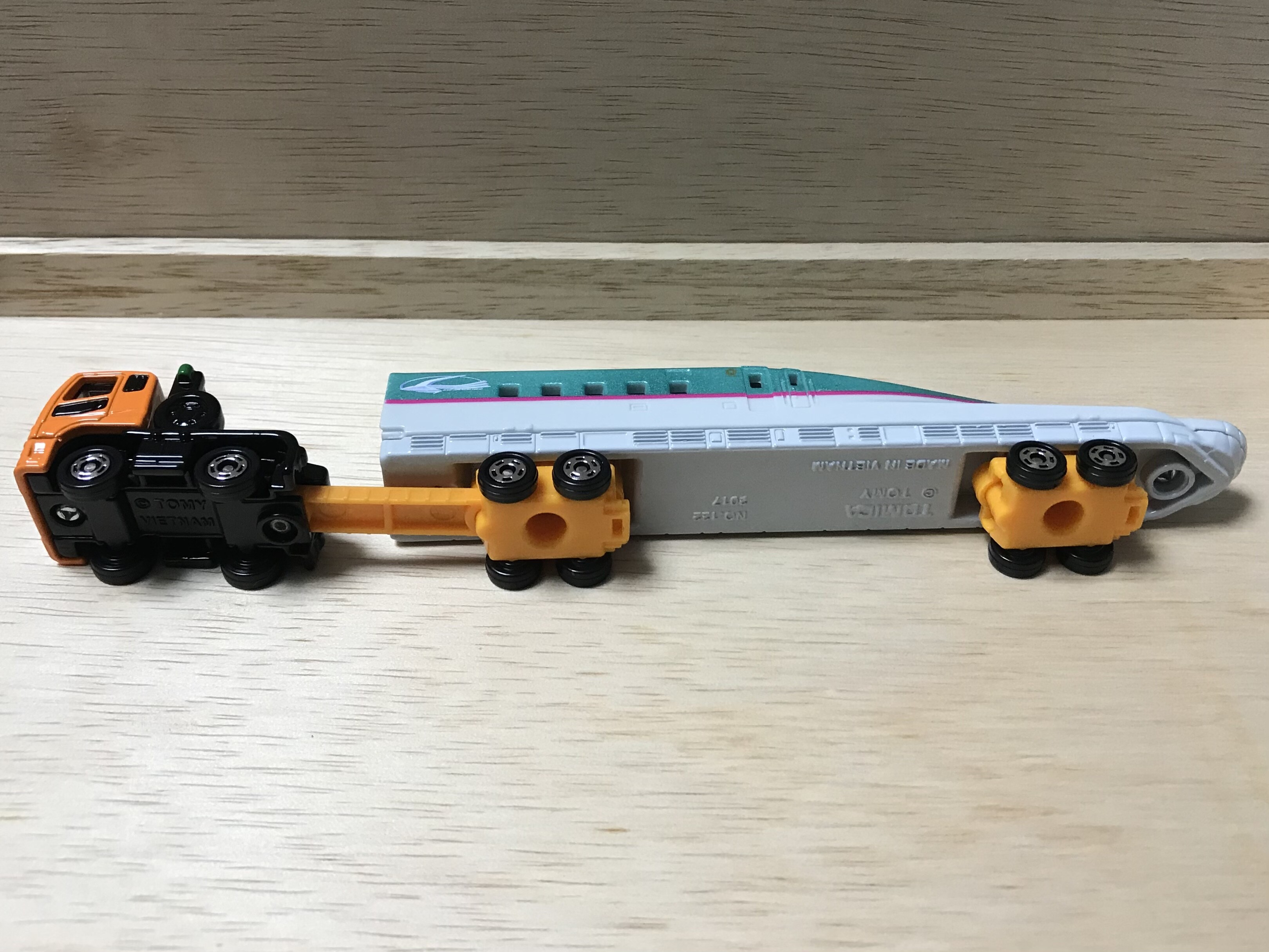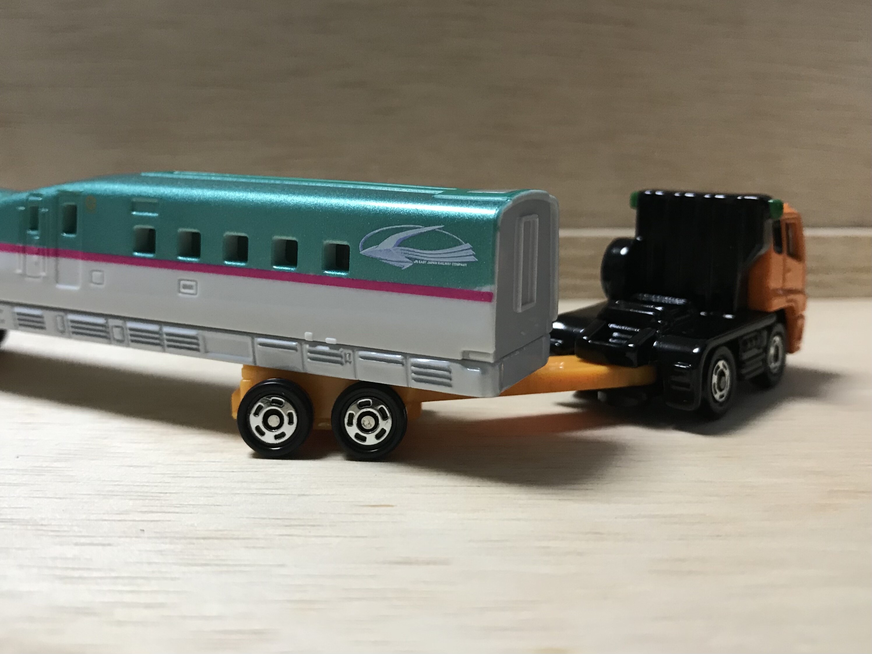 このセットのメインである新幹線トレーラー。ロングトミカのレギュラーラインナップとの違いは、新幹線の帯の色だったり。。。一応、H5系(JR北海道)とE5系(JR東日本)という形式的な違いもありますが、トミカだと正直色違い。トレーラーヘッドは三菱ふそうスーパーグレートで同じ。。。う〜む。