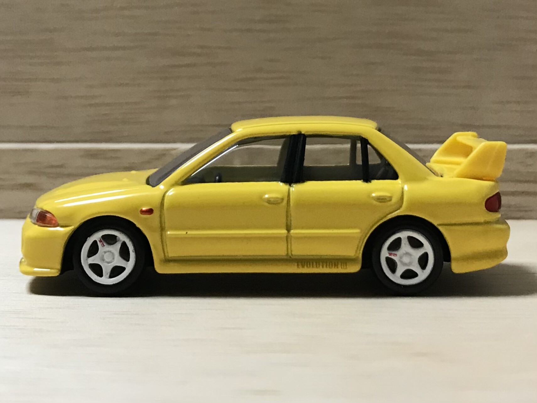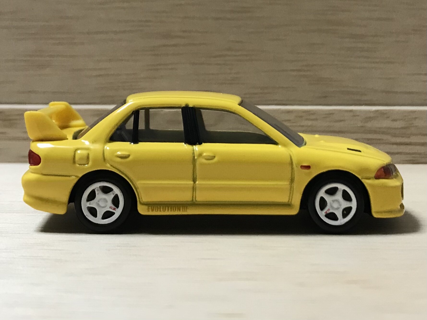 サイドスカートのエンブレムまで再現。ホワイトのホイールとイエローのボディーは、抜群のコンビです。