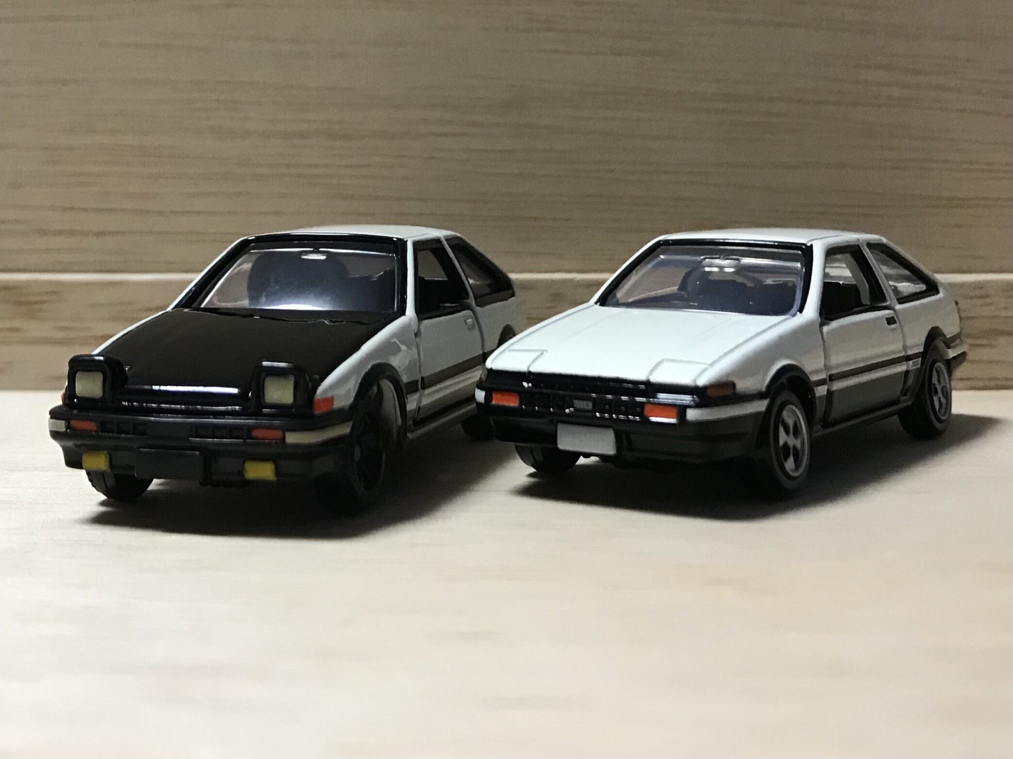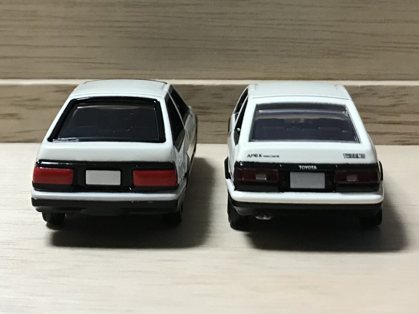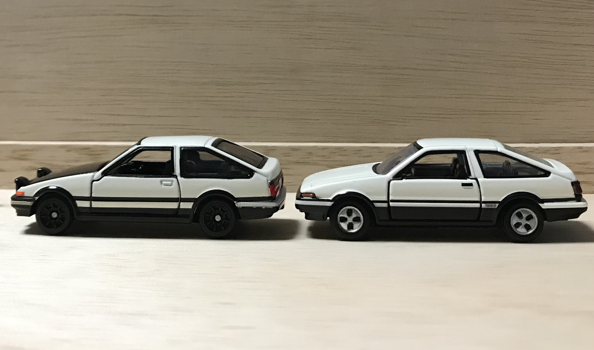 ドリームトミカ No.145 頭文字Dのスプリンタートレノ AE86(左)と比べて。