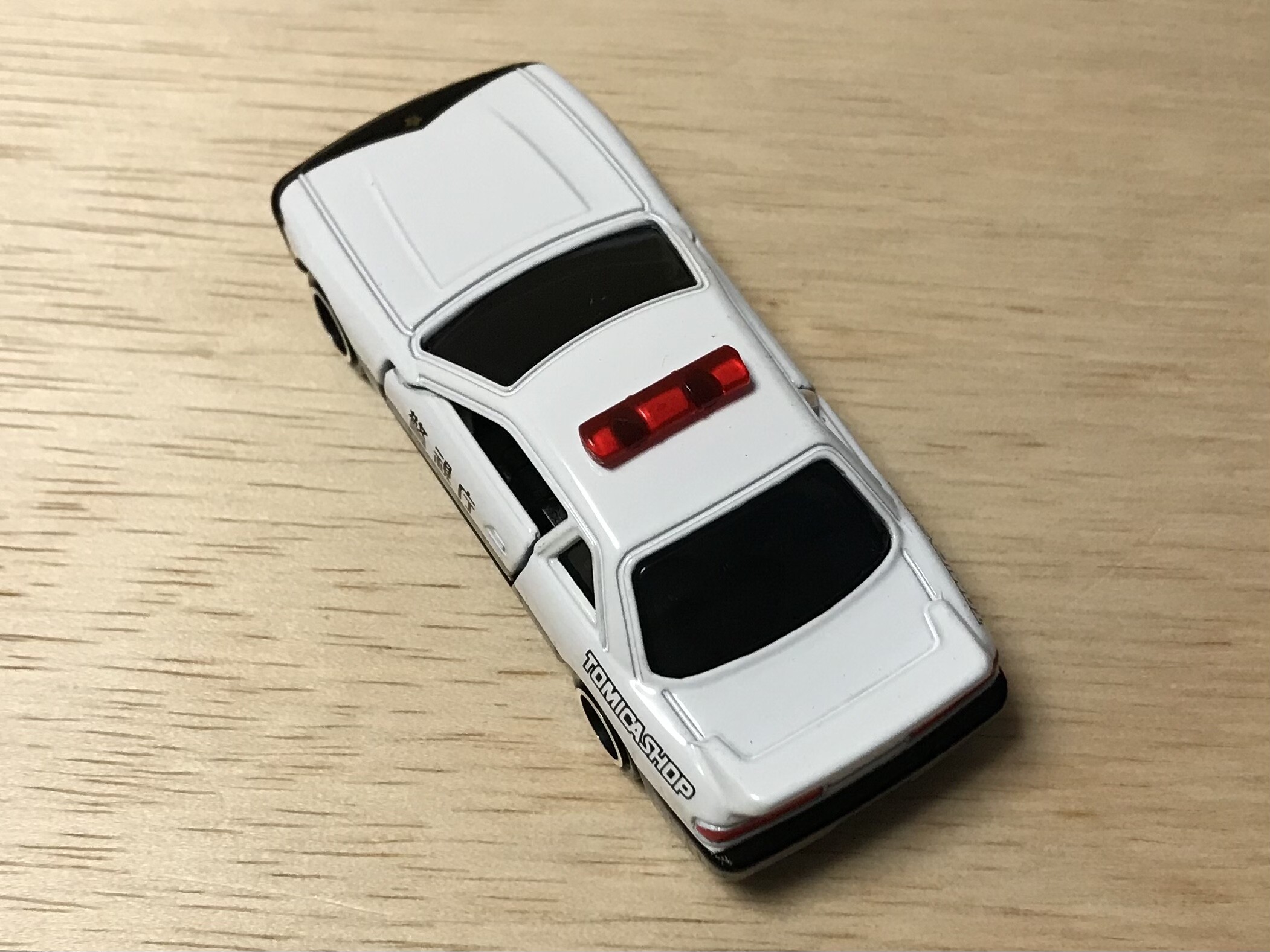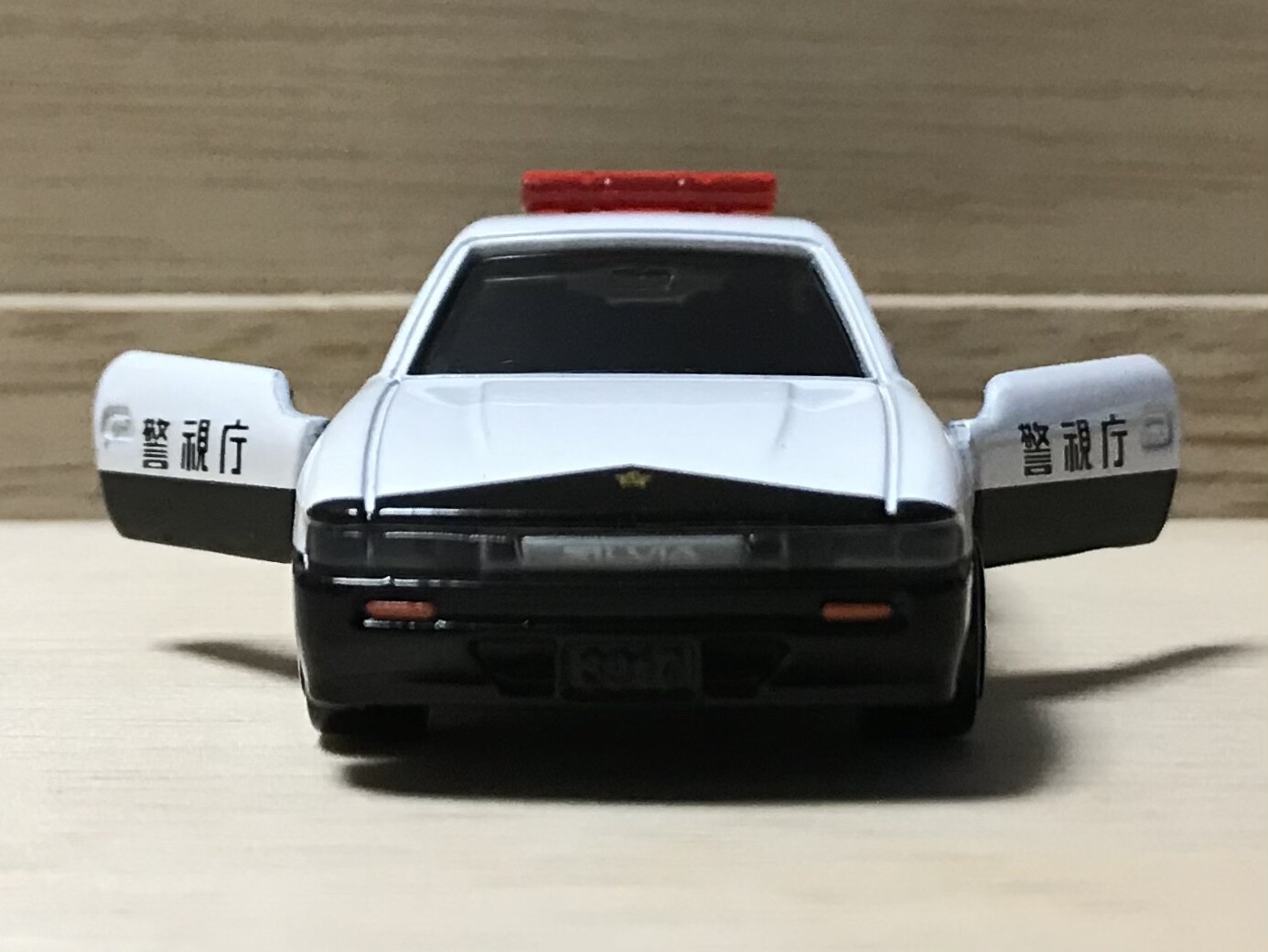 警視庁のフォントは、トミカの「警視庁」表記がまだシールだったときのもの。ドアに収まっているのも特徴です。これが懐かしさの一因でもありそうですね。技術の進歩によって、今は印刷で再現されています。印刷は綺麗さ、リアリティーというメリットがありますが、シール時代は警視庁のほか、「○○警察」というシールも入っていて、警視庁以外の北海道から沖縄の警察も再現できたりしました。右ドアは「警視庁」なのに左ドアは「大阪府警察」リアは「滋賀県警察」などなど、訳もわからないお遊びができたというメリット?もあったり。