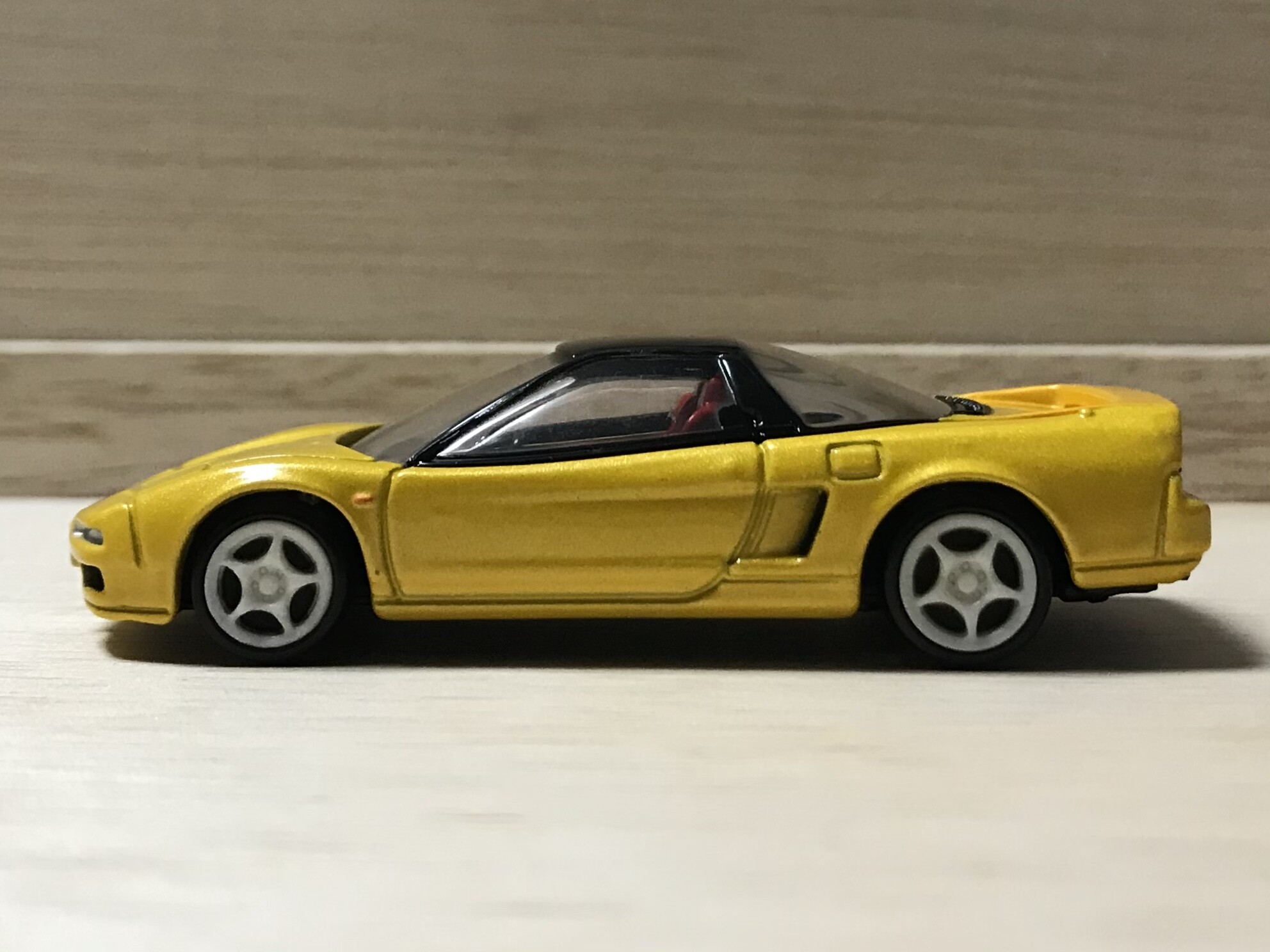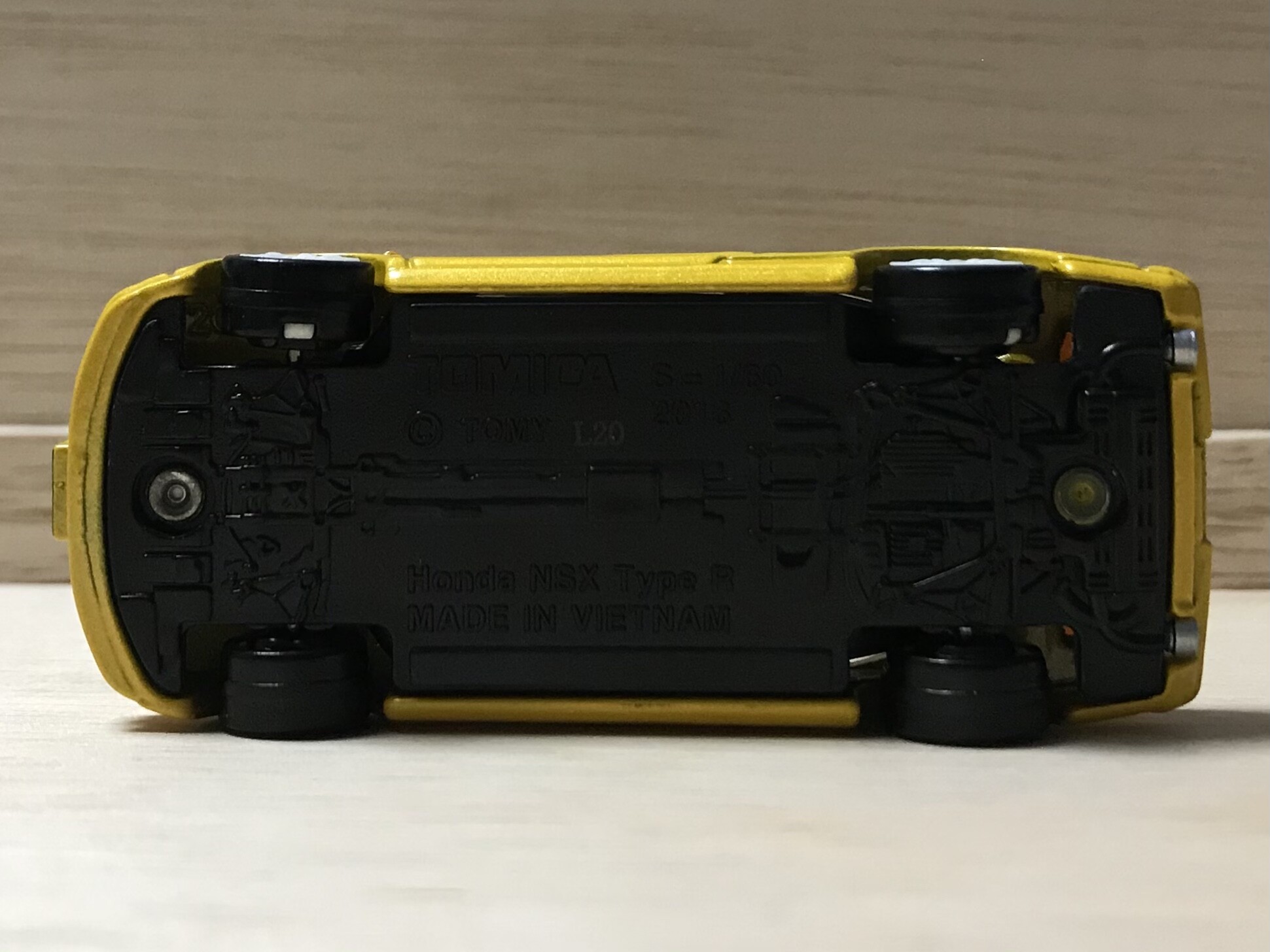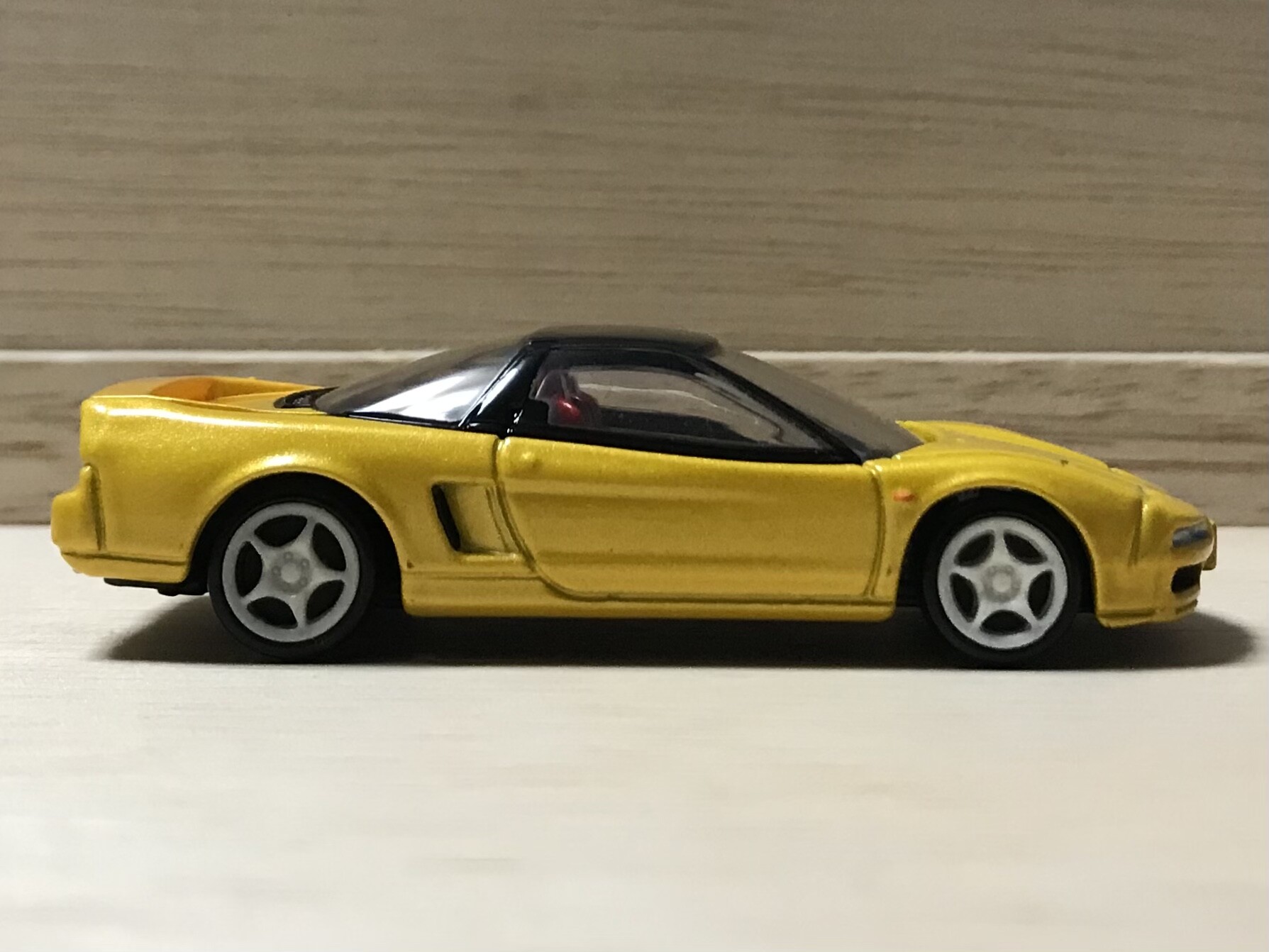 トミカはパッケージのイエローとは結構色味が違います。パッケージに比べて、明るさは暗めで、ラメが入っているものになっています。塗装にも力が入っていますね。