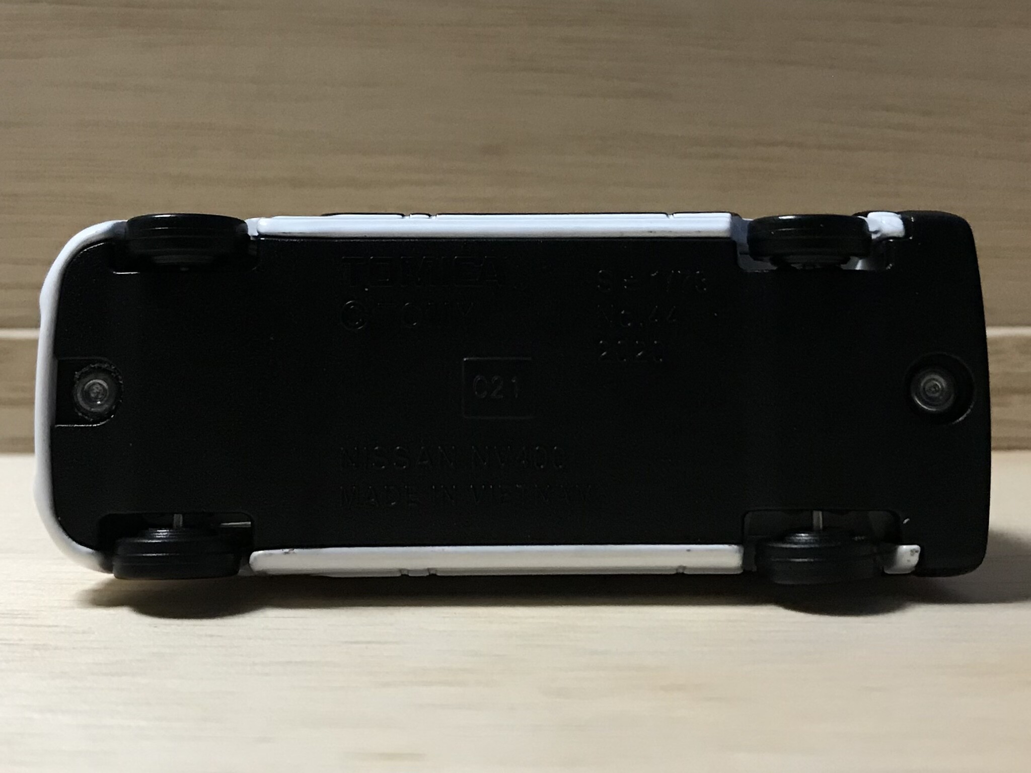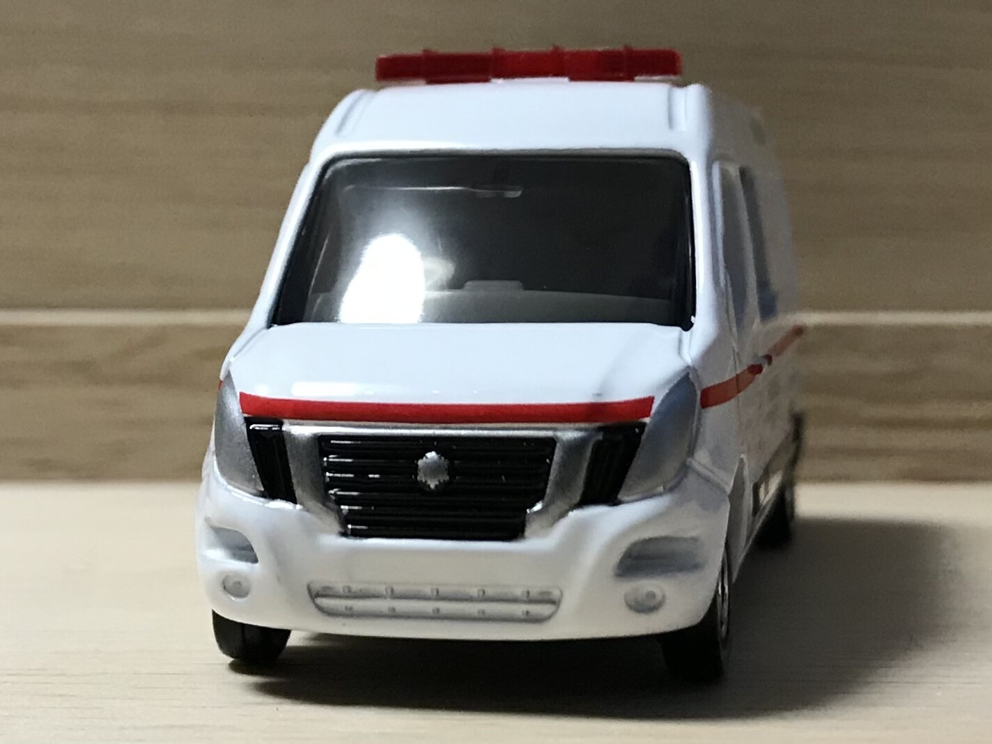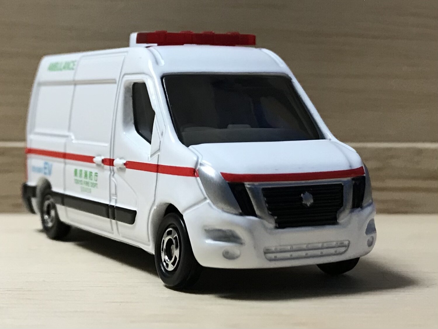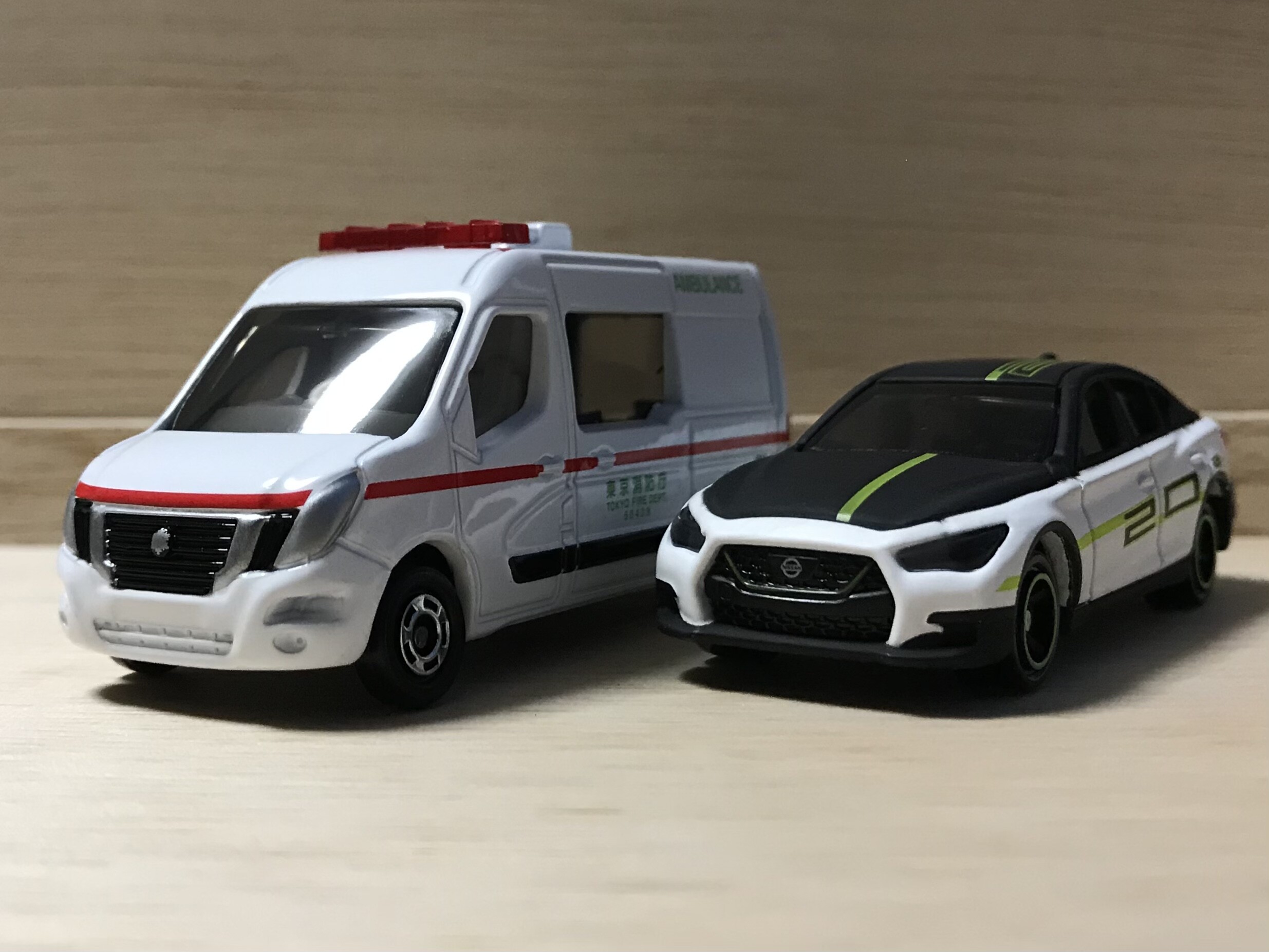 スカイラインと比べるとスケール感はこんな感じ。NV400 EV救急車は思ったよりもずっしりしていて、トミカらしさ全開です。