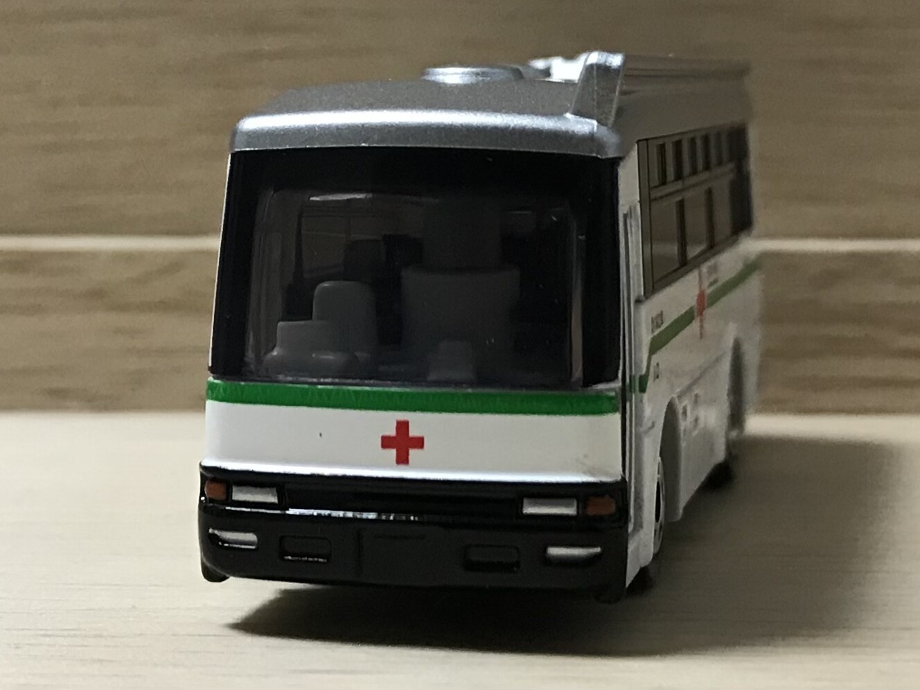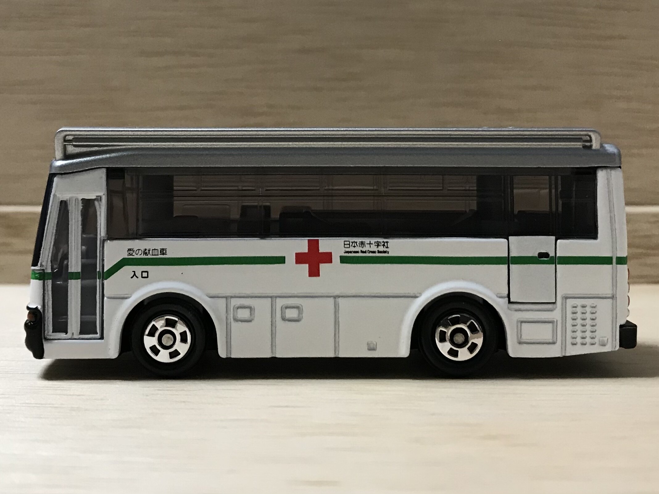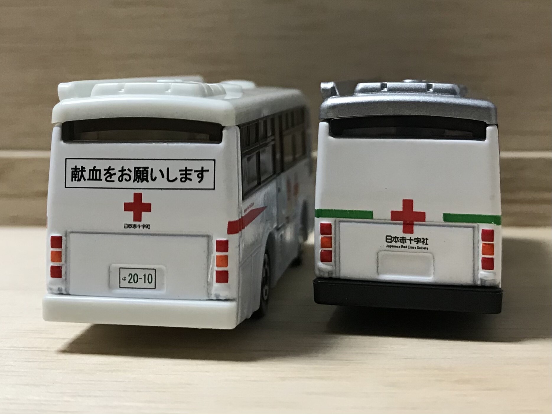 塗装は新しくなった新モデルで、献血バスの旧塗装を再現。新しいのに古いという珍現象です。実車が存在したかは不明。バンパーが黒でないモデルなら兵庫県にいたことが確認されています。