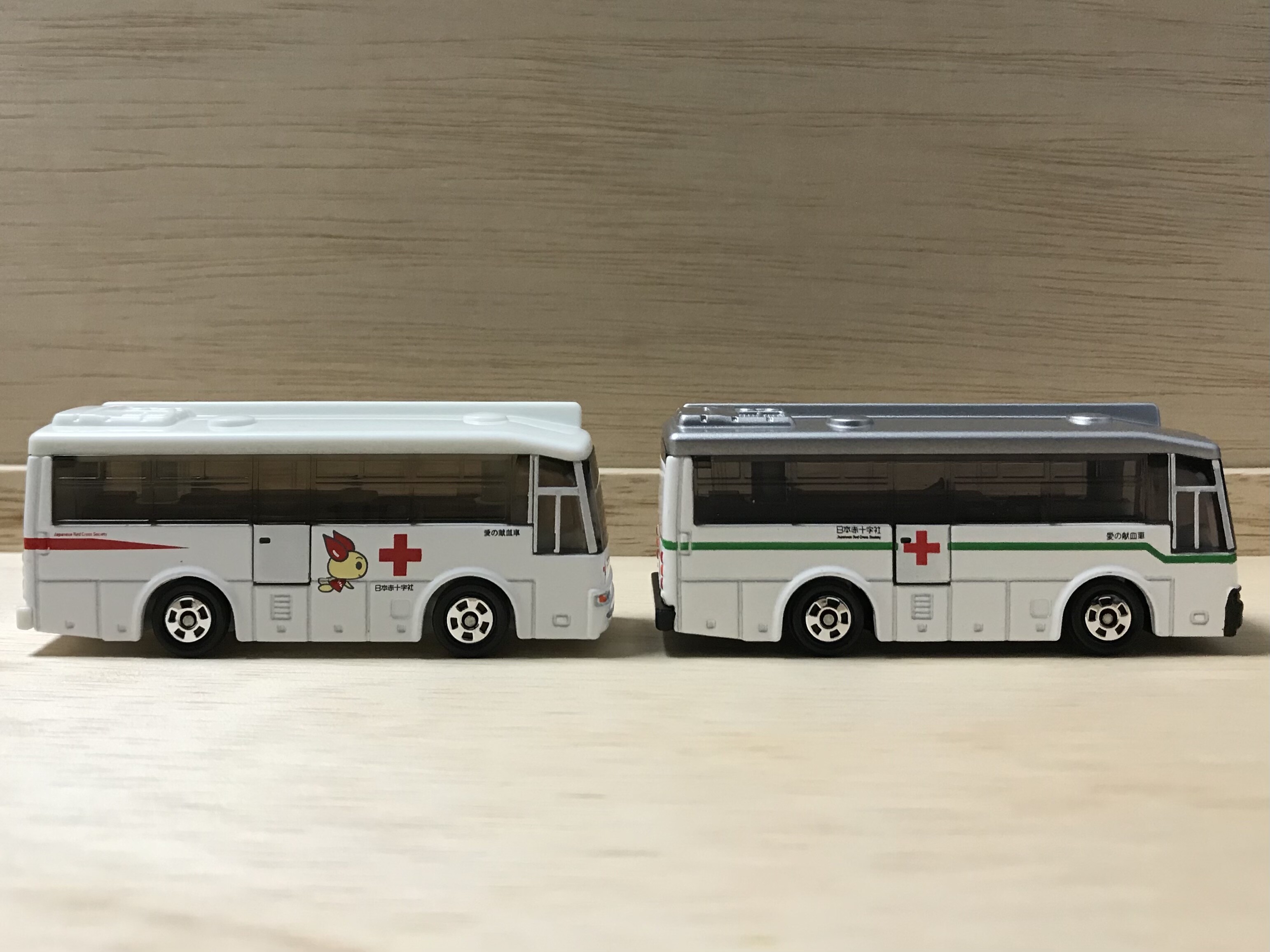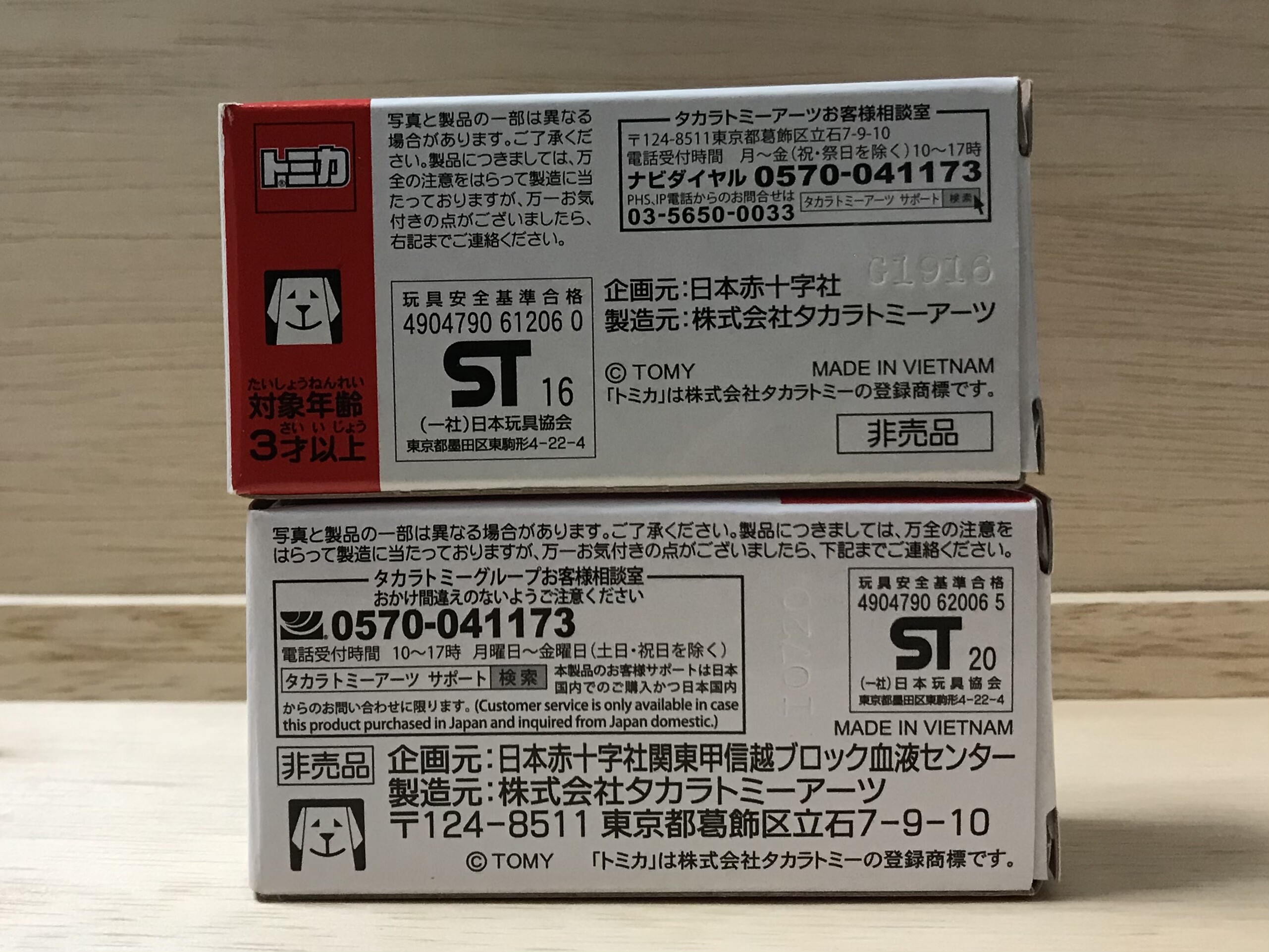 パッケージデザインも大きく違い、新バージョン(下)のデザインは最近の日本赤十字社から登場する非売品トミカに合わせたデザインになっています。