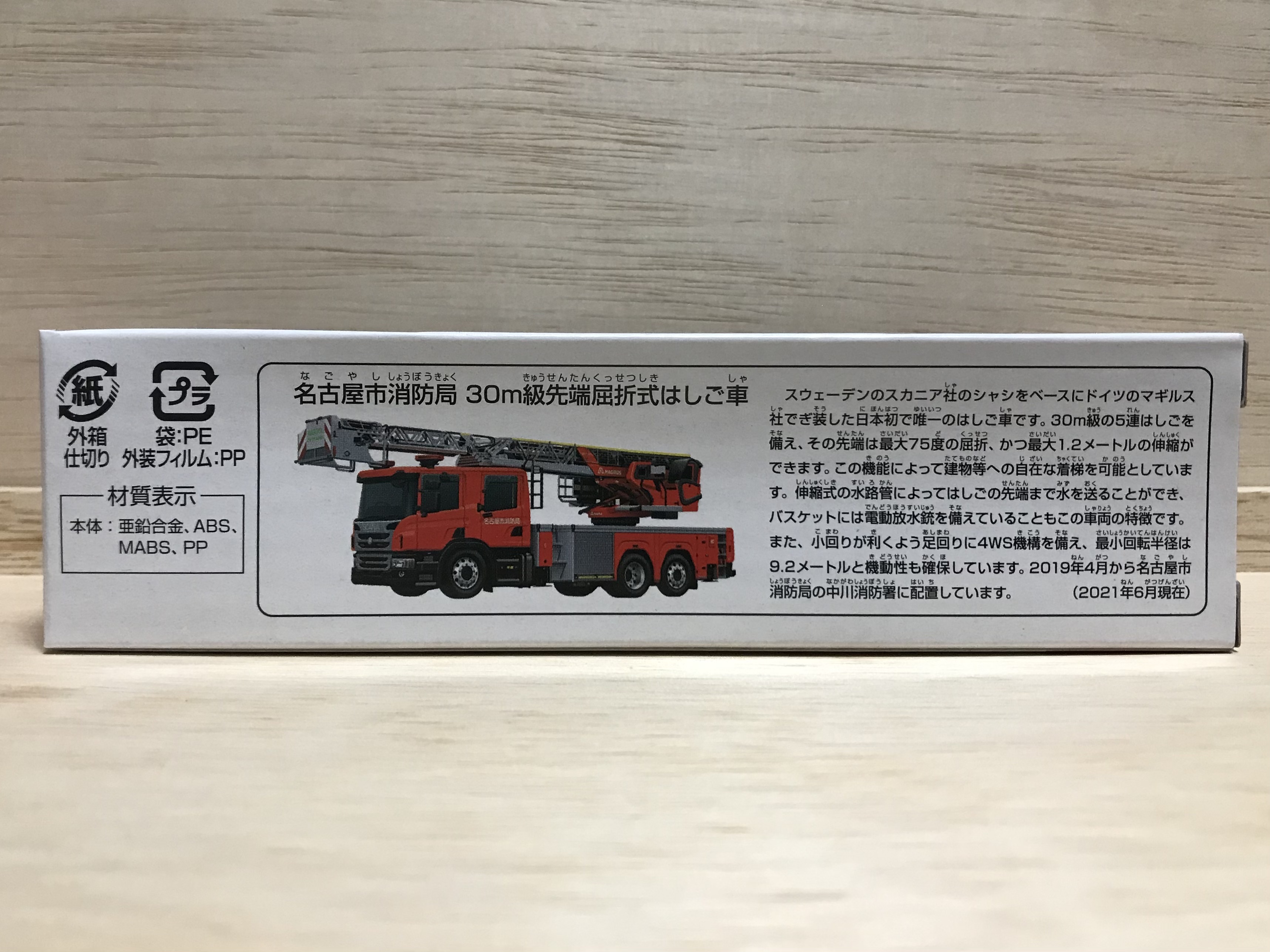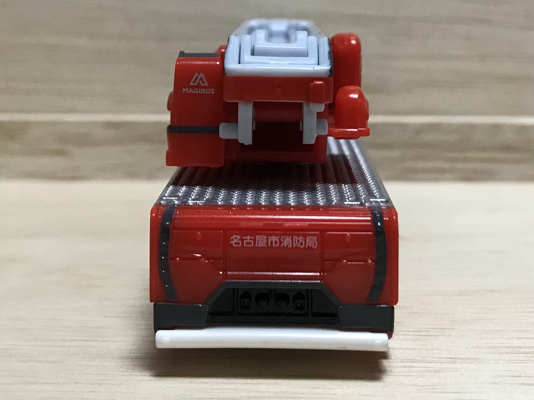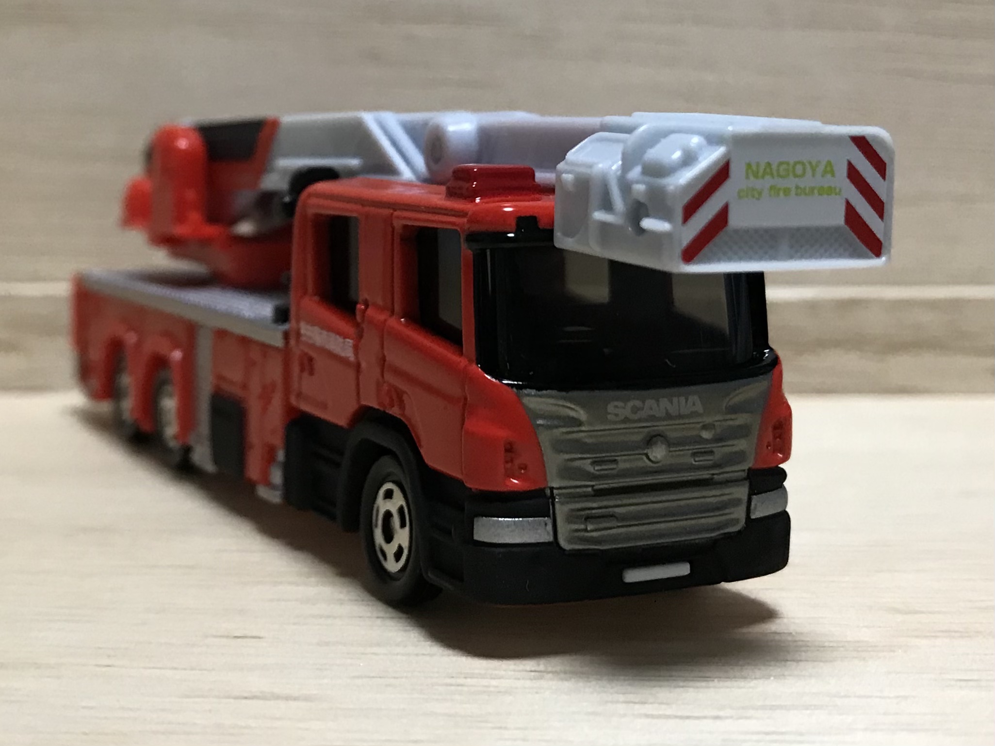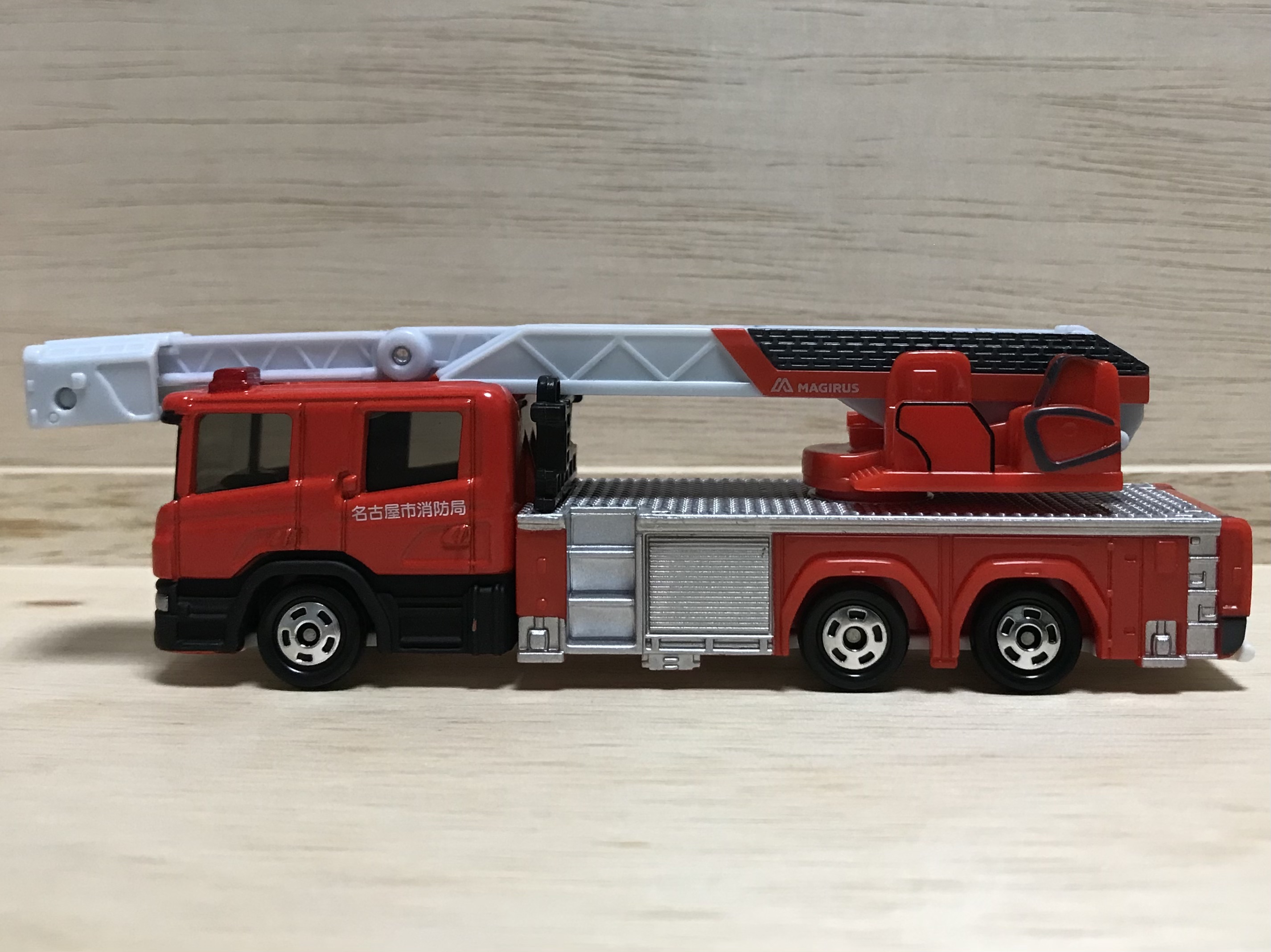 はしごのバケットに「NAGOYA city fire bureau」と印刷されている時点でもうこれはクオリティーが高すぎる1台。スカニアのライセンスで、ドイツの架装メーカーであるマギルスのライセンスもとって、名古屋市消防局の承認も得て、今年No.1のハイコストトミカではないでしょうか。