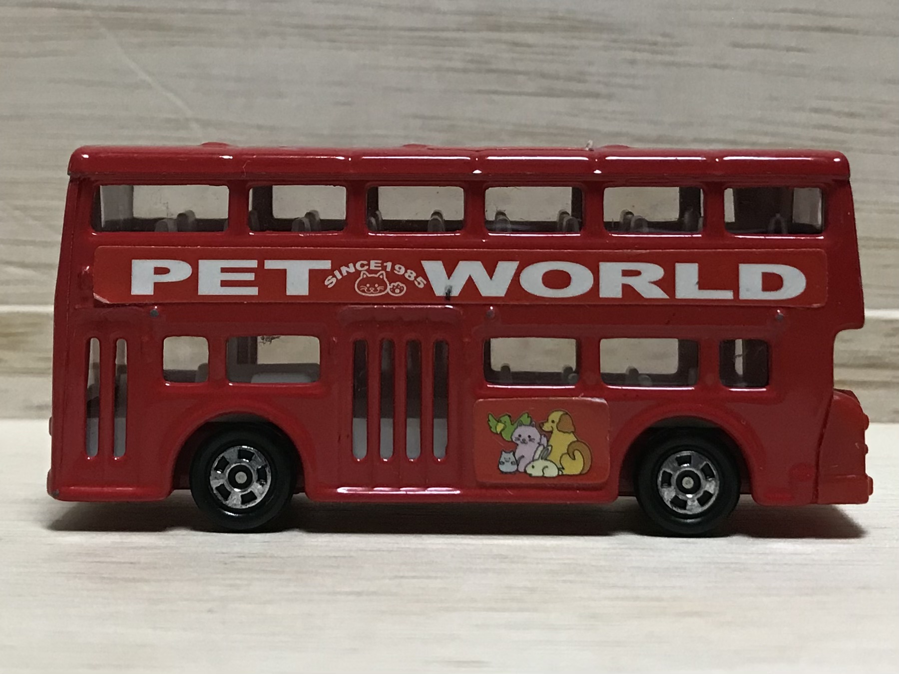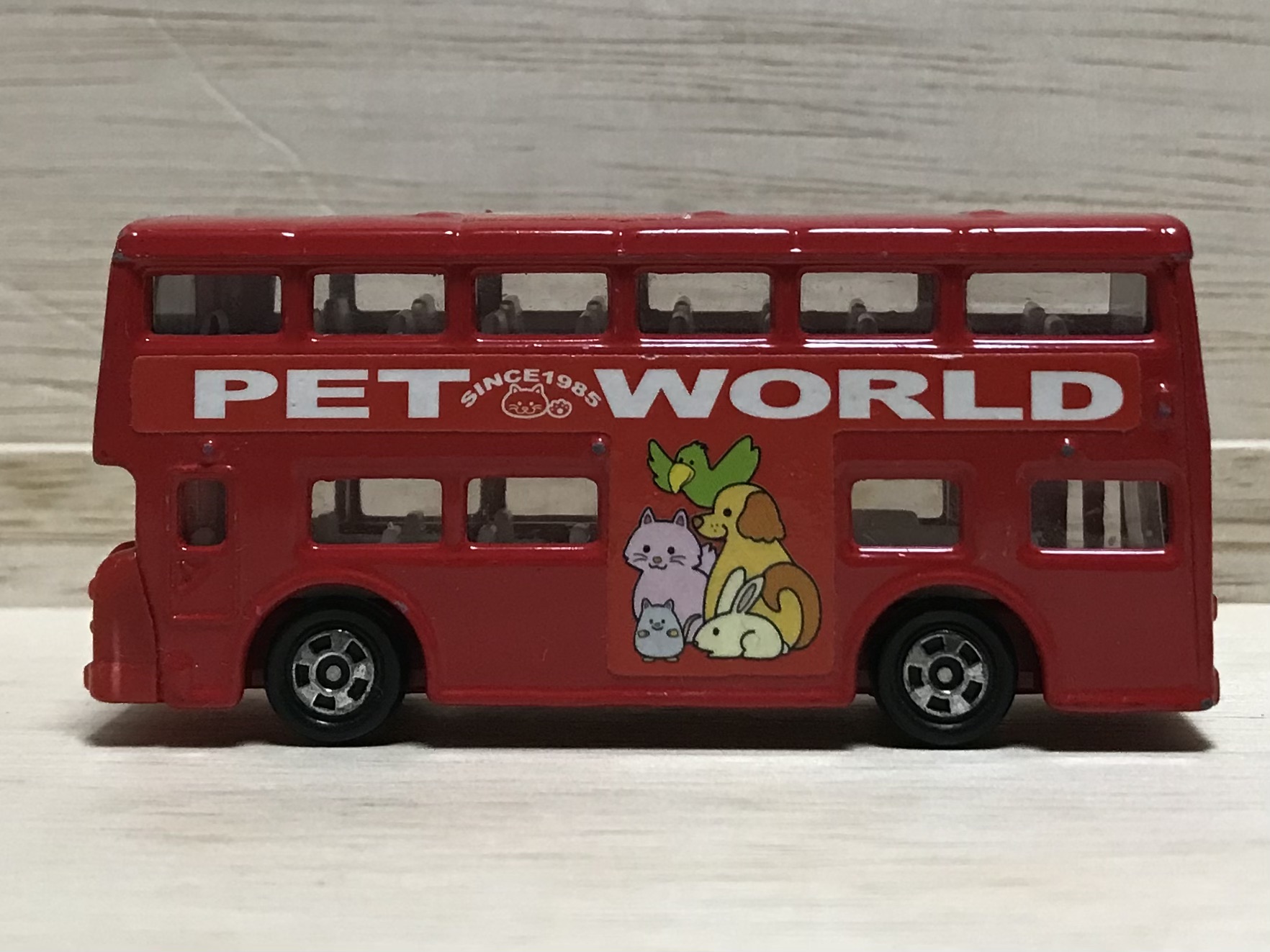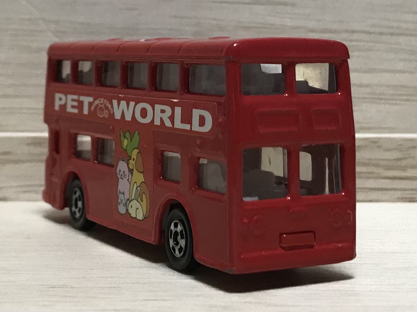 「PET WORLD SINCE 1985」これはトミカ史に残る最大の謎で、モデルとなった車両は存在しないようです。ロンドンバスっぽさのイメージなのでしょうね。